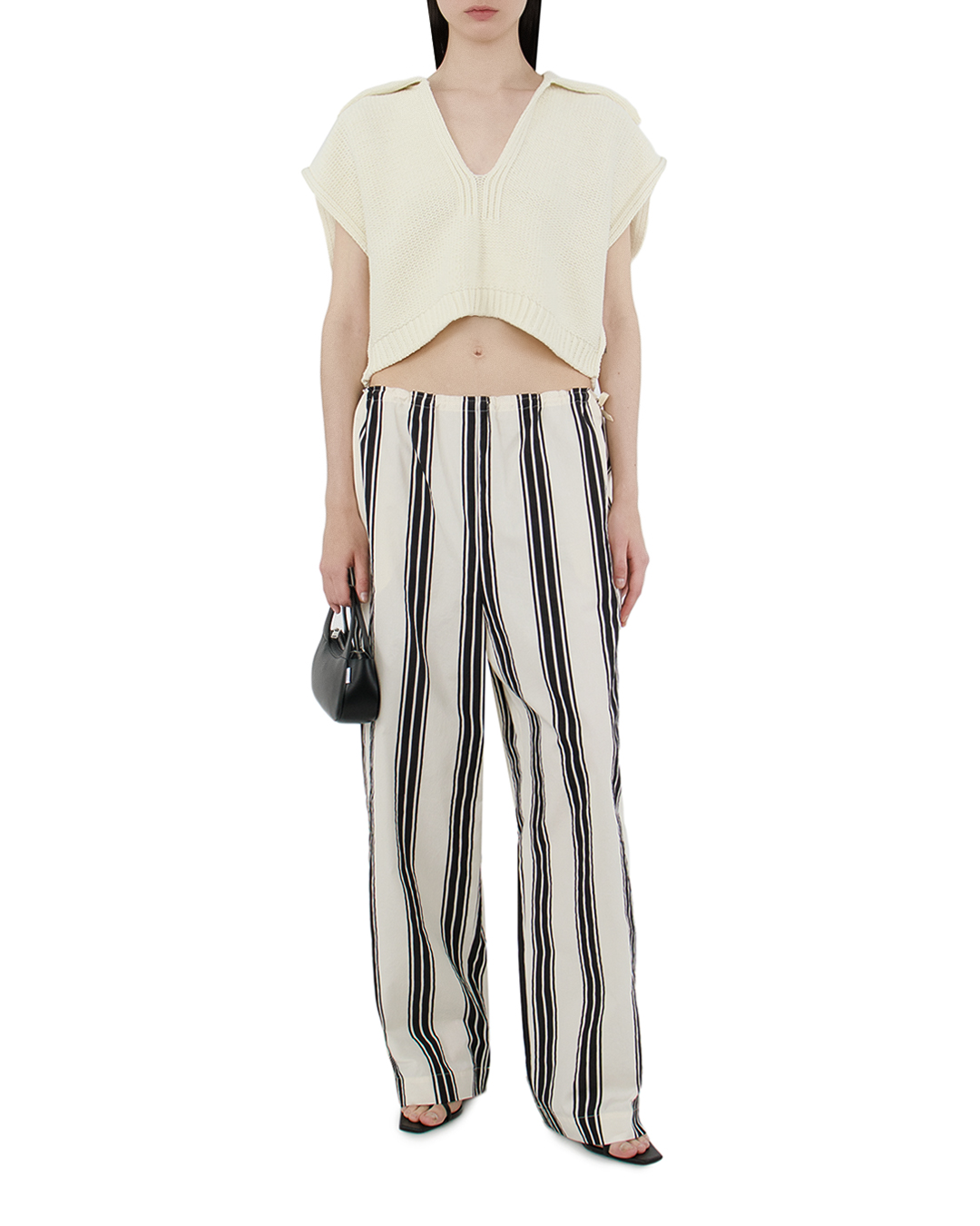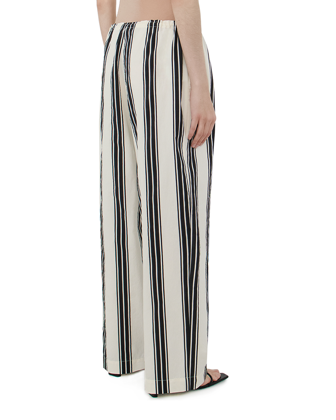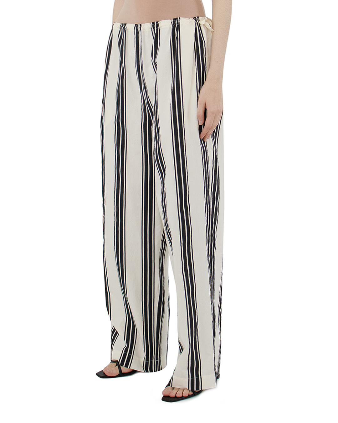 Эти брюки — истинное воплощение смелого стилевого решения и комфортной элегантности. Вертикальные полосы создают визуальный эффект удлинения, придавая фигуре стройность и динамику, что делает их подходящими для любого типа телосложения. Свободный крой обеспечивает лёгкость движений и непринуждённый комфорт, что идеально подходит для повседневного гардероба. Эластичная талия, дополненная завязками, предлагает регулируемую посадку, добавляя функциональности и удобства. Открытые швы и мягкая ткань создают расслабленный силуэт, подходящий как для городской прогулки, так и для пляжного отдыха. Эти брюки легко сочетаются с базовыми топами или более выразительными верхами, создавая универсальные и стильные ансамбли.
