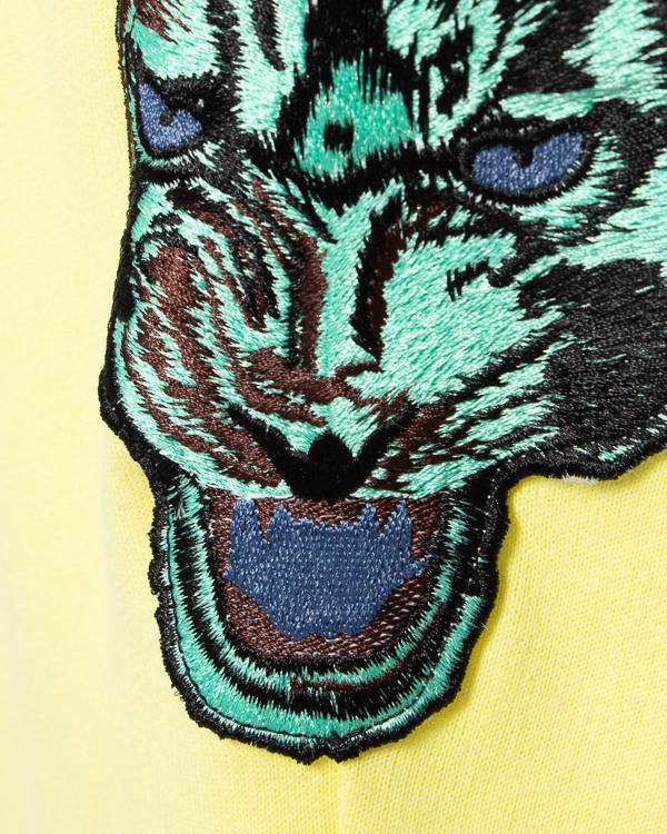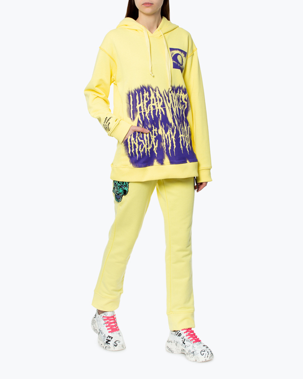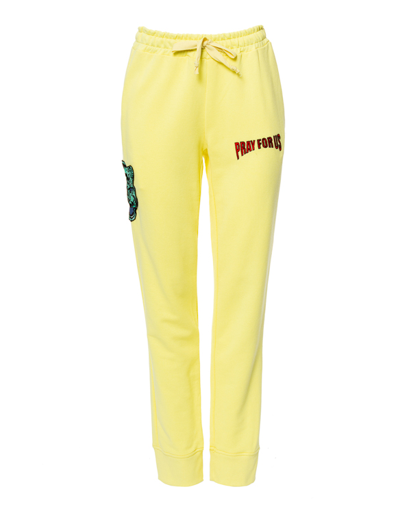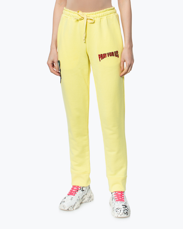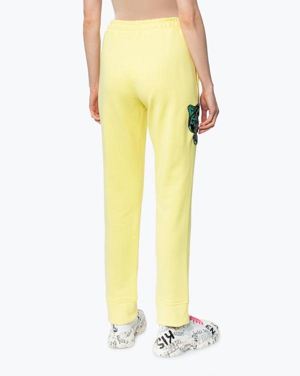 Брюки из органического длинноволокнистого хлопка желтого оттенка с вышивкой. Модель прямого силуэта в спортивном стиле с эластичной линией пояса с завязками.
