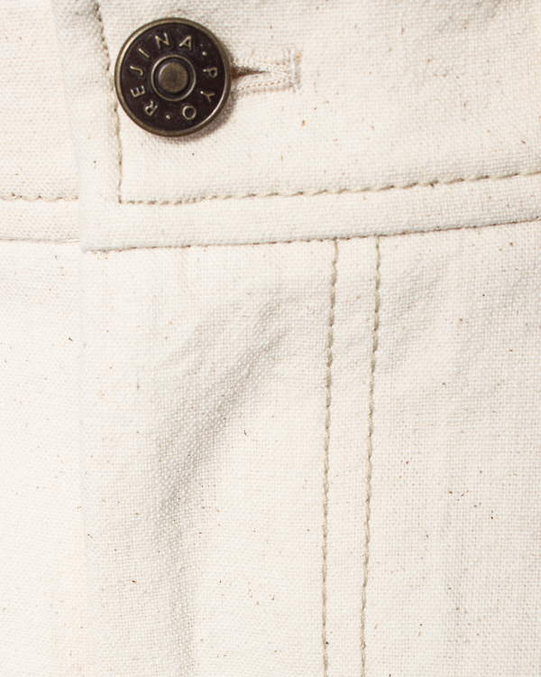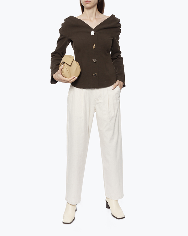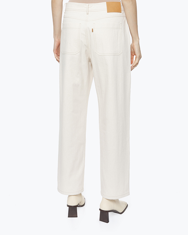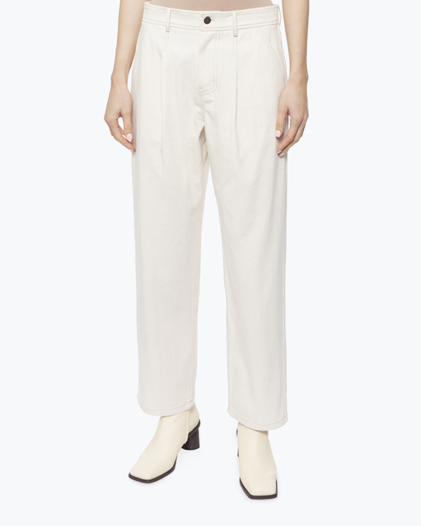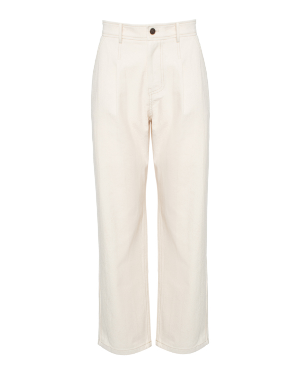 Брюки из мешковатого плотного хлопка бежевого оттенка. Модель прямого кроя с комфортной посадкой. Застежка на молнию и пуговицу, по бокам два кармана.