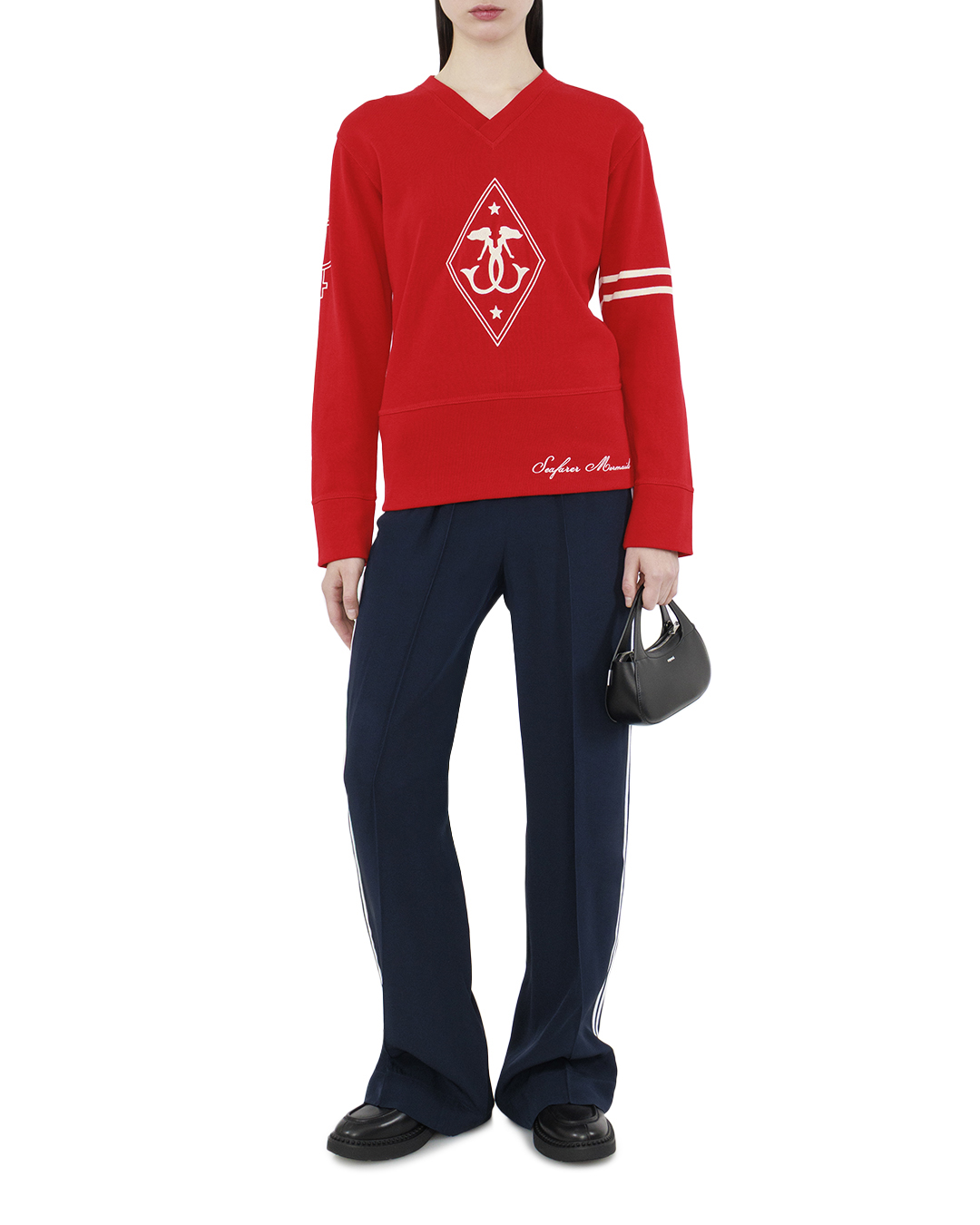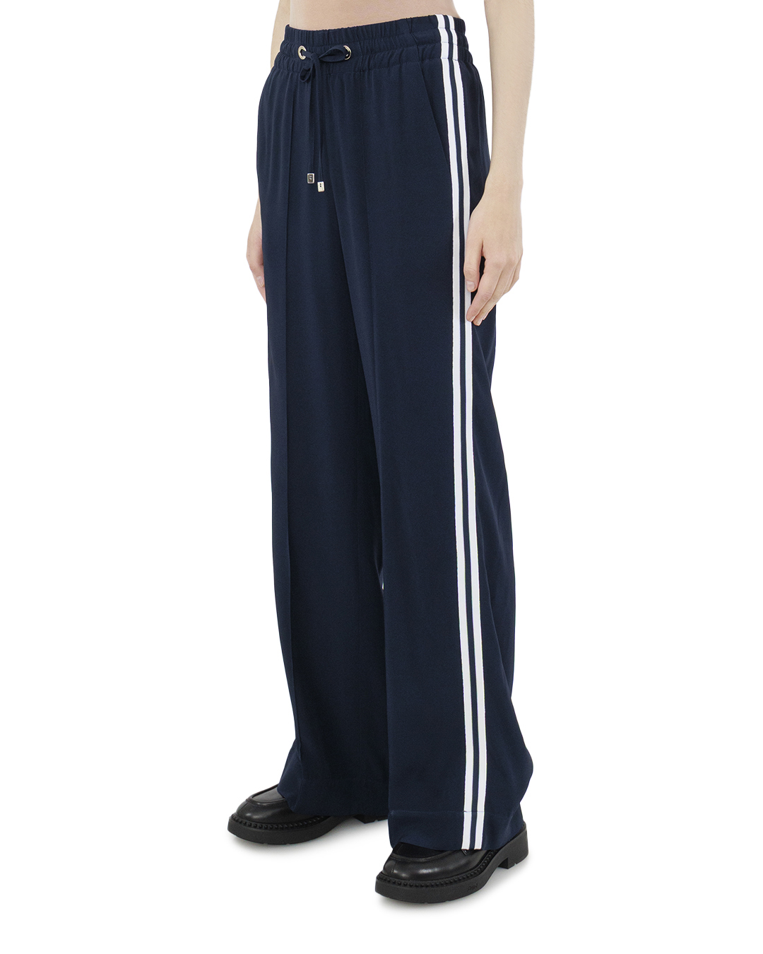 Эти брюки в черном оттенке выполнены из легкой и дышащей ткани, что обеспечивает комфорт и свободу движений. Крой брюк — широкий и свободный, создающий эффект «палаццо», который отлично подходит как для повседневного ношения, так и для более формальных образов. Пояс оформлен эластичной лентой с регулируемым шнурком, что обеспечивает идеальную посадку на талии и позволяет адаптировать брюки под различные фигуры. Стильные металлические фурнитуры придают изделию дополнительную элегантность и утонченность. Отделка брюк включает две контрастные полосы по бокам, выполненные в белом цвете, которые визуально удлиняют ноги и подчеркивают динамичность силуэта. Практичные боковые карманы с запечатанными молниями добавляют функциональности, не нарушая при этом чистоту линий. Брюки великолепно сочетаются с лаконичными топами или спортивными свитерами, создавая стильный и гармоничный образ. Яркий цвет и продуманные детали делают их центральным элементом любого аутфита, позволяя выразить индивидуальность и стиль.