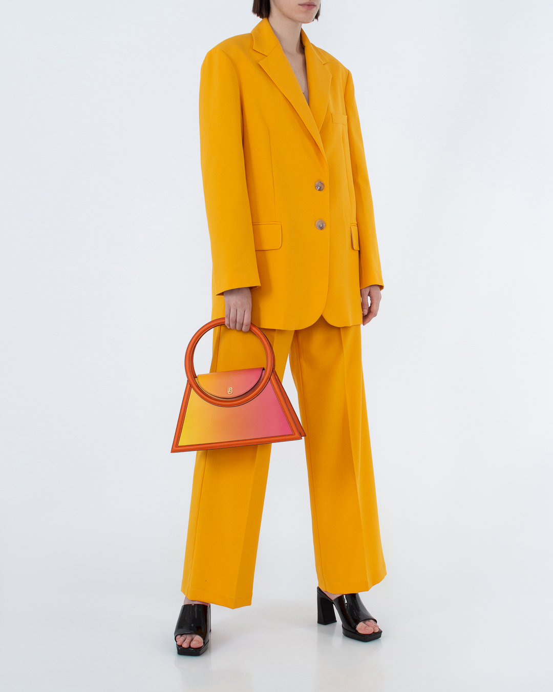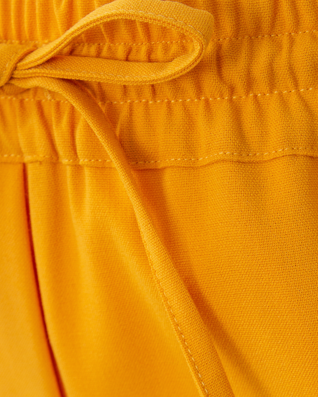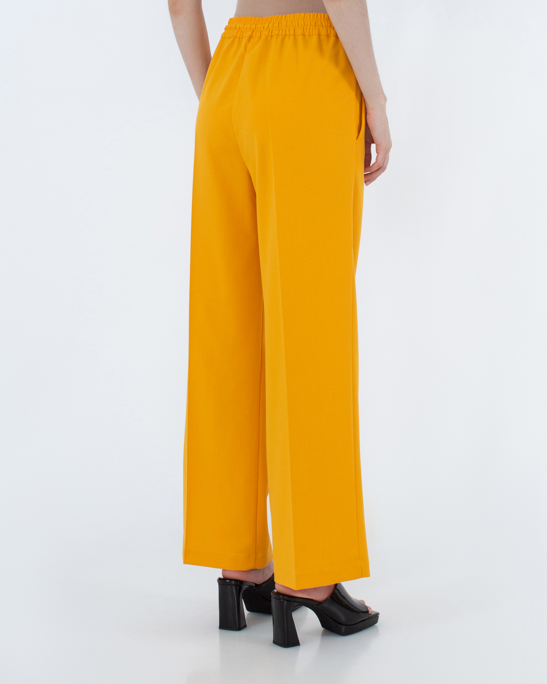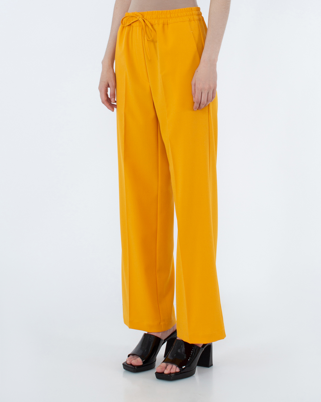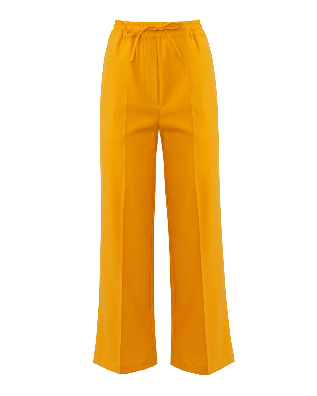 Брюки Erika Cavallini выполнены из крепа яркого оранжевого оттенка. Модель прямого свободного силуэта со стрелками. Высокая посадка на талии и эластичная линия пояса с завязками.