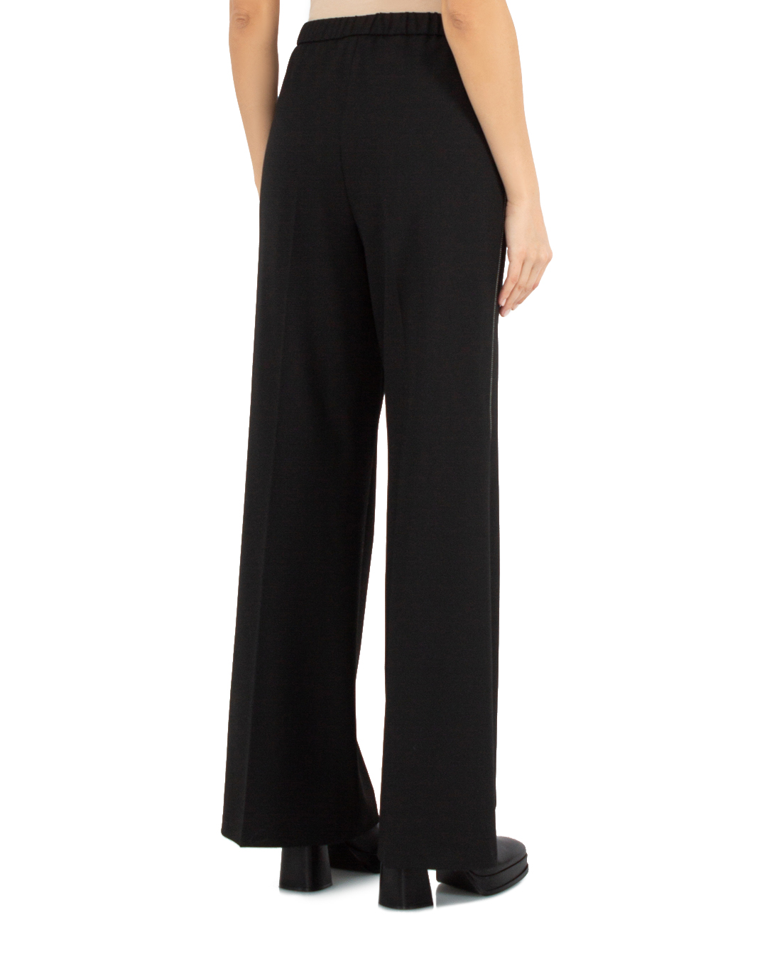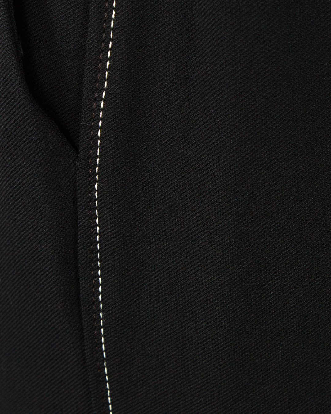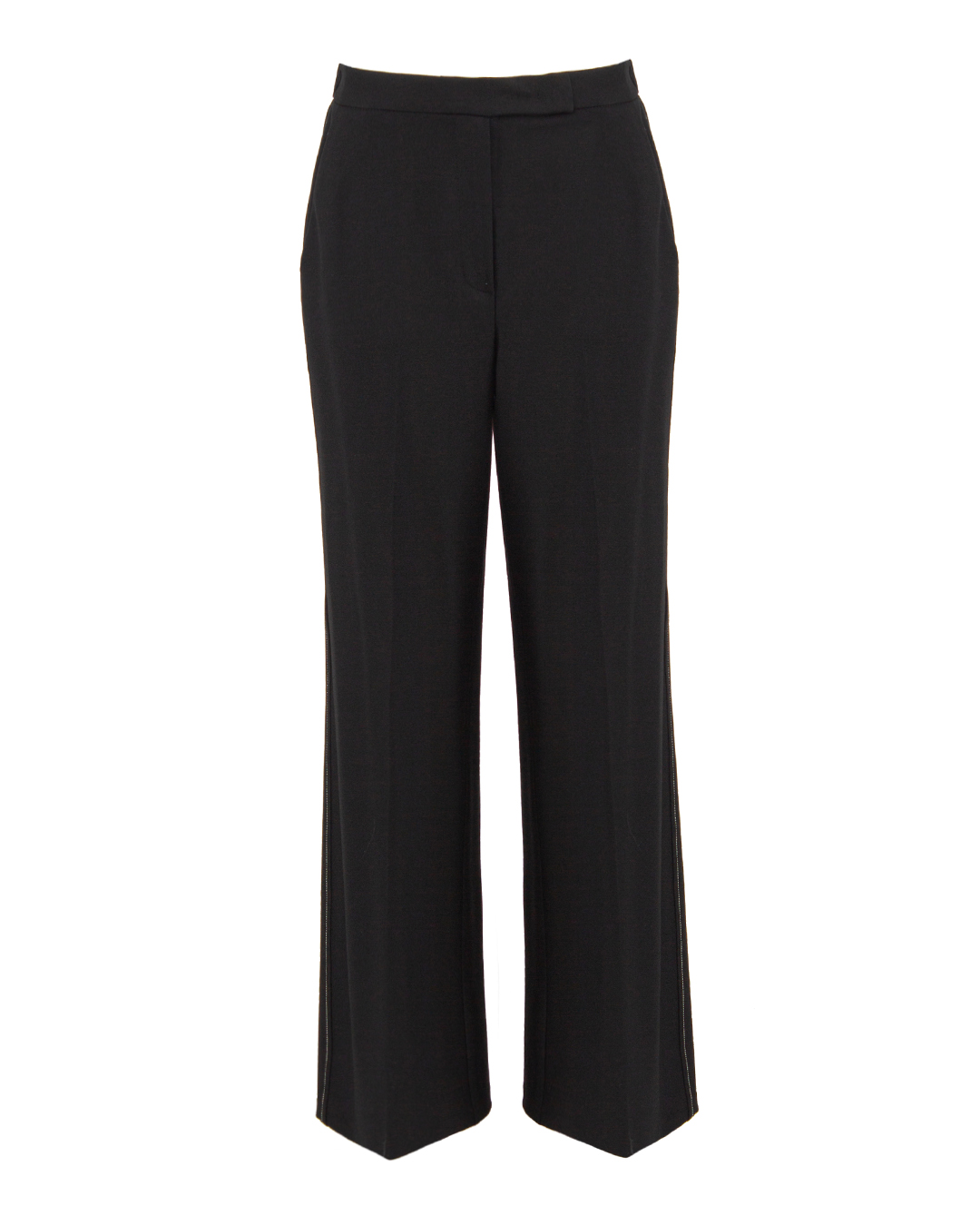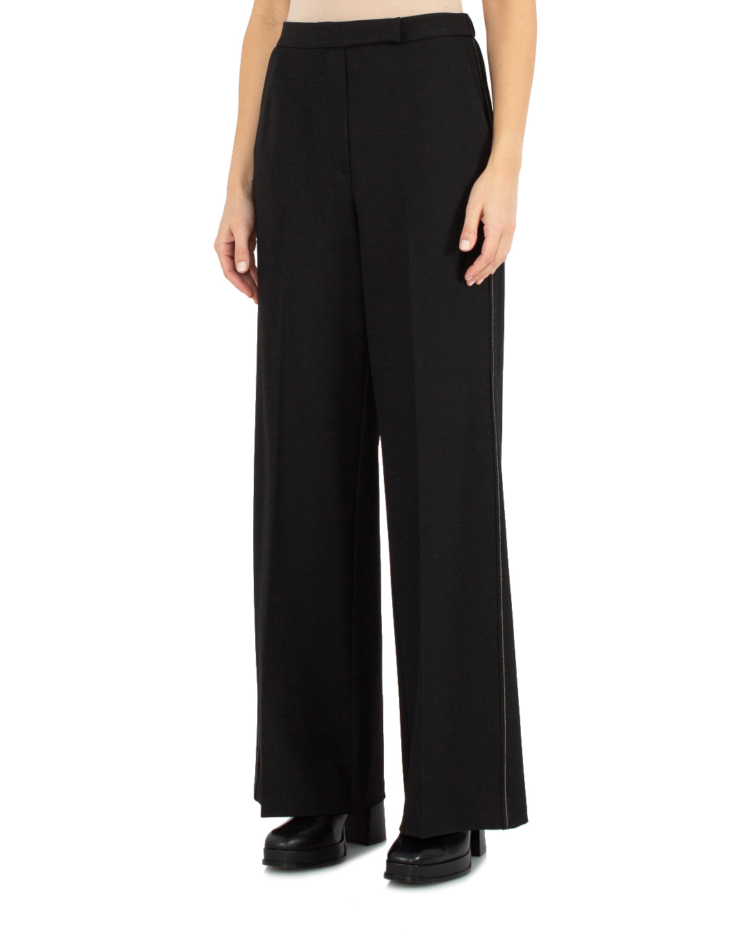 Брюки Sfizio из крепа черного цвета с контрастной строчкой. Модель прямого силуэта с широкими брючинами со стрелками.