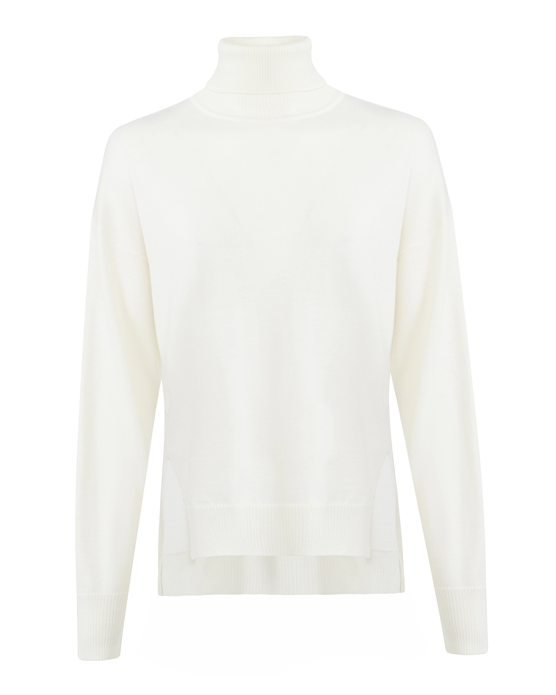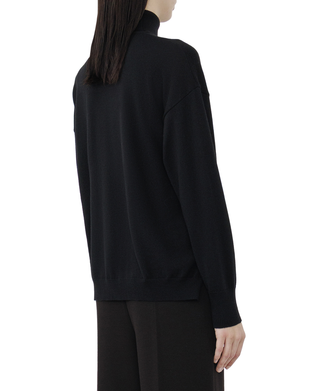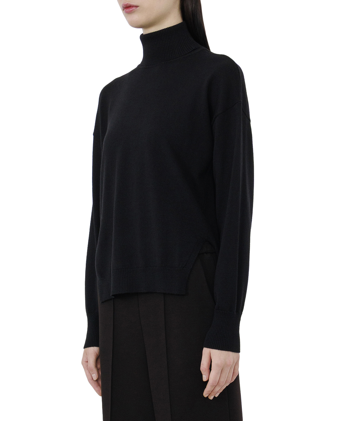 Этот джемпер олицетворяет утонченную минималистичную эстетику, благодаря чему он становится базовым элементом любого стильного гардероба. Выполненный в базовом черном цвете, он привносит универсальность и изящество в любой образ. Воротник-гольф утончённо удлиняет линию шеи, защищая от прохлады и добавляя нотку элегантности. Прямой крой создаёт свободный силуэт, который подходит для разнообразных комплектаций и стилей. Манжеты, подол и воротник отделаны эластичной вязкой, которая придаёт структуру и держит форму, обеспечивая долговечность изделия. Боковые разрезы добавляют динамики и легкости, позволив джемперу красиво драпироваться на фигуре. Этот джемпер — воплощение функциональности и стиля, идеально комбинирующийся как с классическими брюками, так и с джинсами для создания непринуждённого повседневного образа.
