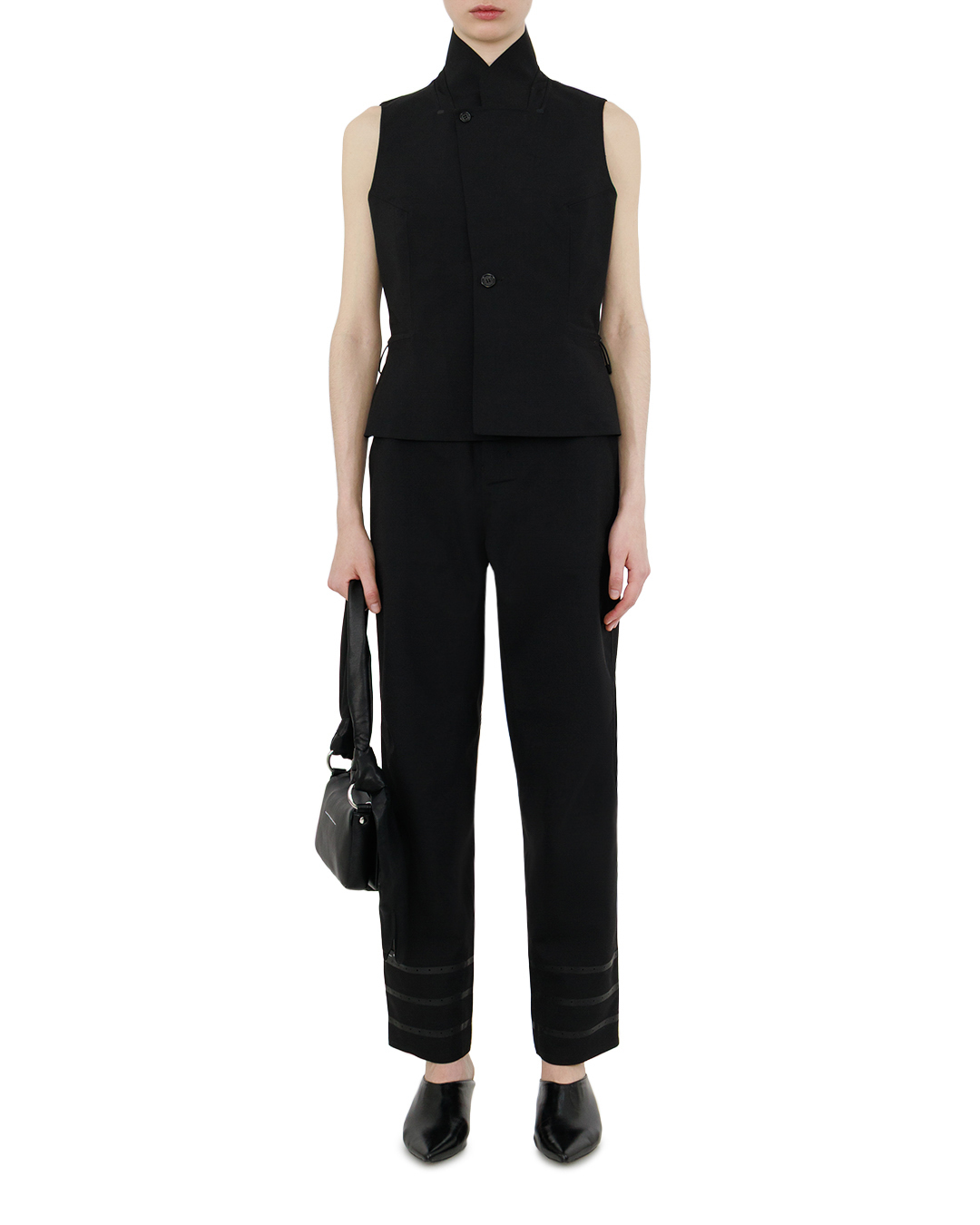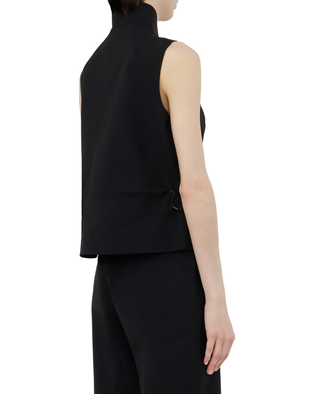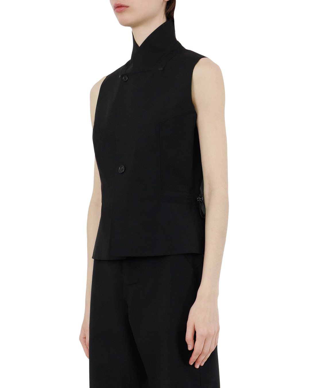 Чёрный жилет с высоким воротником-стойкой воплощает строгую элегантность. Укороченный крой с лёгким расширением к низу создаёт выразительный силуэт, подчёркивая талию. Лаконичная застёжка на две пуговицы добавляет сдержанности, а боковые карманы с молниями вносят практичную деталь, не нарушая минимализм модели. Чистые линии и аккуратная отстрочка подчёркивают безупречный крой — жилет станет выразительным акцентом в деловом или вечернем образе.