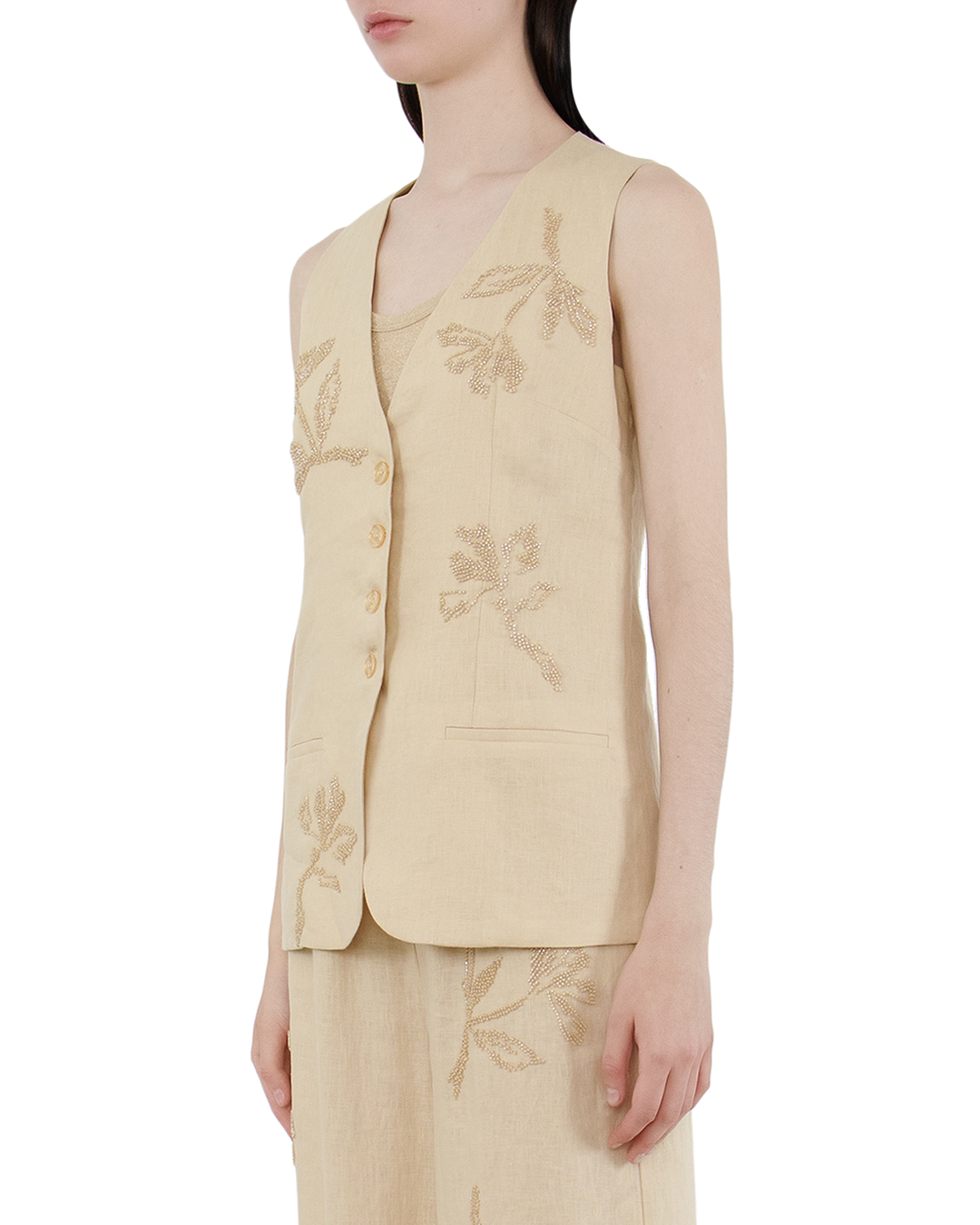 Этот жилет — воплощение утонченной легкости и изящного вкуса. Светлый, теплый бежевый оттенок создает эффект естественности и мягкости, идеально подходя для весенне-летней палитры. Легкая ткань дарит максимальный комфорт и непринужденную свежесть в носке. Великолепный акцент сделан на декоре: затейливые флоральные узоры из тонкого шитья придают изделию романтичность и художественную выразительность. Эти детали подчеркивают индивидуальность и стиль владельца, создавая харизматичный акцент. V-образный вырез стройнит фигуру и подчеркивает линию шеи, придавая образу особую элегантность. Ряд аккуратных пуговиц добавляет классический штрих и соединяет детали жилета в гармоничное целое. Карманы, тщательно проработанные в крое, добавляют практичность без ущерба для эстетики. Этот жилет станет идеальным дополнением как к классическим ансамблям с брюками или юбками, так и к более casual образам, включая джинсы или шорты. Он дарит возможность выразить индивидуальность, оставаясь при этом в рамках утонченного стиля.