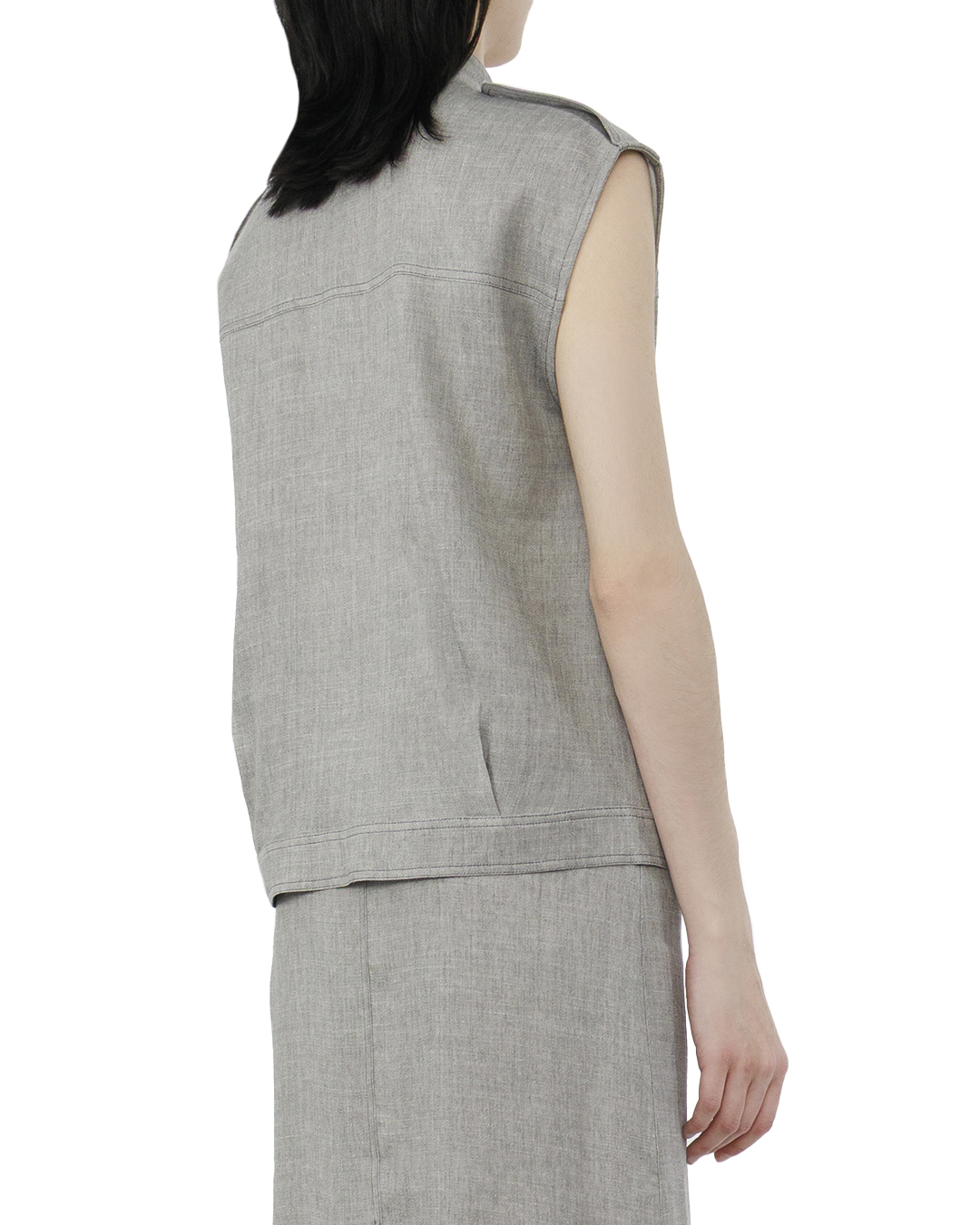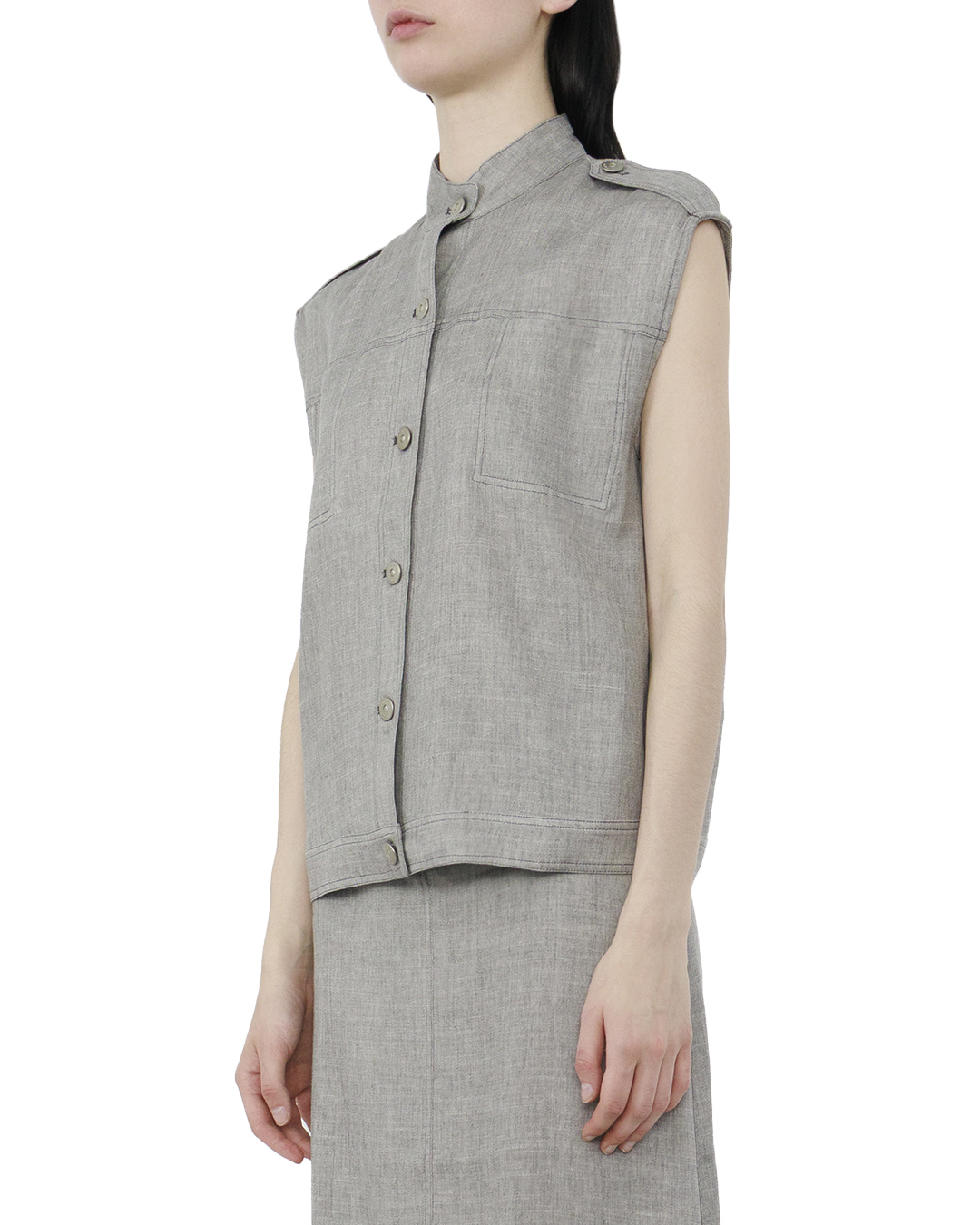 Этот жилет — образец утончённой функциональности и современного стиля. Изготовленный из ткани светло-серого оттенка, он привносит в образ ощущение лёгкости и невесомости, оставаясь при этом невероятно стильным и универсальным. Строгий стоячий воротник добавляет структуру и делает силуэт более собранным, что идеально дополняет городской стиль с лёгким налётом кэжуала. Центральная застёжка на крупные пуговицы придаёт жилету выразительность, подчёркивая внимание к деталям и качественную обработку. Эполеты на плечах создают интересный акцент, добавляя элемент милитари-шика и визуально расширяя плечи, что придаёт фигуре более сбалансированный вид. Прострочка на передней части и крупные накладные карманы создают дополнительный уровень текстурности и делают дизайн более сложным и интересным. Этот жилет будет великолепным дополнением как к повседневным рубашкам, так и к более формальным блузам, позволяя легко адаптироваться под любой дресс-код, сохраняя при этом свою уникальность и стильность.