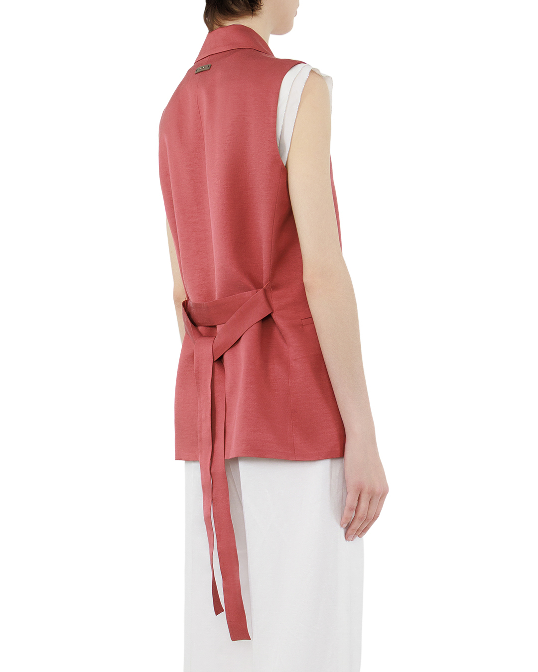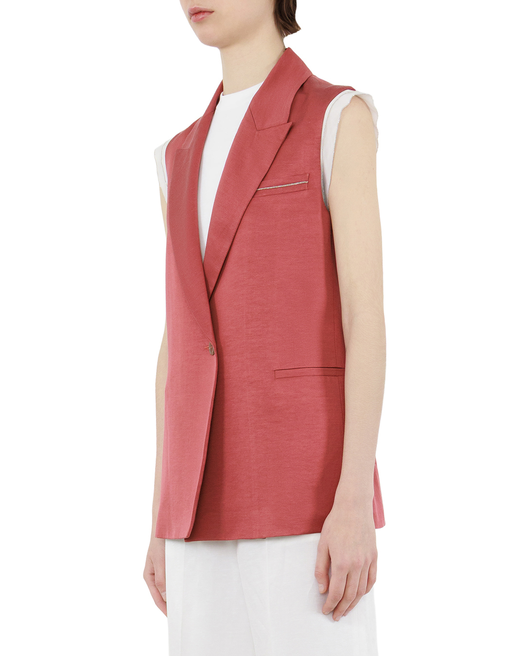 Этот изысканный жилет кораллового оттенка — воплощение современной элегантности и лаконичной выразительности. Классический крой без рукавов создаёт эффектный силуэт, подчёркивая линию плеч и визуально вытягивая фигуру. Широкие лацканы придают модели благородную строгость, структурируя верхнюю часть образа и добавляя ему графичности. Центральная застёжка на одну крупную пуговицу становится выразительным акцентом, гармонично объединяя все элементы композиции. Карманы с лаконичными клапанами органично вписаны в общий силуэт, подчёркивая практичность без ущерба для эстетики. Тонкая декоративная отстрочка на нагрудном кармане добавляет изысканную деталь, не перегружая дизайн. Внутренняя подкладка нежного бежевого оттенка создаёт приятный контраст с внешним цветом, делая изделие более интересным в деталях. Чётко выверенные линии кроя и безупречная посадка делают этот жилет универсальной базой для создания многослойных образов — от делового ансамбля с рубашкой и брюками до более расслабленного лука с топом и юбкой. Сдержанная цветовая гамма и продуманный дизайн позволяют этой вещи стать центральным элементом гардероба, преображая любой образ своей утончённой простотой. Жилет подчёркивает индивидуальность, добавляет облику лёгкости и интеллигентной сдержанности, оставаясь при этом функциональным и удобным в носке.