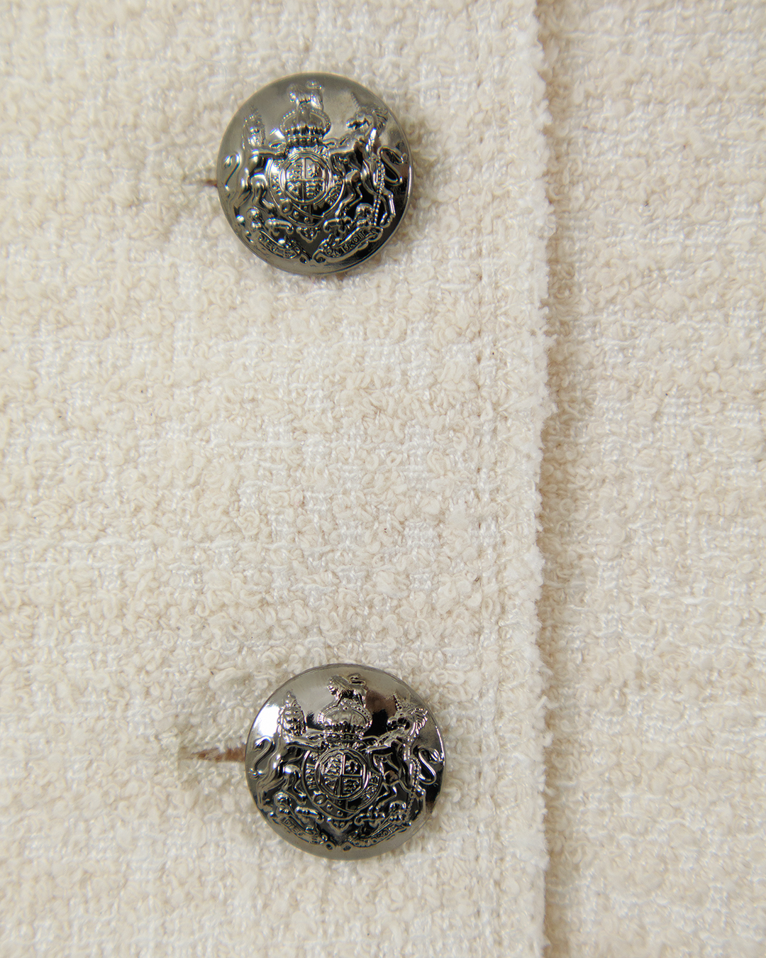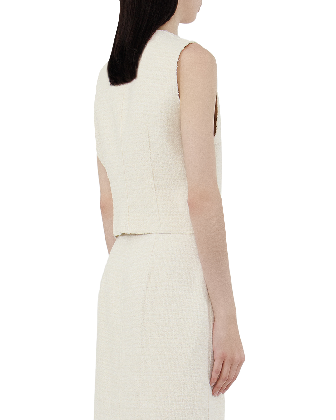 Этот жилет — олицетворение изысканного стиля и тонкого мастерства. Изготовленный из твидовой ткани, он добавляет глубины и изящества любому образу, предлагая богатый тактильный эффект. Чёткие линии кроя подчёркивают структуру изделия, создавая элегантный и утончённый силуэт. V-образный вырез визуально удлиняет шею и акцентирует внимание на зоне декольте, добавляя женственности и утончённости. Декоративные пуговицы, выполненные в винтажном стиле, придают нотку ретро-шика и служат стильным акцентом, завершая общий ансамбль. Этот жилет идеально комбинируется с как с классическими рубашками, так и с современными топами, открывая безграничные возможности для создания стильных и актуальных луков, как в офисном, так и в повседневном гардеробе.