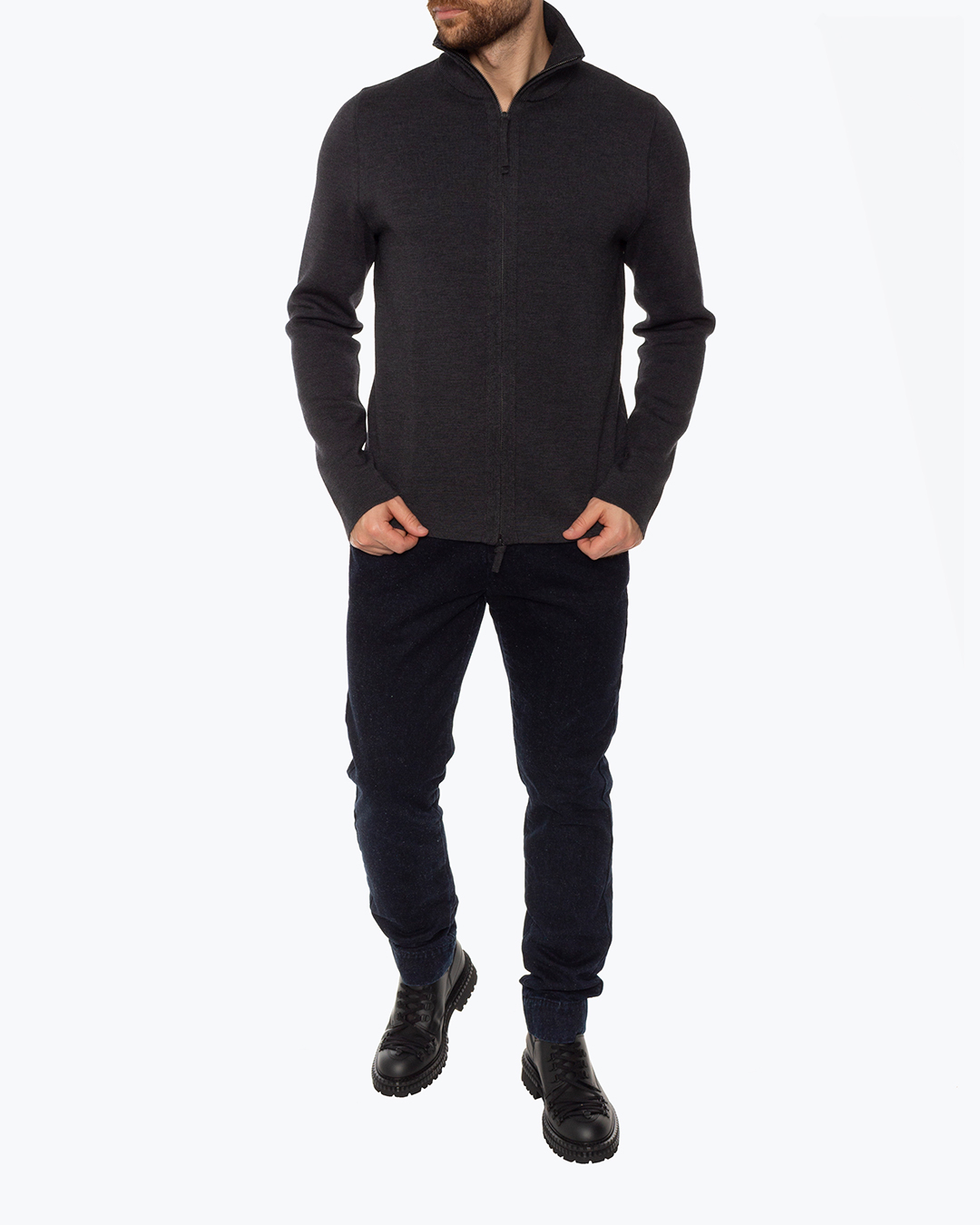 Мужской кардиган из трикотажной шерсти серого оттенка. Модель прямого силуэта с застежкой на молнию дополнено воротником-стойкой.