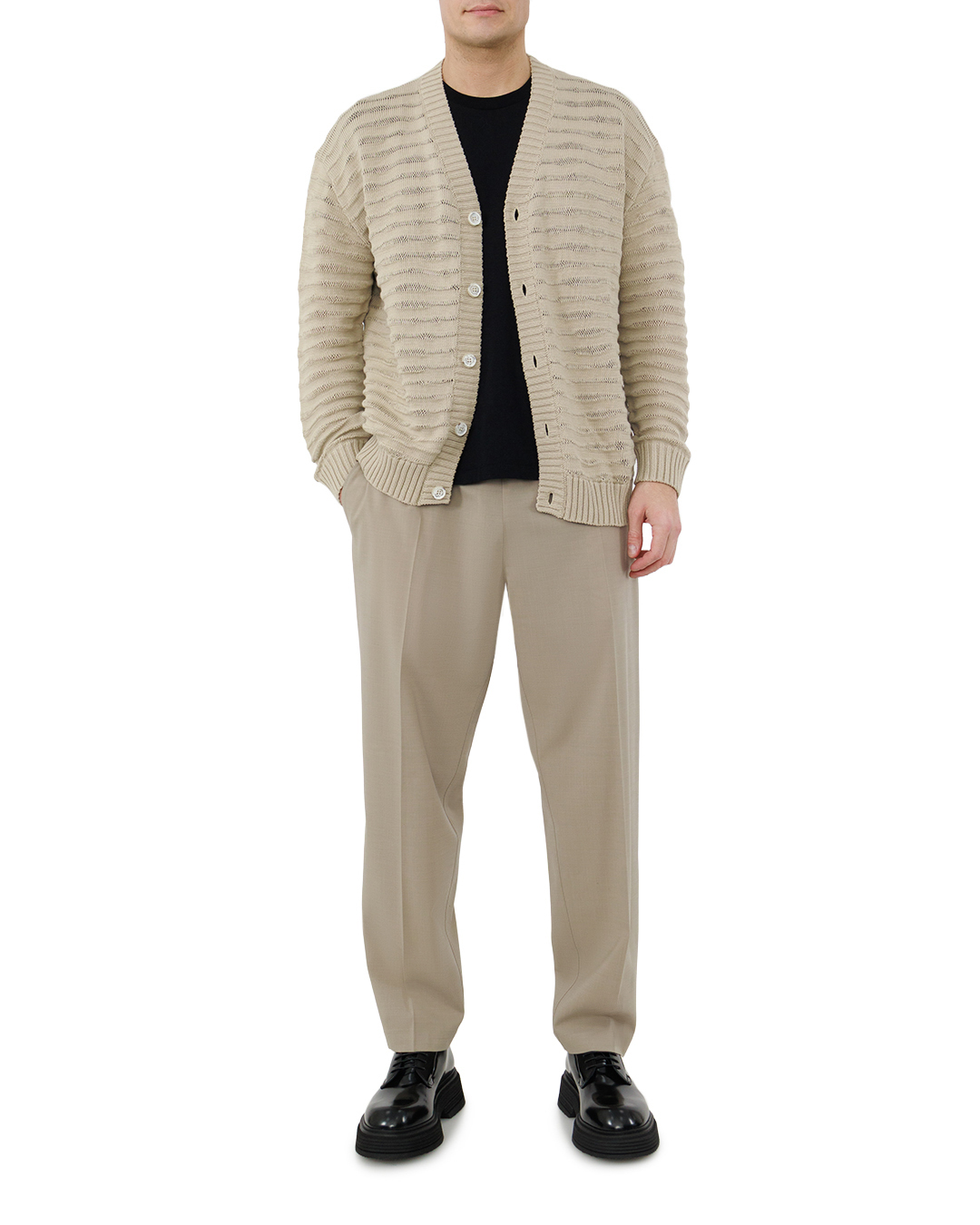 Этот кардиган — воплощение утончённой лаконичности. Песочный оттенок создаёт ощущение тепла и уюта, а рельефная вязка с горизонтальными узорами придаёт изделию глубину и фактурность. V-образный вырез мягко подчёркивает линию шеи, а ряд аккуратных пуговиц по центру добавляет классичности. Ребристые манжеты и низ изделия обеспечивают плотную посадку, не сковывая движений. Модель сочетает простоту и изысканность, становясь идеальной основой для многослойных образов.