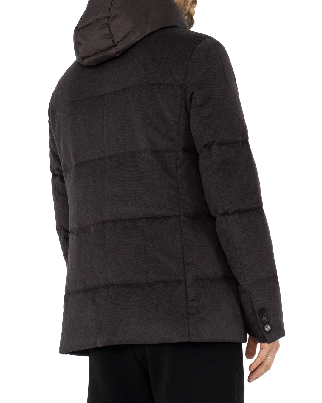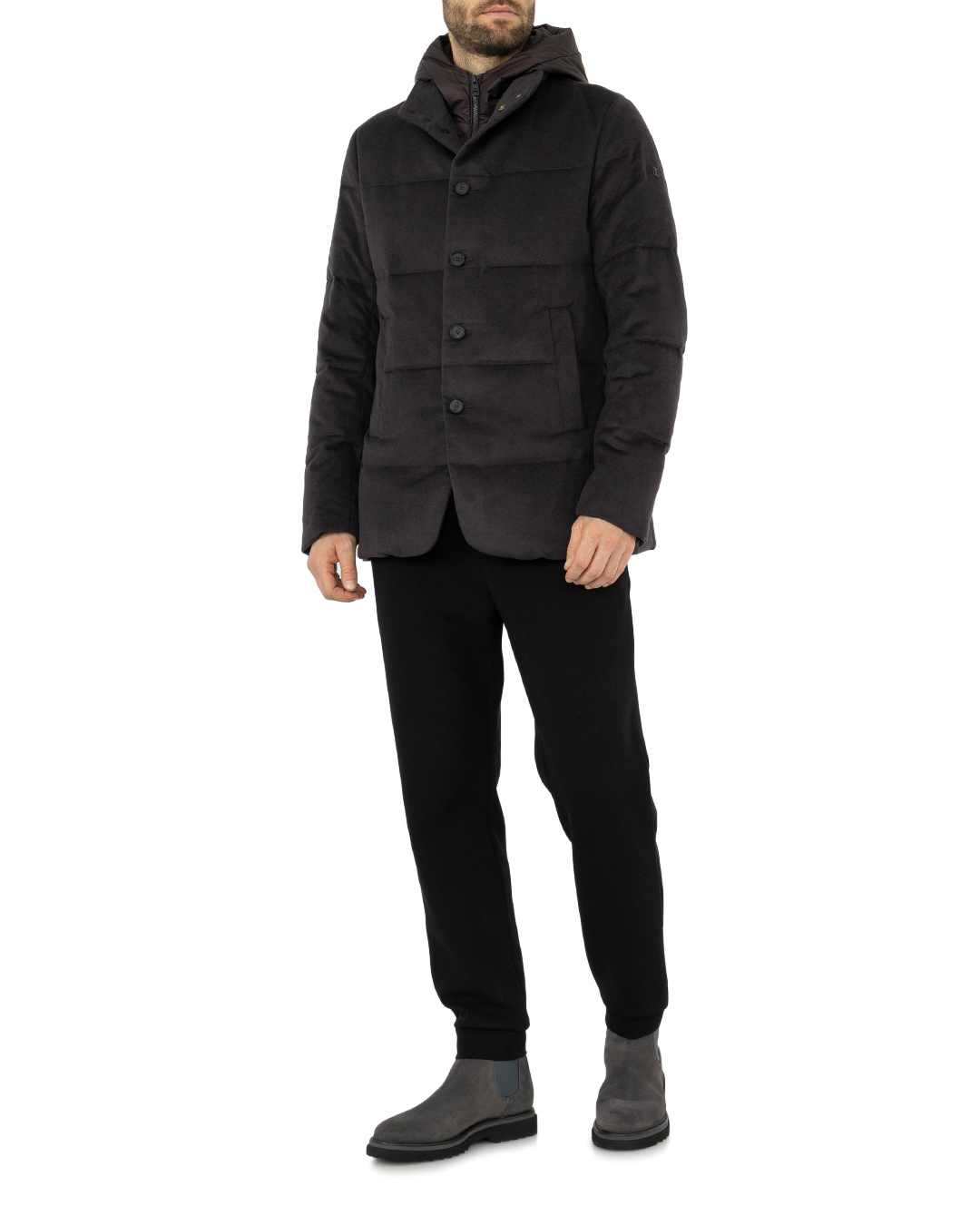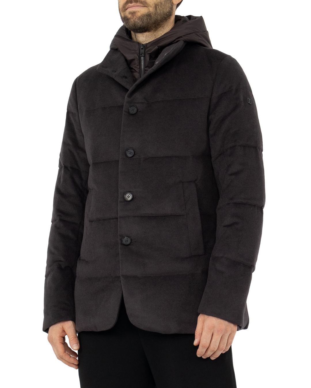 Стеганый пуховик DUNO из шерстяной смеси, наполнитель утиный пух. Модель сшита в классическом стиле прямого силуэта с застежкой на пуговицы с двумя карманами по бокам и капюшоном.