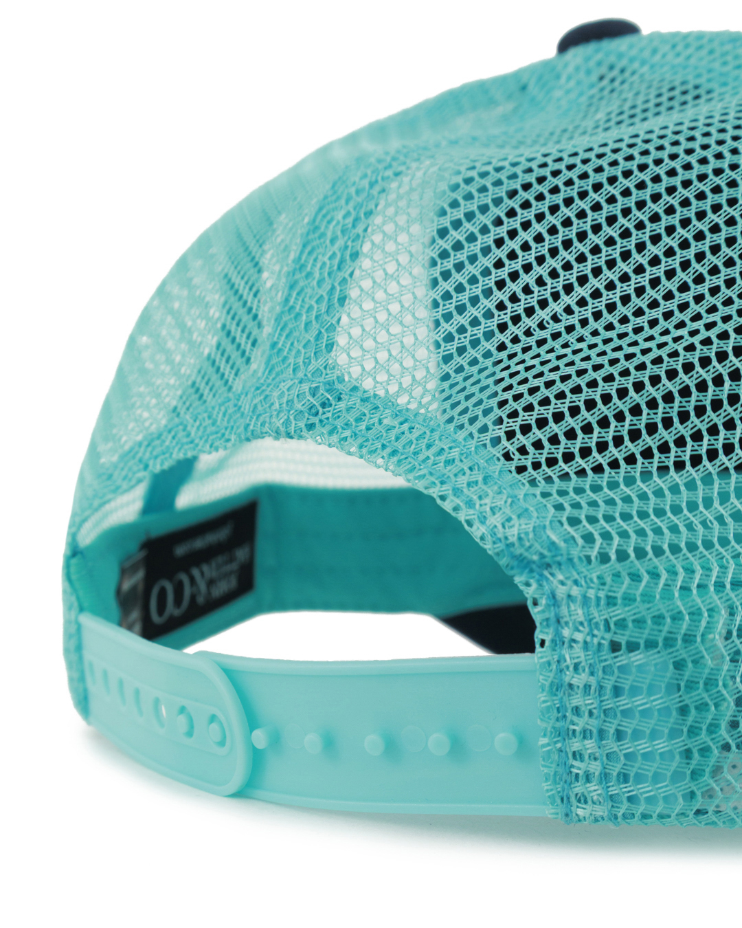Бейсболка изготовлена из хлопка и полиэстера — прочных материалов. Плоский козырек защищает лицо от солнца, а задняя часть из пластиковой сетки обеспечивает воздухопроницаемость и уменьшает потоотделение — идеально подходит для жаркого летнего дня. Застежка-кнопка регулируется по размеру, что делает бейсболку универсальной.