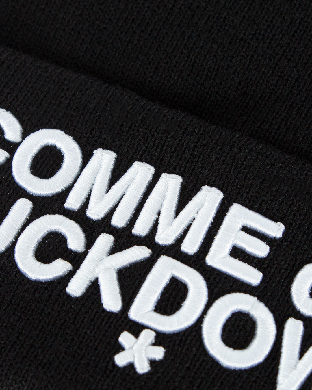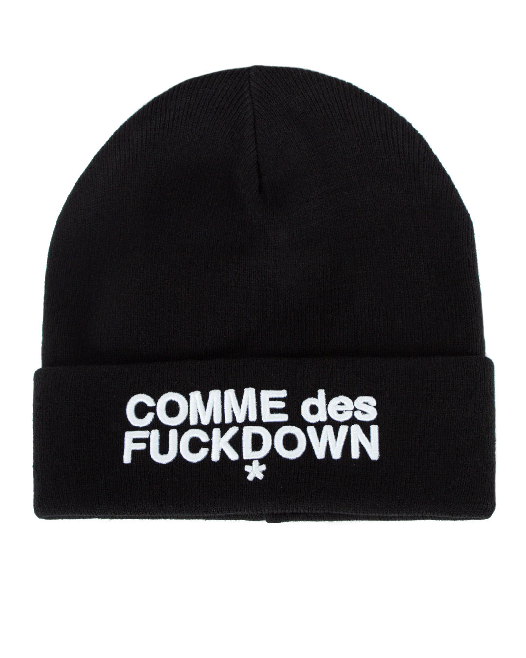 Полушерстяная шапка COMME des FUCKDOWN с широким отворотом и объемной вышивкой логотипа бренда.