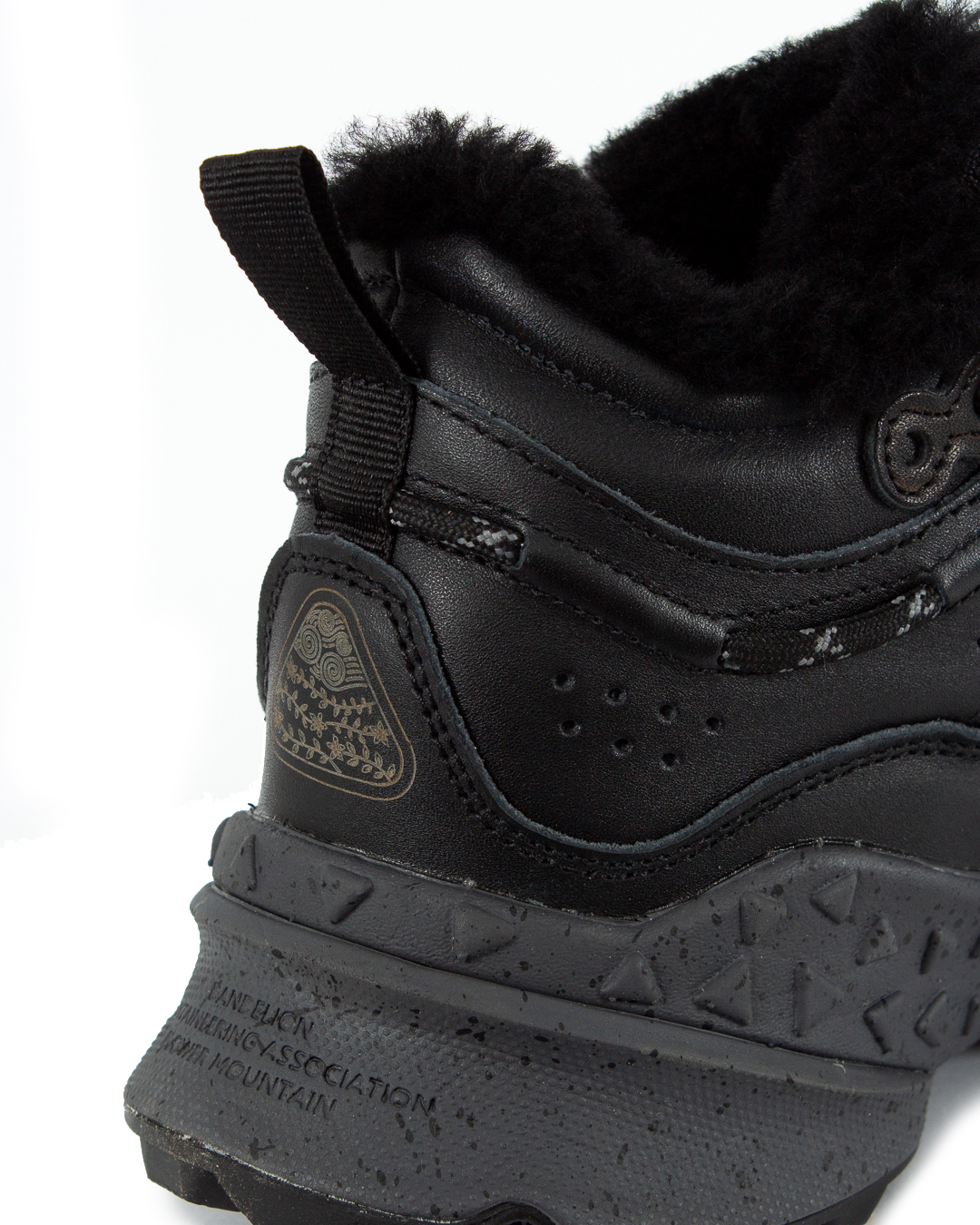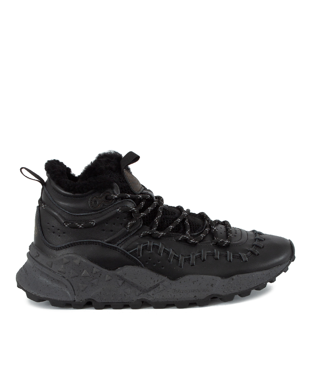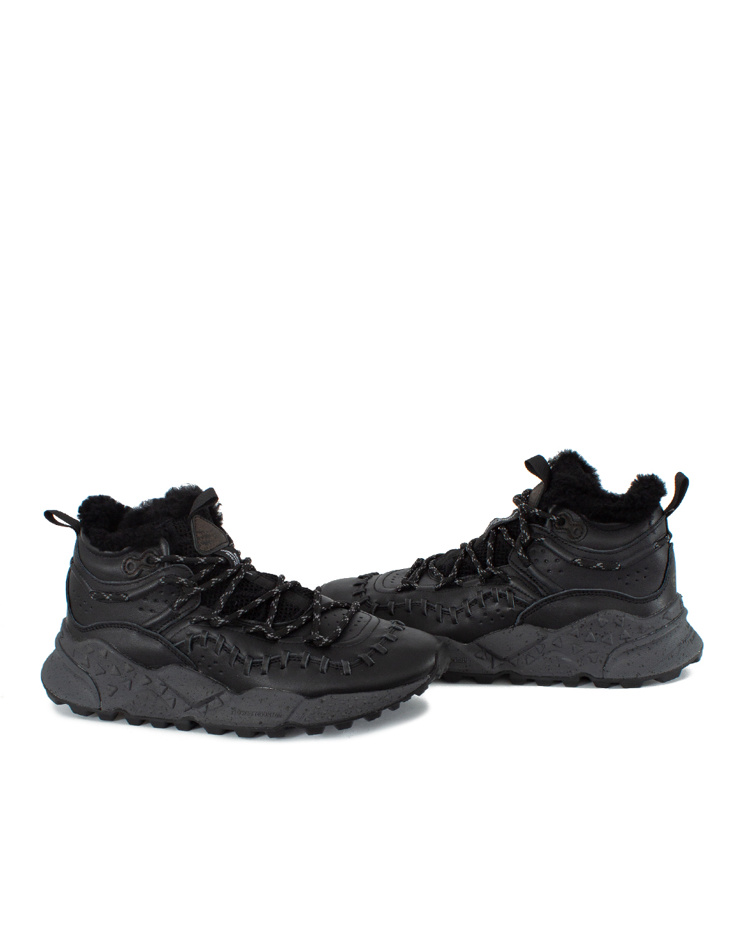 Утепленные кроссовки FLOWER MOUNTAIN из кожи черного цвета. Высокая пара на шнуровке, с брендированным язычком и удобной резиновой подошве с протектором.