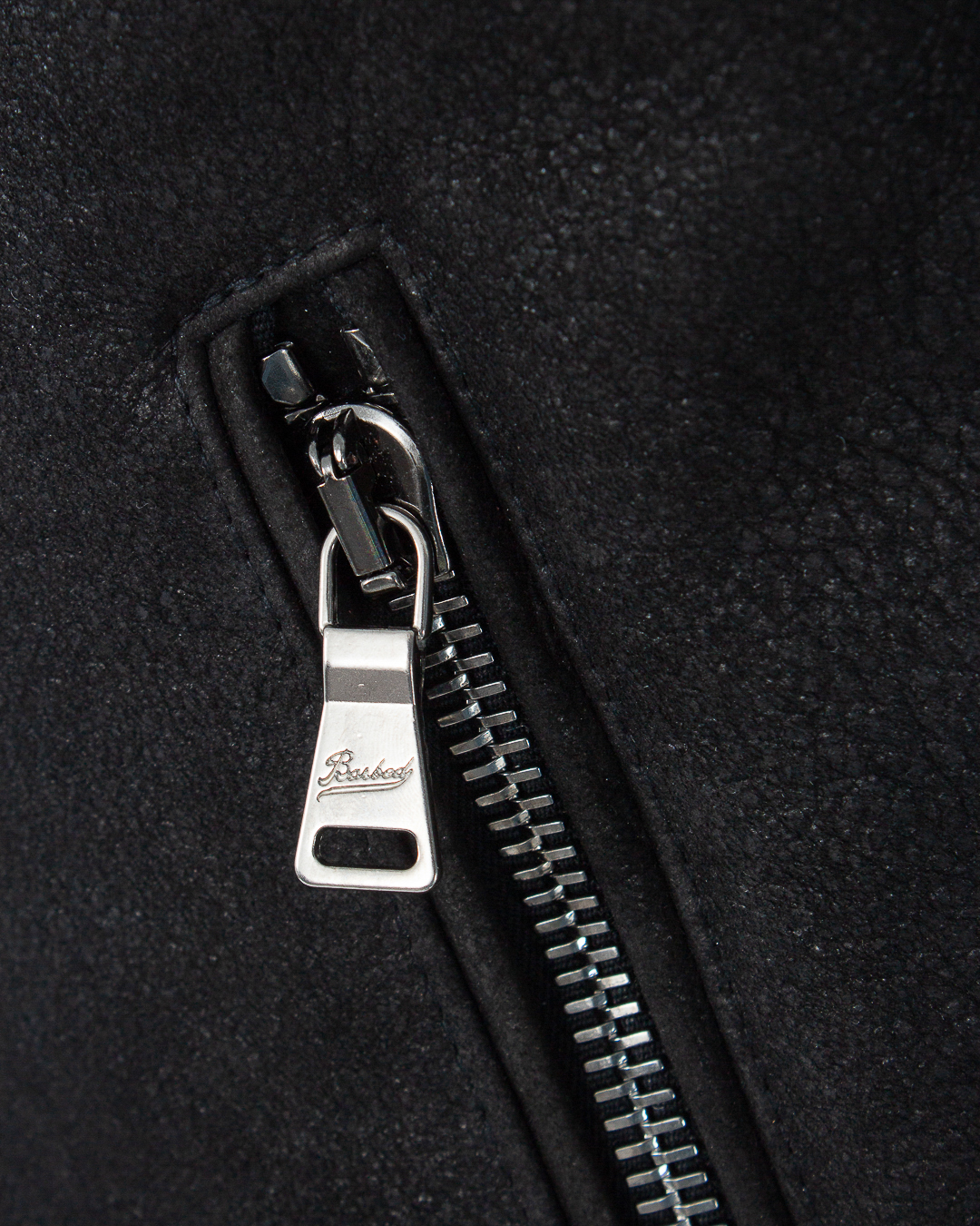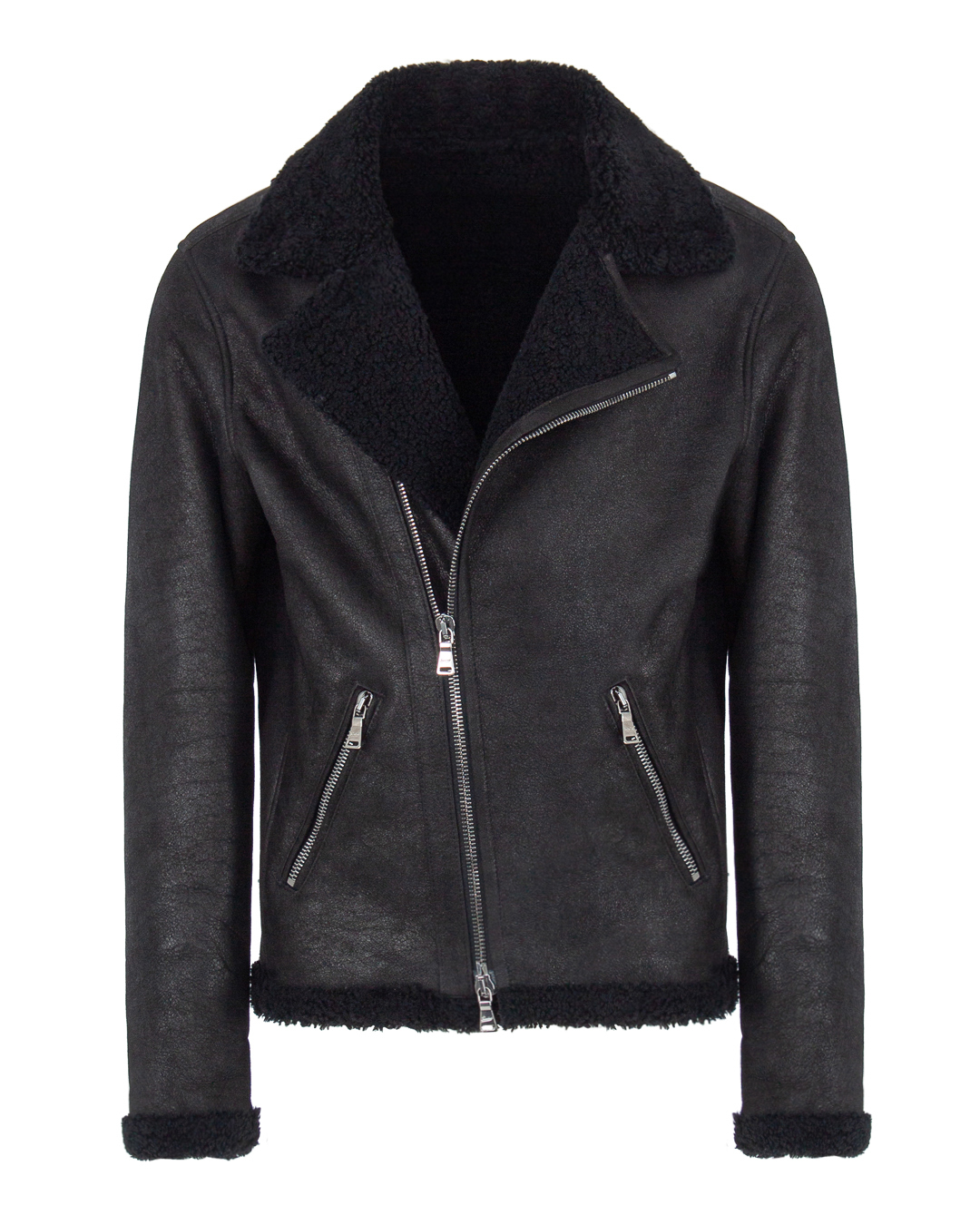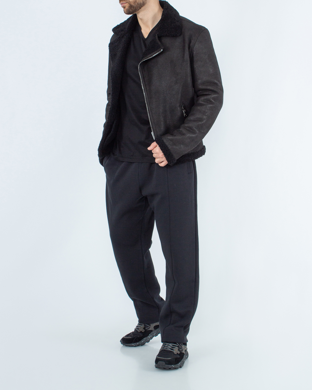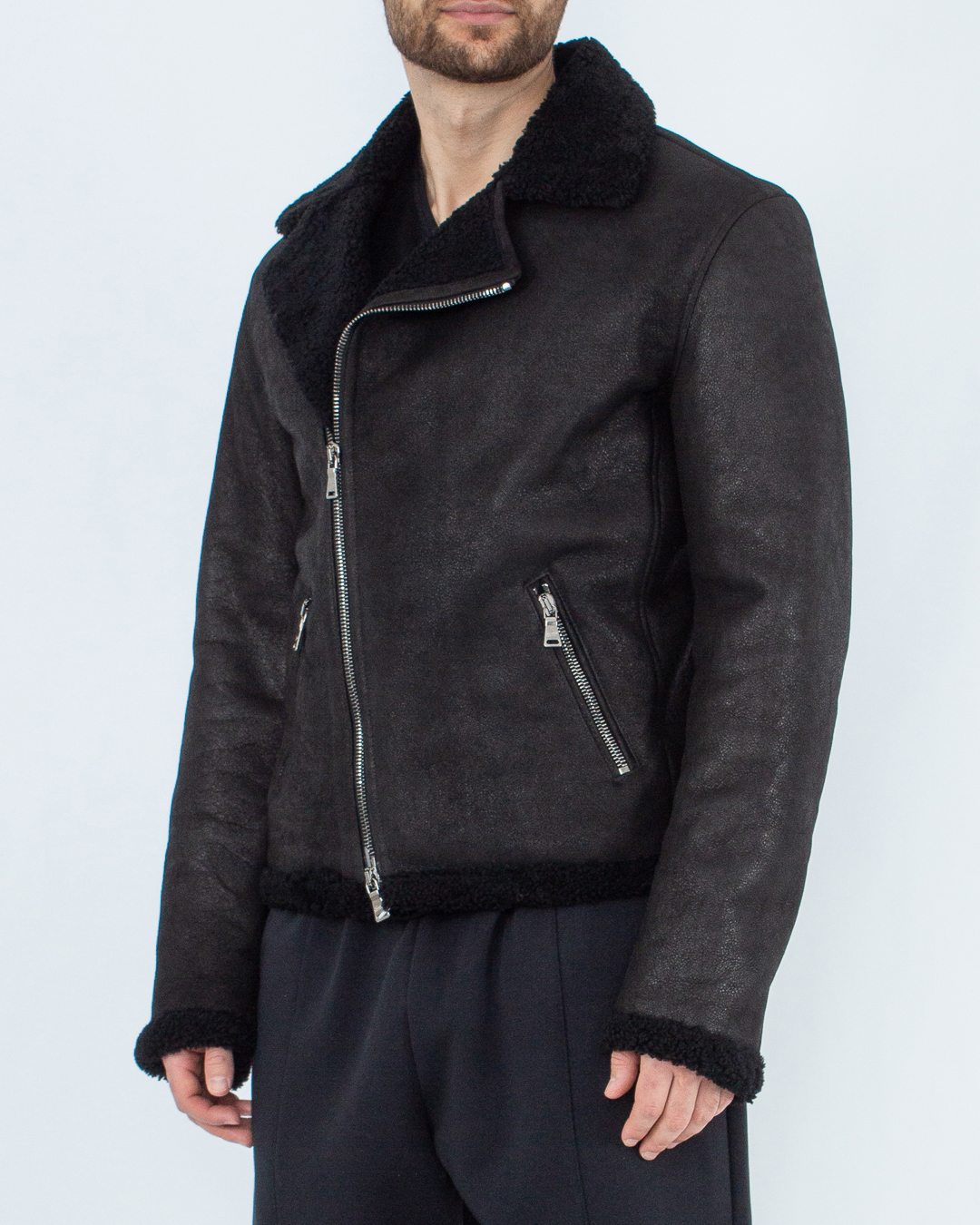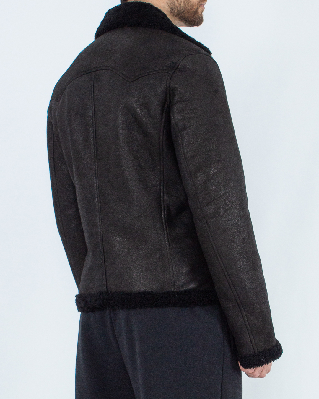 Мужская дубленка из овчины черного цвета с застежкой на смещенную молнию. Модель дополнена двумя карманами по бокам и отложным воротником.