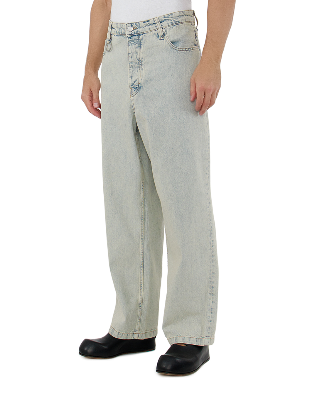 Эти джинсы — идеальная гармония конструктивной простоты и ностальгического винтажного шика. Светлый деним создает лёгкий, воздушный образ, придающий свежесть гардеробу. Свободный крой с прямыми штанинами дарит комфорт и непринужденность, отражая современные тренды на расслабленное настроение в одежде. Высокая посадка обеспечивает утонченный силуэт и подчёркивает талию. Интересным акцентом служит декоративное кольцо на поясе, добавляющее уникальность и лофтовый стиль. Потёртости на ткани придают изделию винтажный характер, создавая впечатление лёгкой изношенности, популярной в актуальных тенденциях. Прочные швы и качественная прострочка подчеркивают долговечность, а универсальность модели позволяет легко сочетать её с различными топами — от структурированных блейзеров до легких футболок, создавая стильные образы на каждый день.