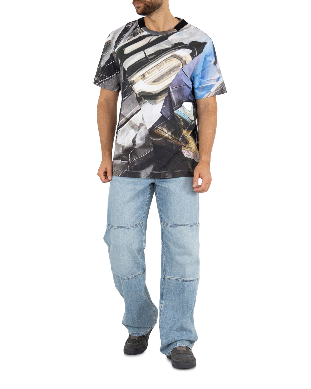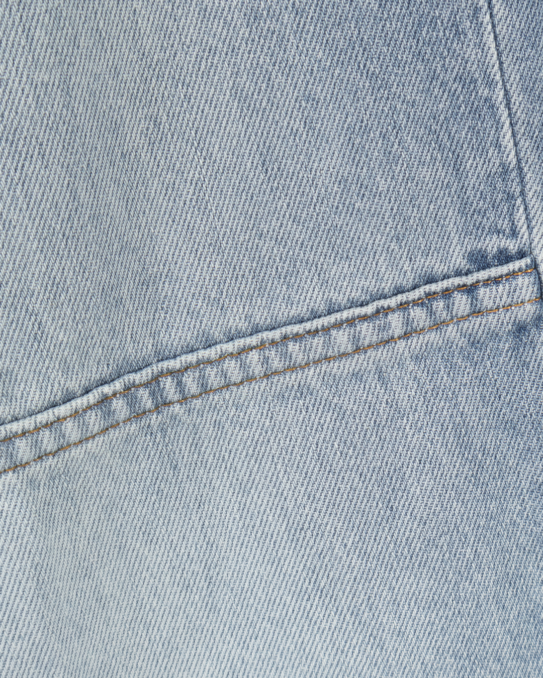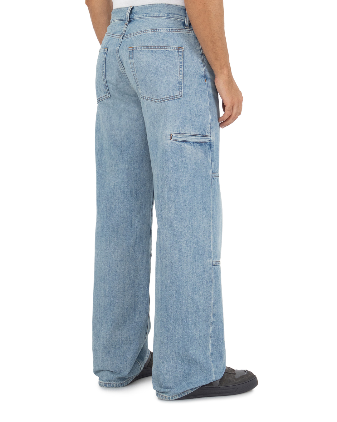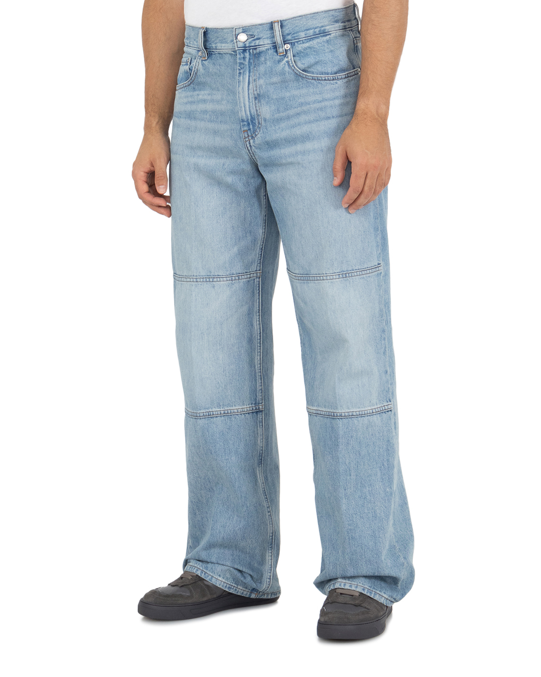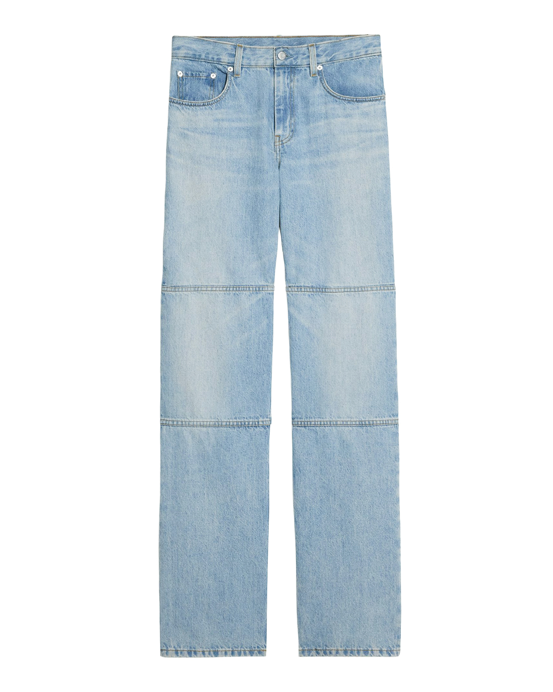 Джинсы HELMUT LANG сшиты из хлопкового денима голубого оттенка. Модель прямого силуэта с широкими брючинами и высокой комфортной посадкой с застежкой на молнию и пуговицу.