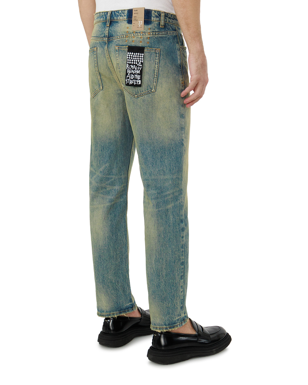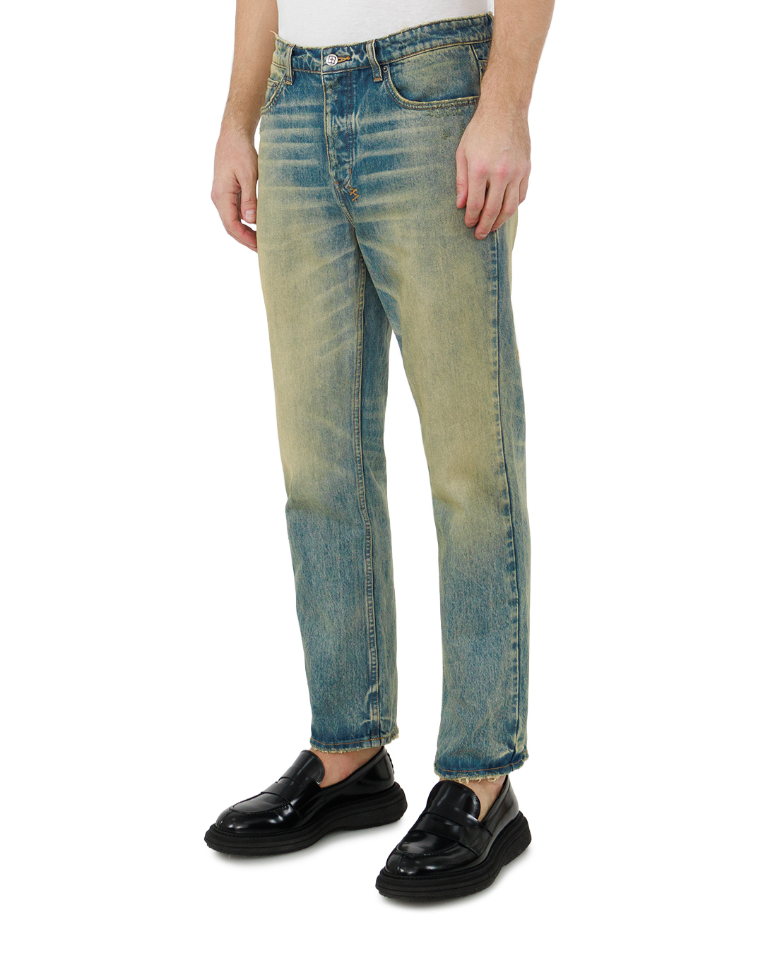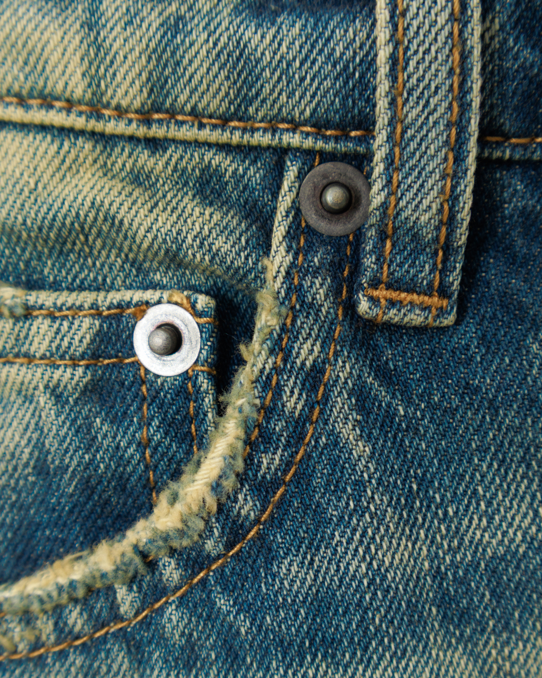 Эти джинсы — ода винтажному стилю с современным прочтением. Светло-голубой деним с неравномерной стиркой и мягкими потёртостями создаёт эффект «ношенности» с характером. Классический пятикарманный крой дополнен аккуратной отстрочкой по швам, подчёркивающей качество пошива. Расклешённый силуэт придаёт свободы и лёгкости, а слегка выцветшие участки на бёдрах и коленях добавляют индивидуальности. Металлическая фурнитура лаконична, петли для ремня чётко очерчены, застёжка на пуговицу завершает образ. Модель сочетает непринуждённость и стиль, становясь базой для выразительных образов.