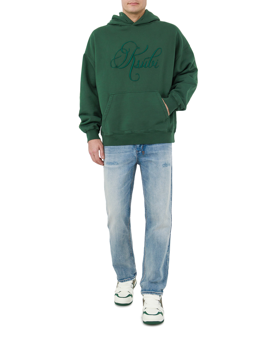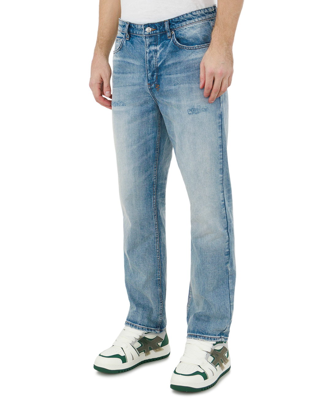 Эти джинсы — воплощение лёгкой небрежности с изысканным вкусом. Светло-голубой деним с деликатной неравномерной стиркой создаёт игру полутонов, придавая модели характер. Прямой крой с лёгким расширением к низу обеспечивает свободу движений и подчёркивает силуэт. Аккуратная отстрочка по швам и контурам карманов акцентирует внимание на качестве пошива. Лёгкие потёртости и едва заметные «царапины» на бёдрах добавляют образу аутентичности. Металлическая фурнитура лаконична, застёжка на пуговицу завершает композицию. Модель сочетает простоту и стиль, становясь универсальной деталью гардероба.