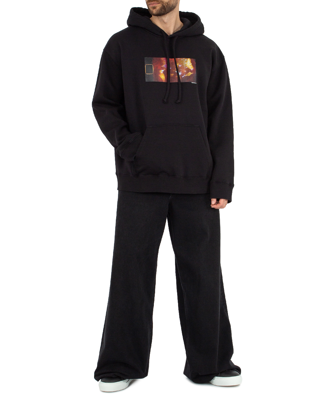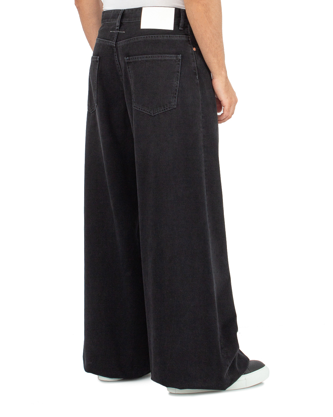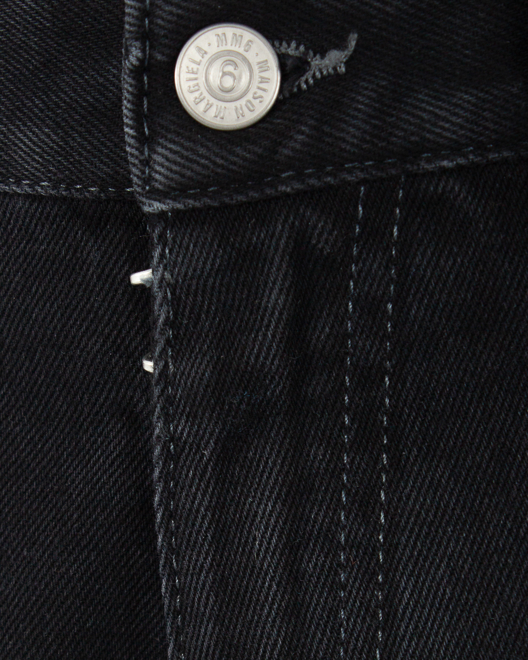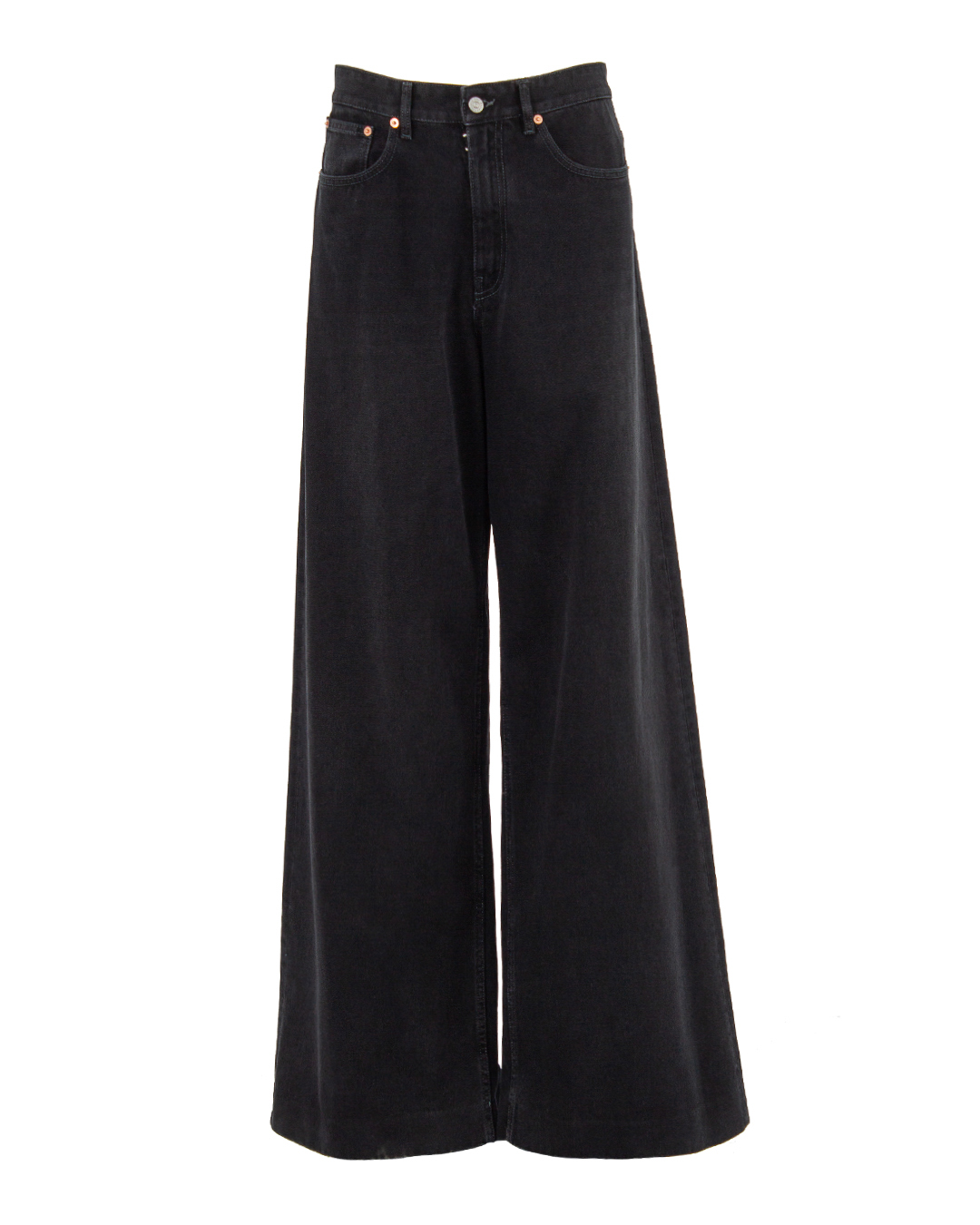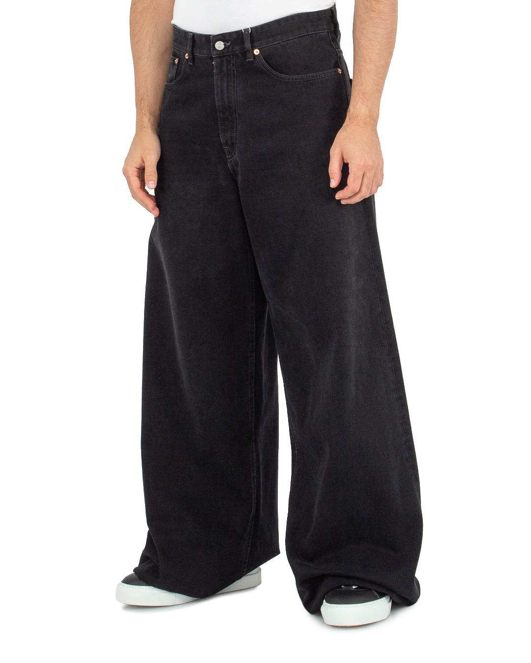 Джинсы MM6 Maison Margiela выполнены из плотного хлопкового денима. Модель свободного силуэта с широкими брючинами. Высокая посадка, застежка на молнию и пуговицы, классические пять карманов.