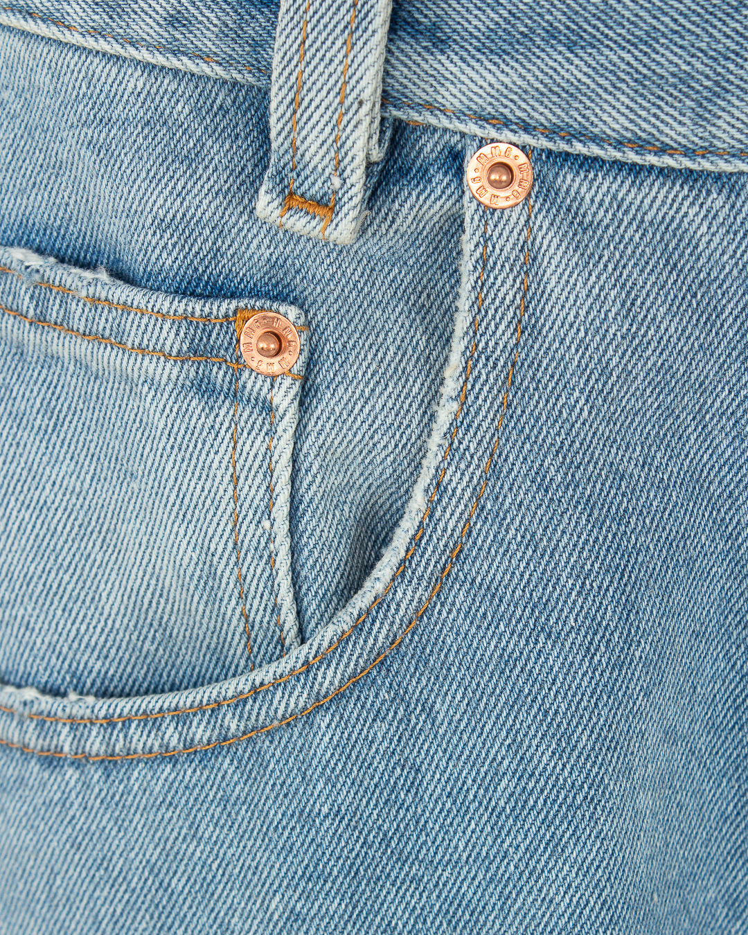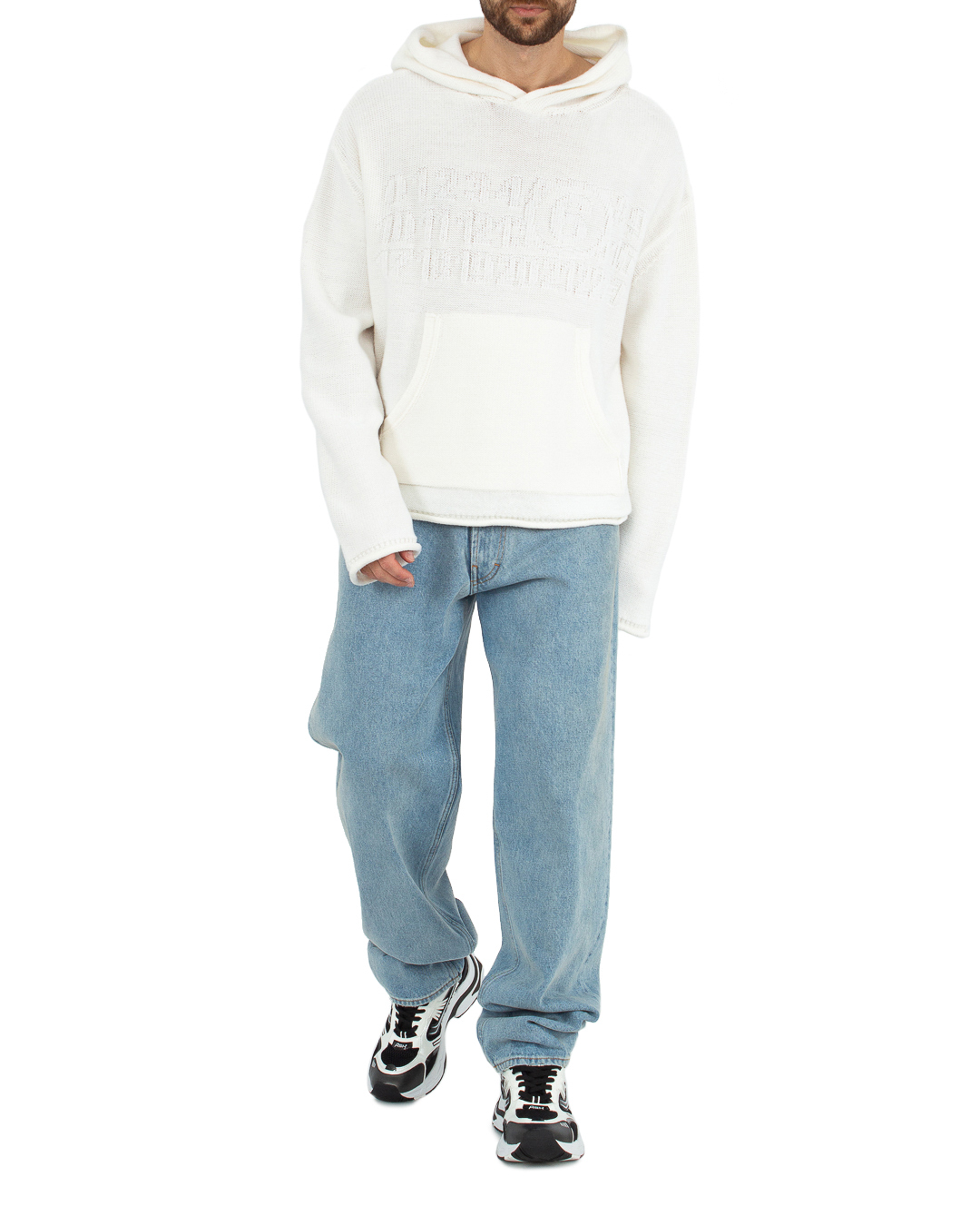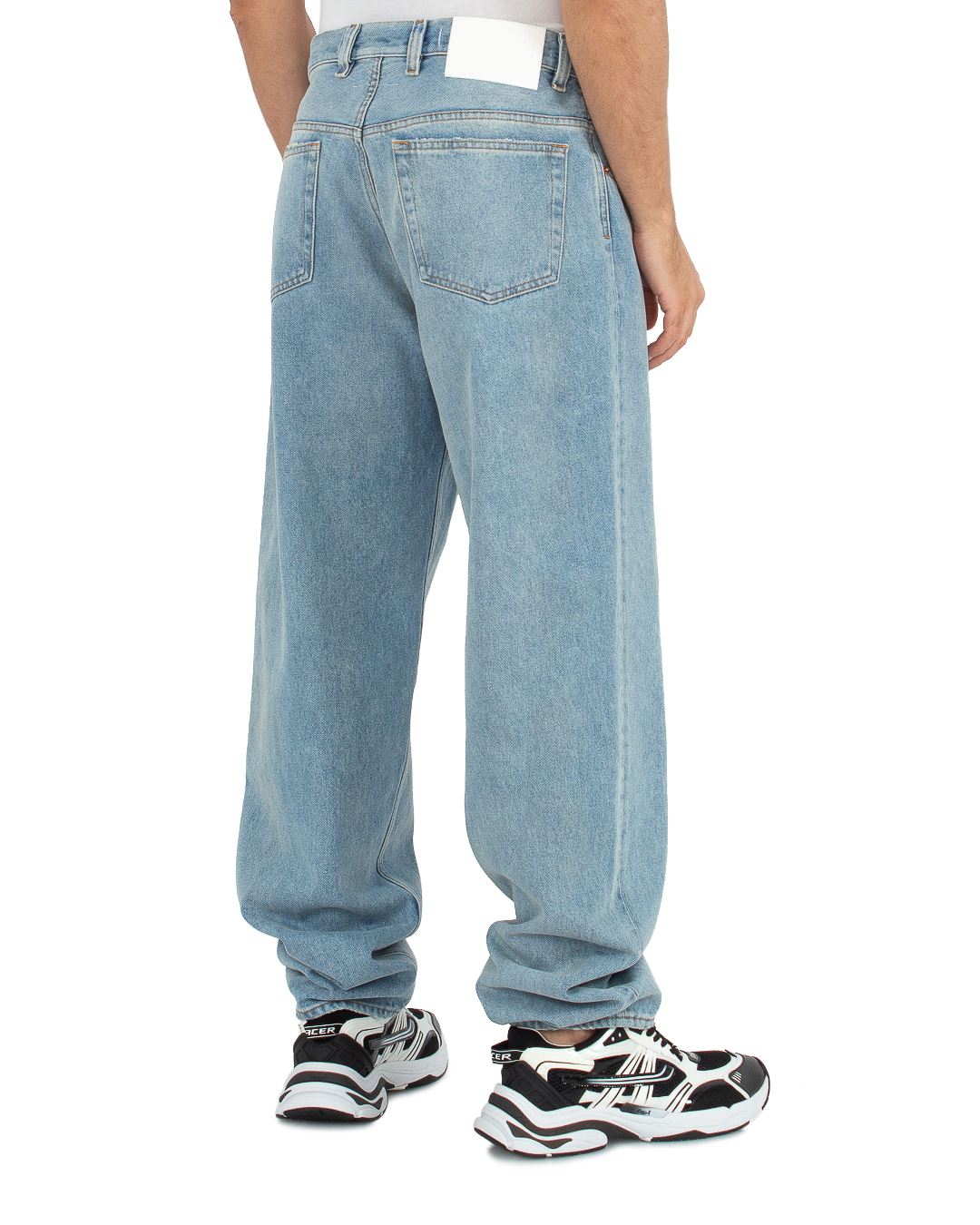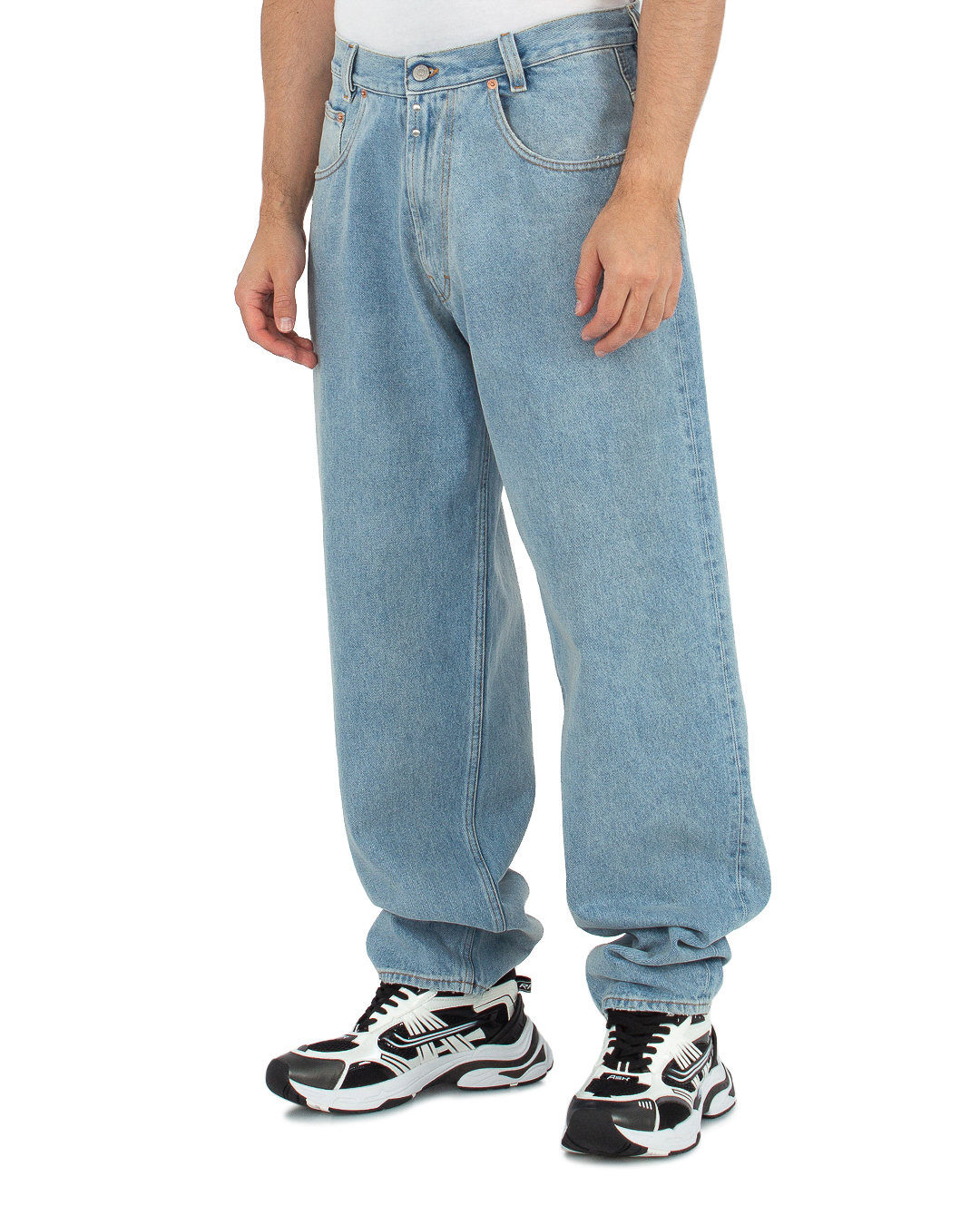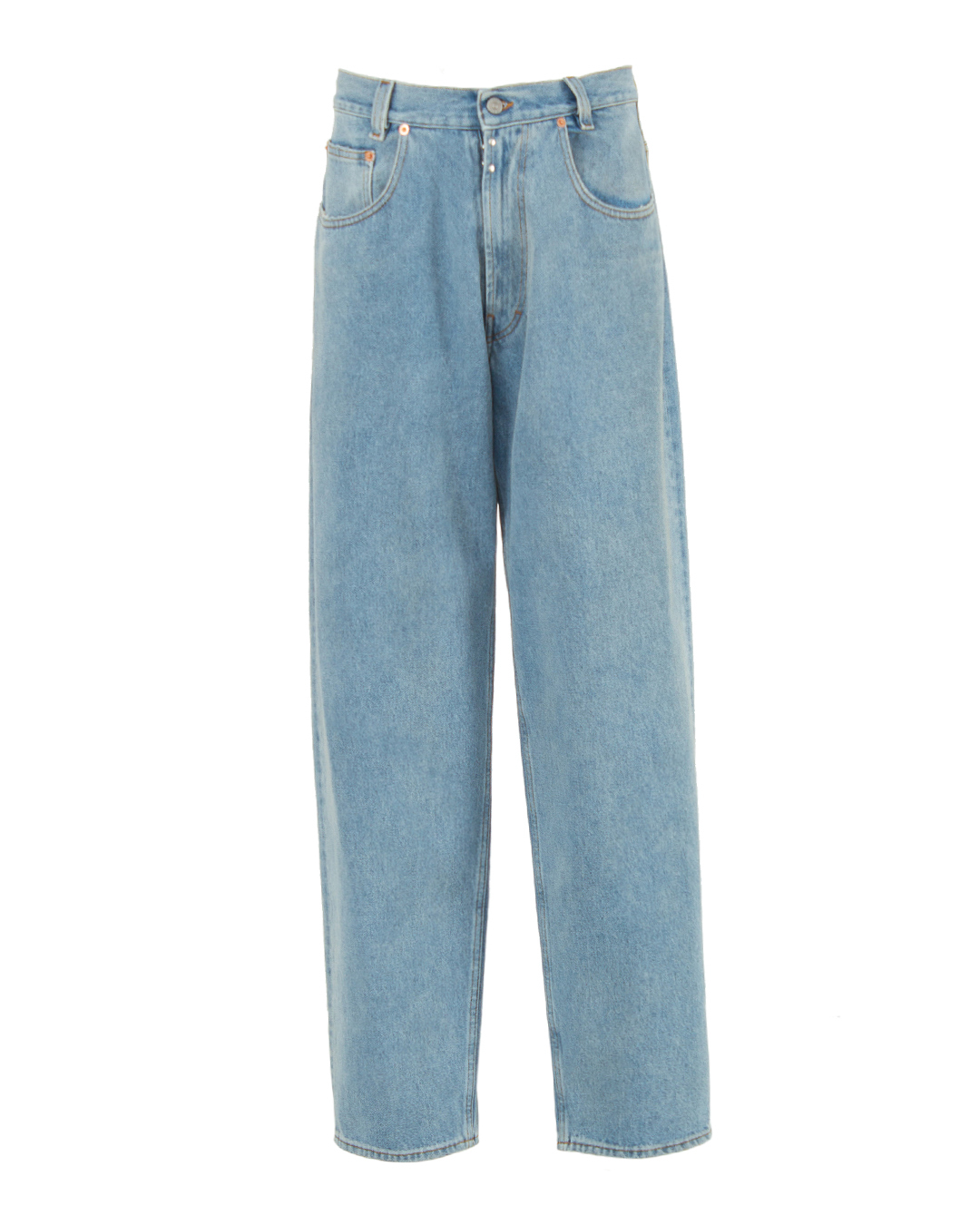 Джинсы MM6 Maison Margiela выполнены из плотного хлопкового денима голубого оттенка с потертостями. Модель свободного силуэта с широкими брючинами. Высокая посадка, застежка на молнию и пуговицы, классические пять карманов.