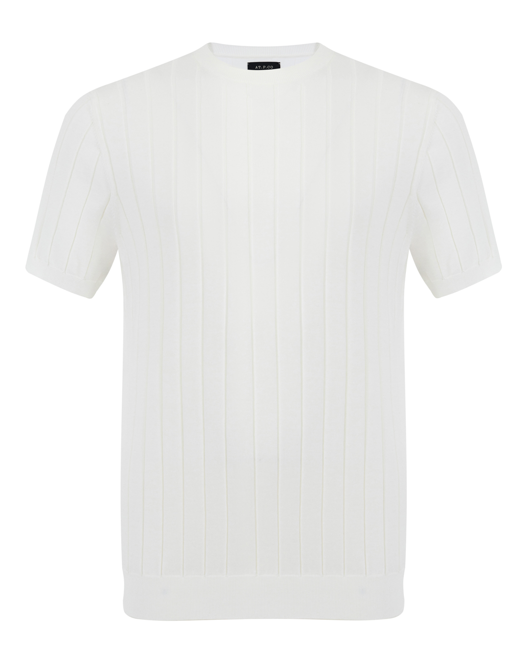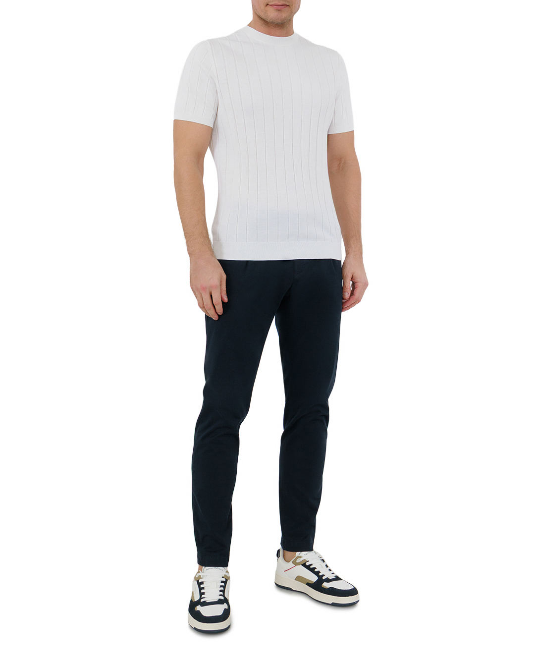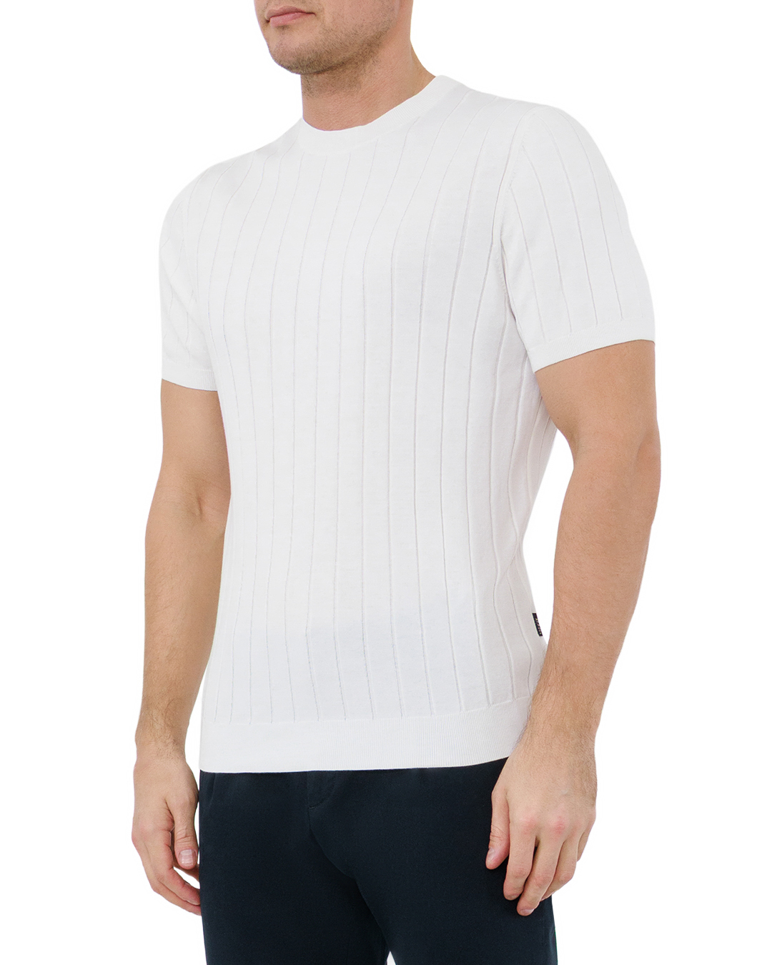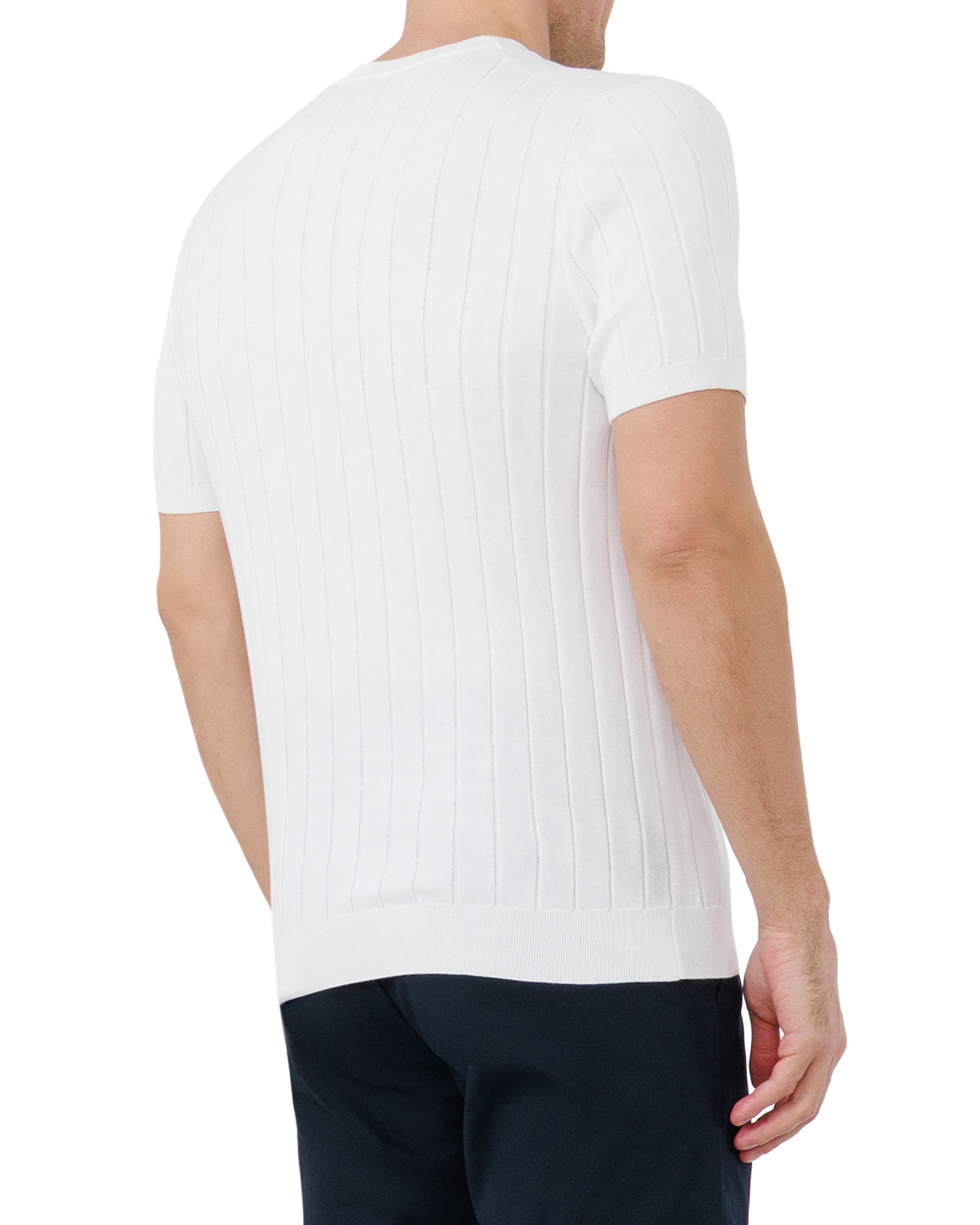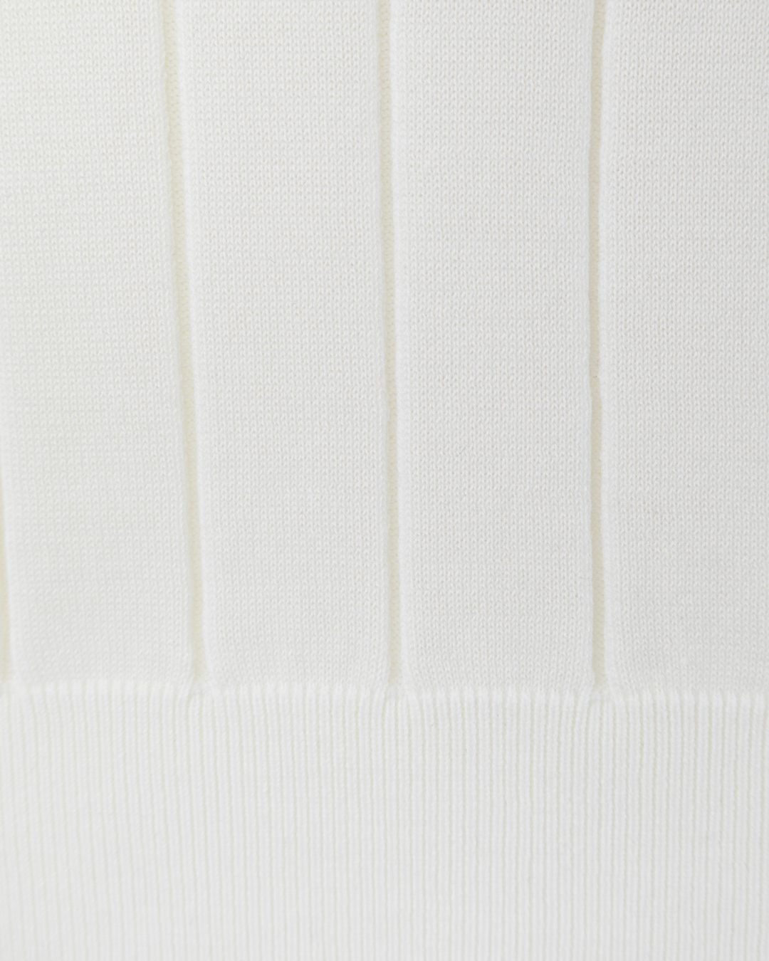 Этот джемпер — воплощение лаконичной чистоты. Белоснежный оттенок в сочетании с вертикальной рельефной вязкой создаёт эффект стройности и лёгкости. Короткий рукав и округлый вырез горловины подчёркивают сдержанную элегантность, а плотная резинка по низу изделия обеспечивает аккуратную посадку. Минималистичная отделка делает модель универсальной: она легко впишется в строгий или расслабленный образ, оставаясь при этом изысканной и утончённой.