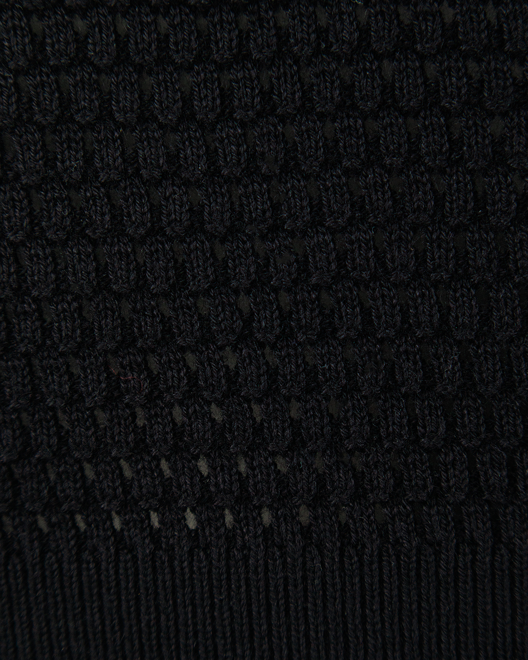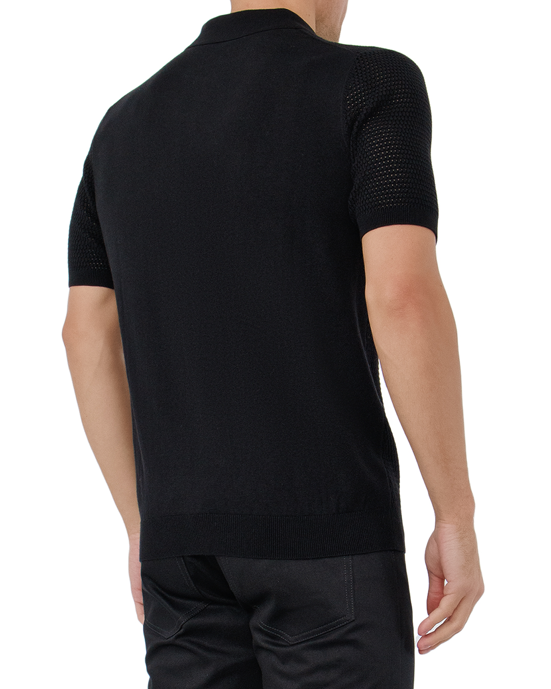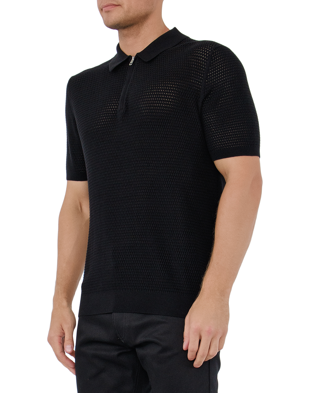 Это поло представляет собой воплощение современного шика и дерзкой элегантности. Черный цвет добавляет модели глубину и стиль, а оригинальная текстура привносит элемент неожиданности и эксклюзивности. Сетчатая структура материала создаёт интригующий эффект полупрозрачности, который добавляет смелости и легкости образу, обеспечивая при этом превосходную вентиляцию. Фасон поло подчеркивает современную эстетику, идеально подходя для тех, кто ценит оригинальность и комфорт. Классический отложной воротник и застежка-молния вместо традиционных пуговиц на планке — уникальное дизайнерское решение, которое выделяет это поло среди прочих. Манжеты и нижний край выполнены в плотной вязке, что придаёт целостность и завершённость виду. Эта модель станет эффектным акцентом в вашем гардеробе, легко комбинируясь с различными стилями и добавляя утонченной дерзости в любой образ.