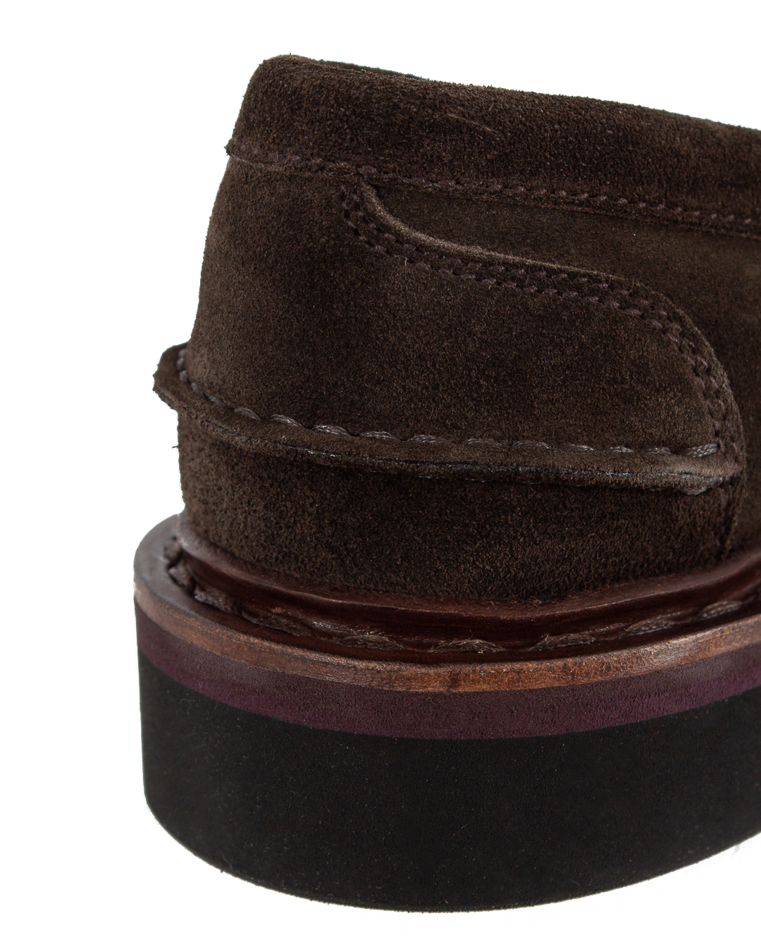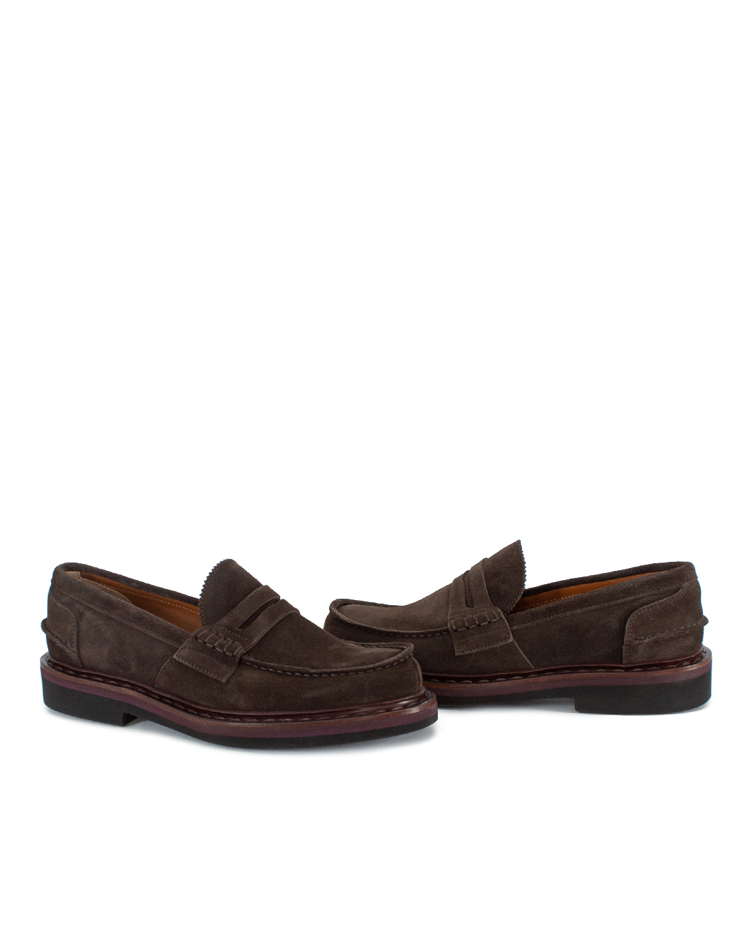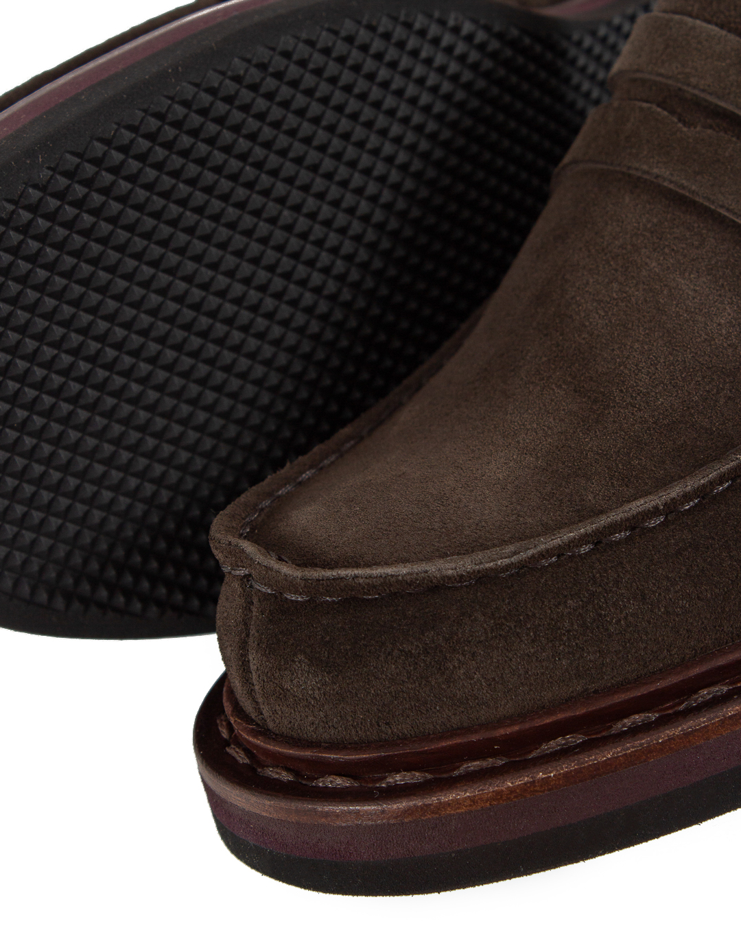 Мужские лоферы Premiata из натуральной замшевой кожи. Пара в классическом исполнении с закругленным мысом, удлиненным язычком и полукруглыми швами с перемычкой на мысе. Обувь на жесткой широкой подошве с прошитым рантом дополнена невысоким устойчивым каблуком.