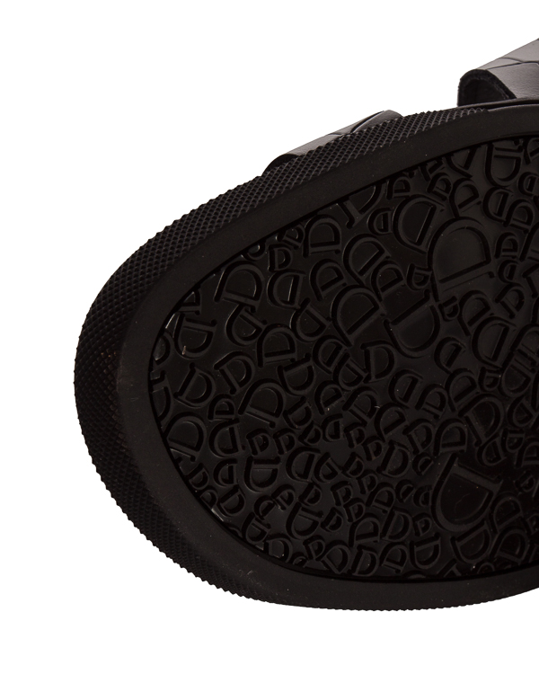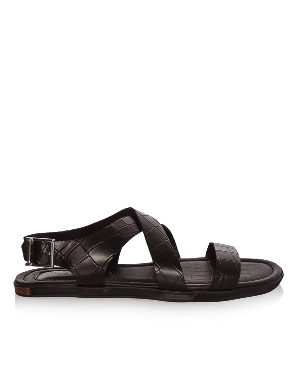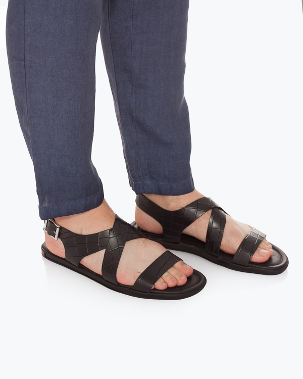 Мужские сандалии из плотной кожи с фактурой рептилии черного цвета. Модель на плоской подошве с ремешками и застежкой на пряжку.