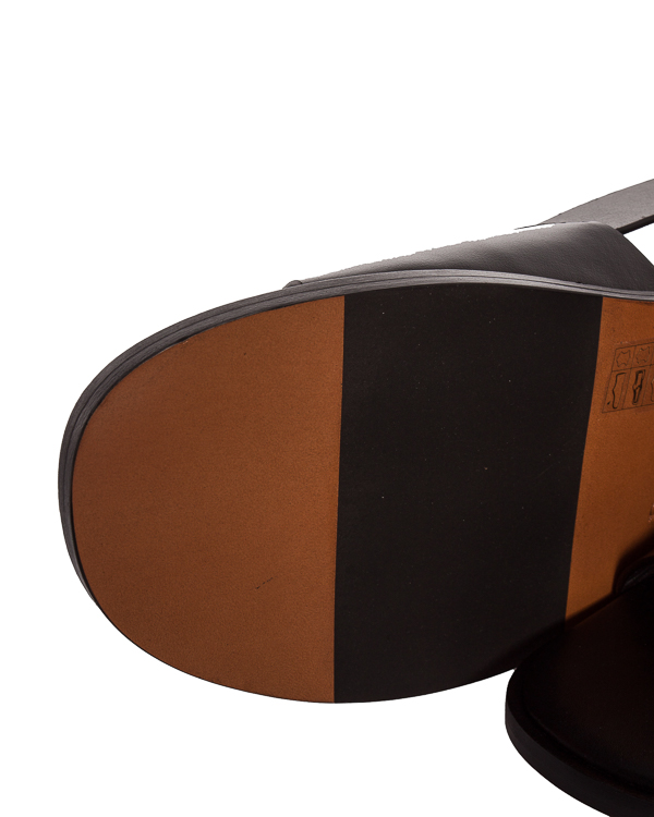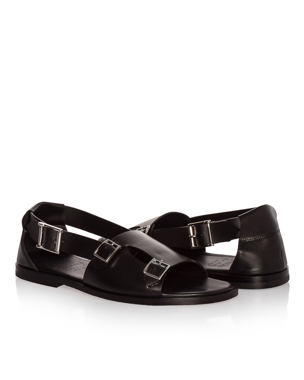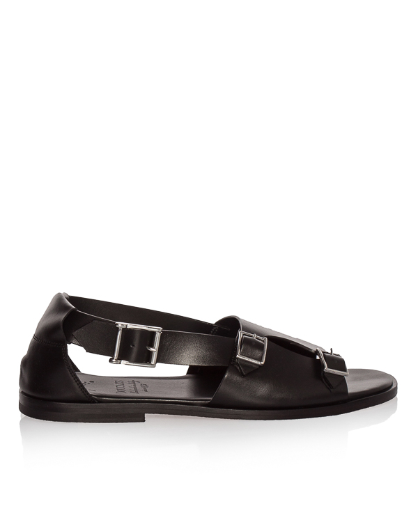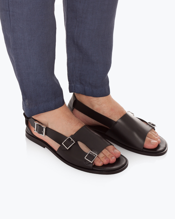 Мужские сандалии из плотной кожи черного цвета. Модель на плоской подошве с миниатюрным каблуком. Пара с ремешками и застежкой на пряжки.
