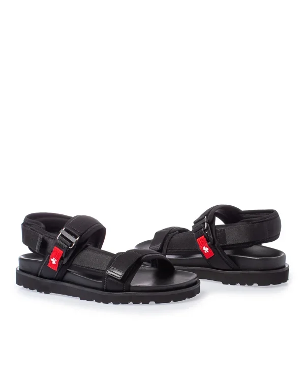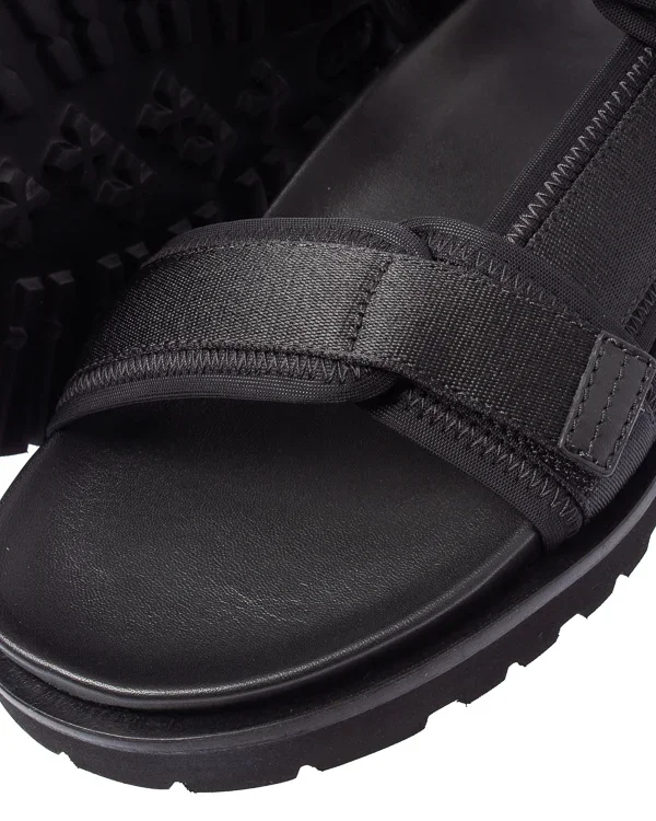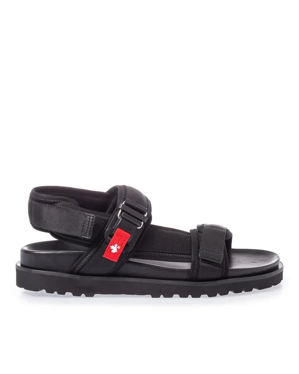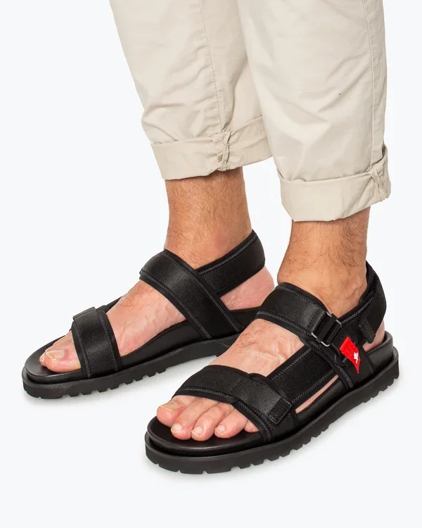Мужские сандалии из кожи с текстильными липучками чпрного цвета. Удобная пара на резиновой подошве с протектором.