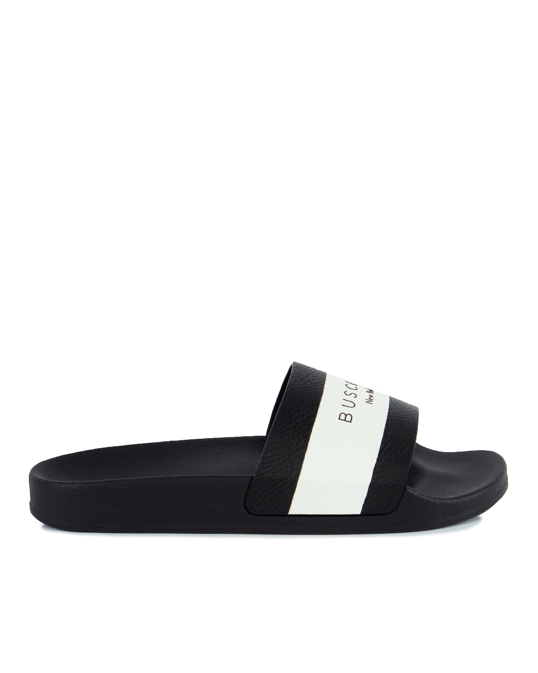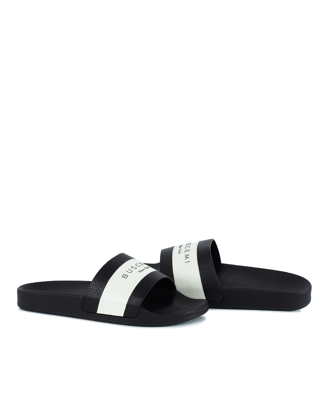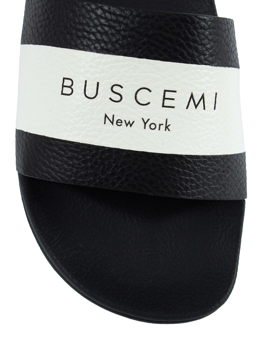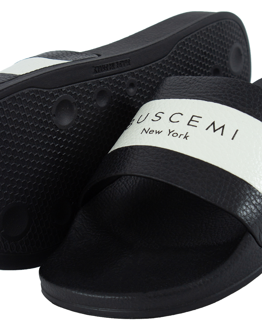 Шлепанцы BUSCEMI выполнены с широкой перемычкой, оформленной логотипом бренда. Плоская подошва и анатомическая стелька.