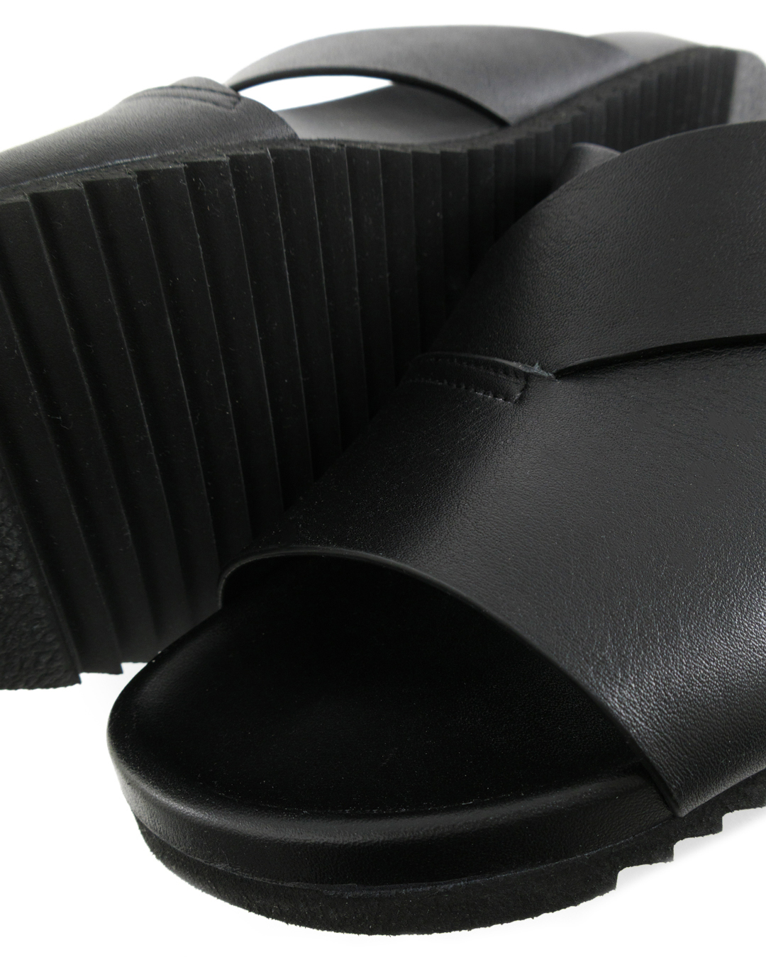 Эти шлёпанцы — квинтэссенция минимализма и функциональной эстетики, идеально подходящие для современного гардероба. Воплощённые в глубоком черном цвете, они излучают сдержанную элегантность и универсальность. Главной особенностью дизайна являются перекрещенные ремешки, создающие деликатное открытие и придавая обуви архитектурный акцент. Этот элемент добавляет динамики и визуальной интриги, благодаря чему шлёпанцы выглядят современно и стильно. Подошва с рельефным протектором обеспечивает отличное сцепление и комфорт при каждом шаге. Лаконичные линии конструкции подчёркивают утонченную простоту и приверженность качеству. Эти шлёпанцы идеально вписываются как в повседневные, так и в выходные образы, добавляя нотки стиля и изысканности, сочетая практичность с актуальным дизайном.