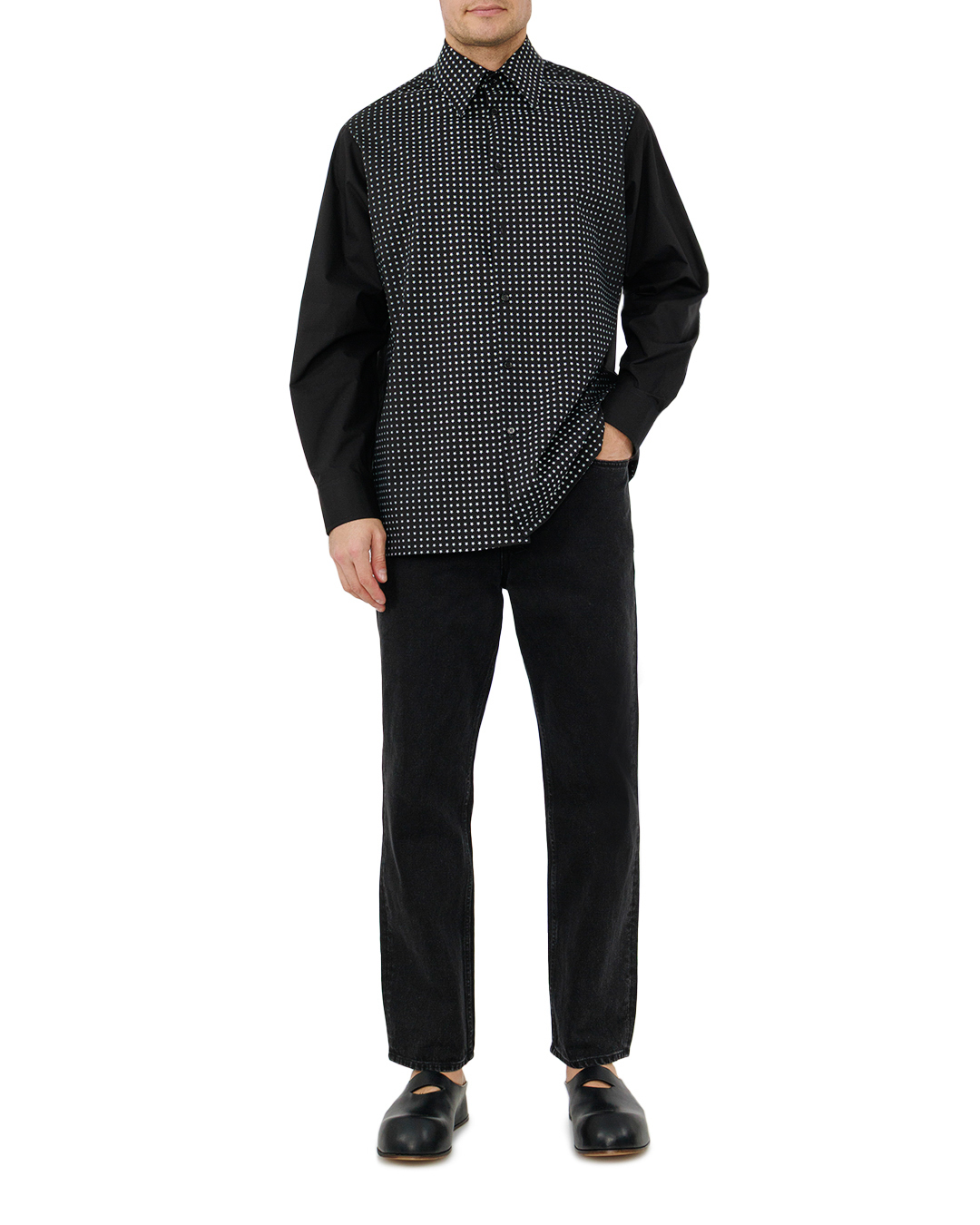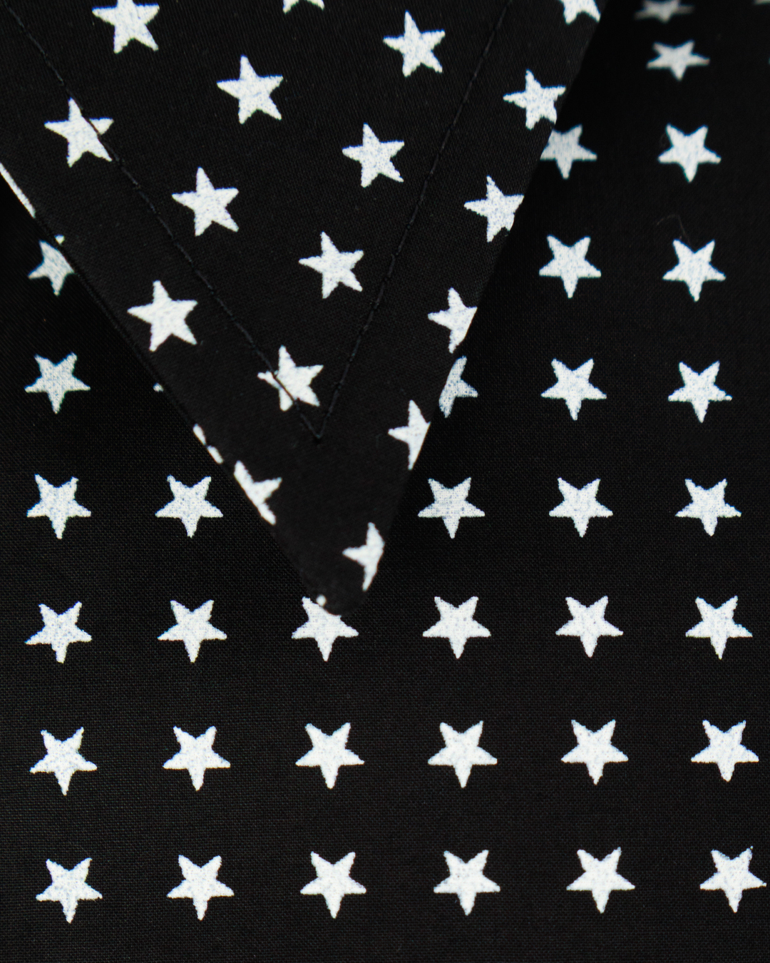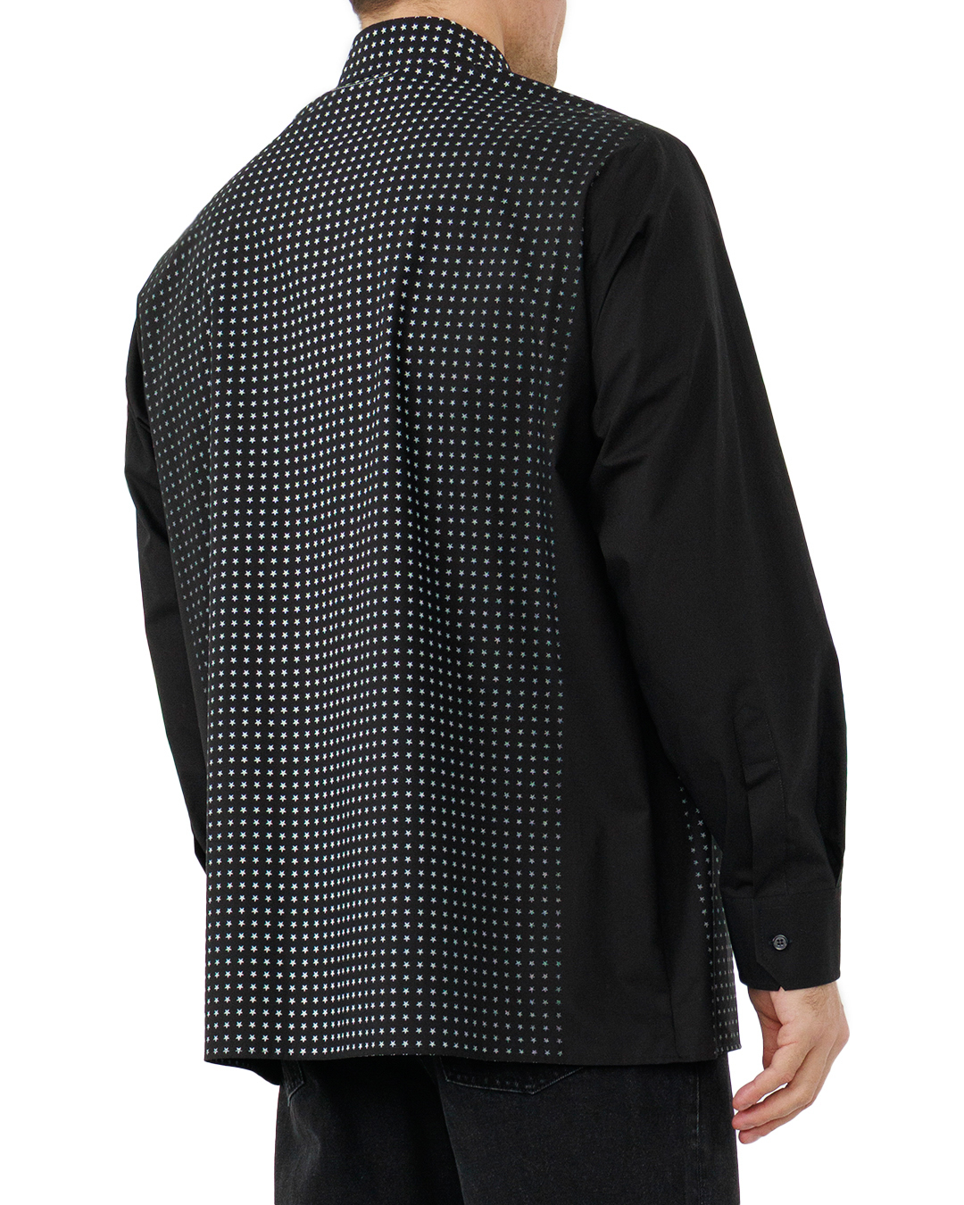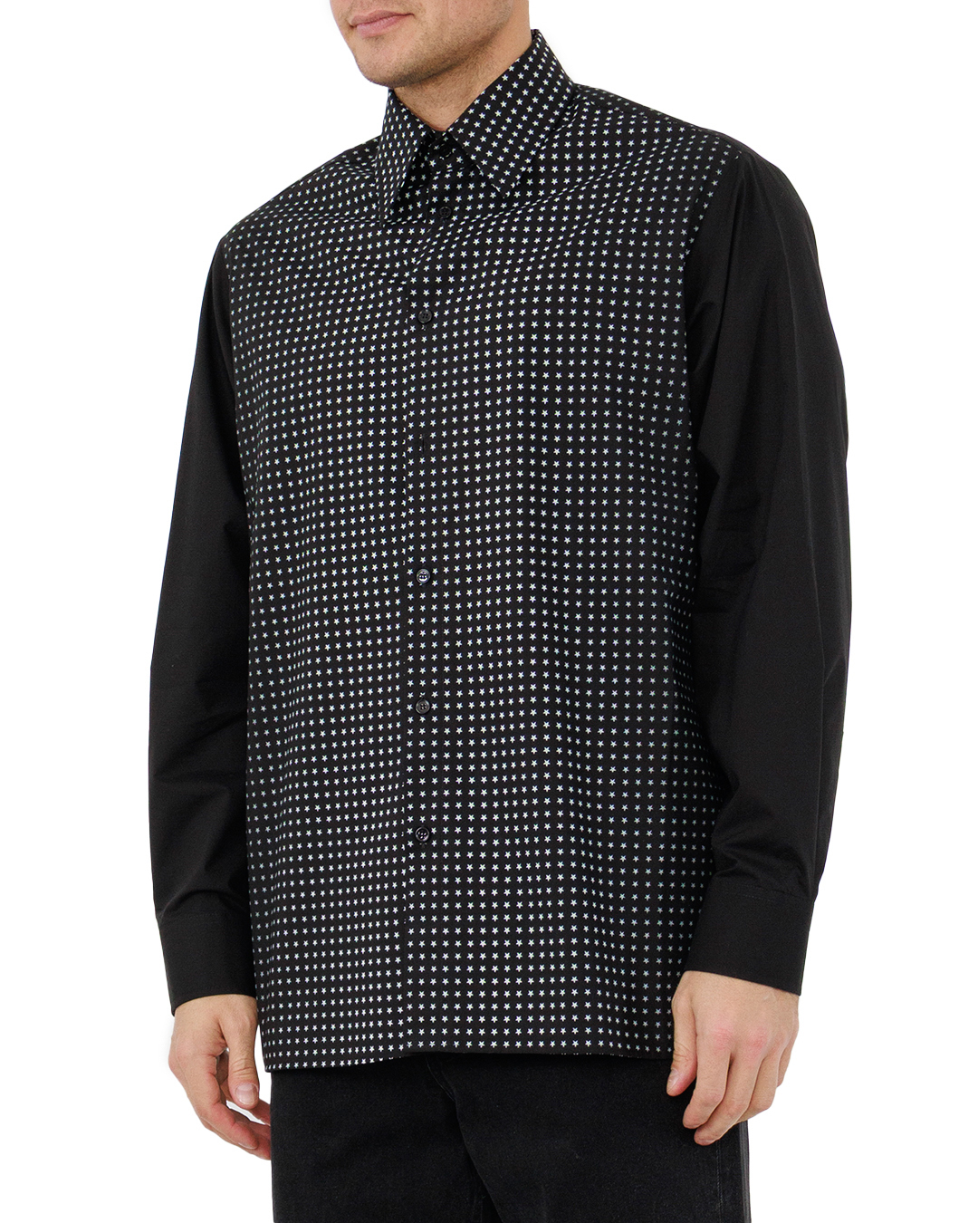 Эта рубашка — смелый пример современного дизайна с нотками классического шарма. Чёрное полотно украшено стильным узором в виде маленьких белых звёзд, добавляющим динамичности и оригинальности.  Выполненная из качественной и приятной на ощупь ткани, рубашка обеспечивает комфорт и элегантный внешний вид. Классический отложной воротник поддерживает строгую линию, создавая баланс между экстравагантностью и сдержанностью.  Точная обработка швов и манжет подчёркивает внимание к деталям и высокое качество исполнения. Центральная планка с аккуратными пуговицами подчёркивает лаконичность дизайна, позволяя сосредоточиться на ярком принте.  Эта рубашка идеально подойдёт для создания стильных образов в различных стилях — от smart-casual до вечерних выходов, открывая безграничные возможности для самовыражения.