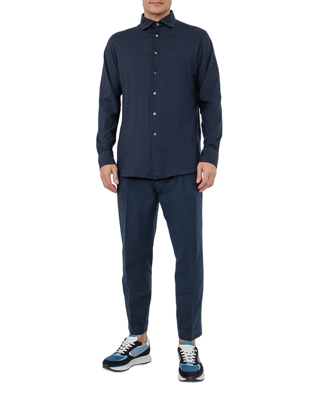 Эта рубашка в благородном тёмно-синем оттенке — воплощение минималистичной элегантности и утончённого стиля. Выполненная из легкого и мягкого материала, она обеспечивает максимальный комфорт и свободу движений. Классический воротник аккуратно оформляет линию шеи, придавая образу строгость и стиль. Центральная планка с пуговицами тон в тон поддерживает чистоту и целостность дизайна, создавая визуальную гармонию. Манжеты с пуговицами позволяют варьировать стиль, добавляя возможности для создания как строгих, так и более расслабленных образов. Безупречные швы подчеркивают высокое качество исполнения и внимание к деталям. Эта рубашка идеально подходит как для деловых встреч, так и для вечерних выходов, легко комбинируясь с брюками или джинсами, добавляя в каждый комплект нотку изысканности и уверенности.