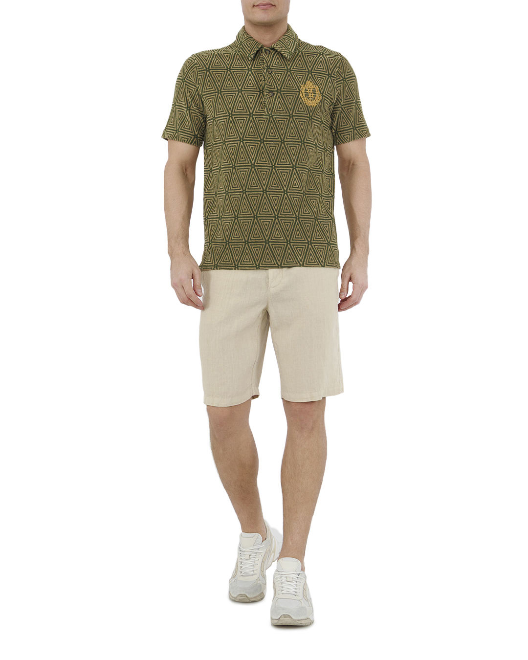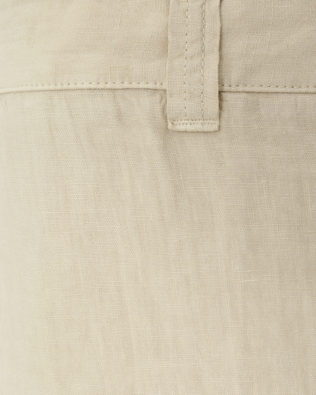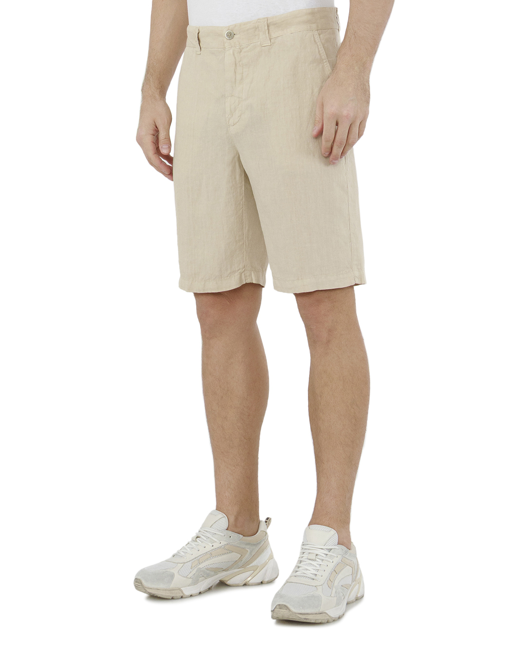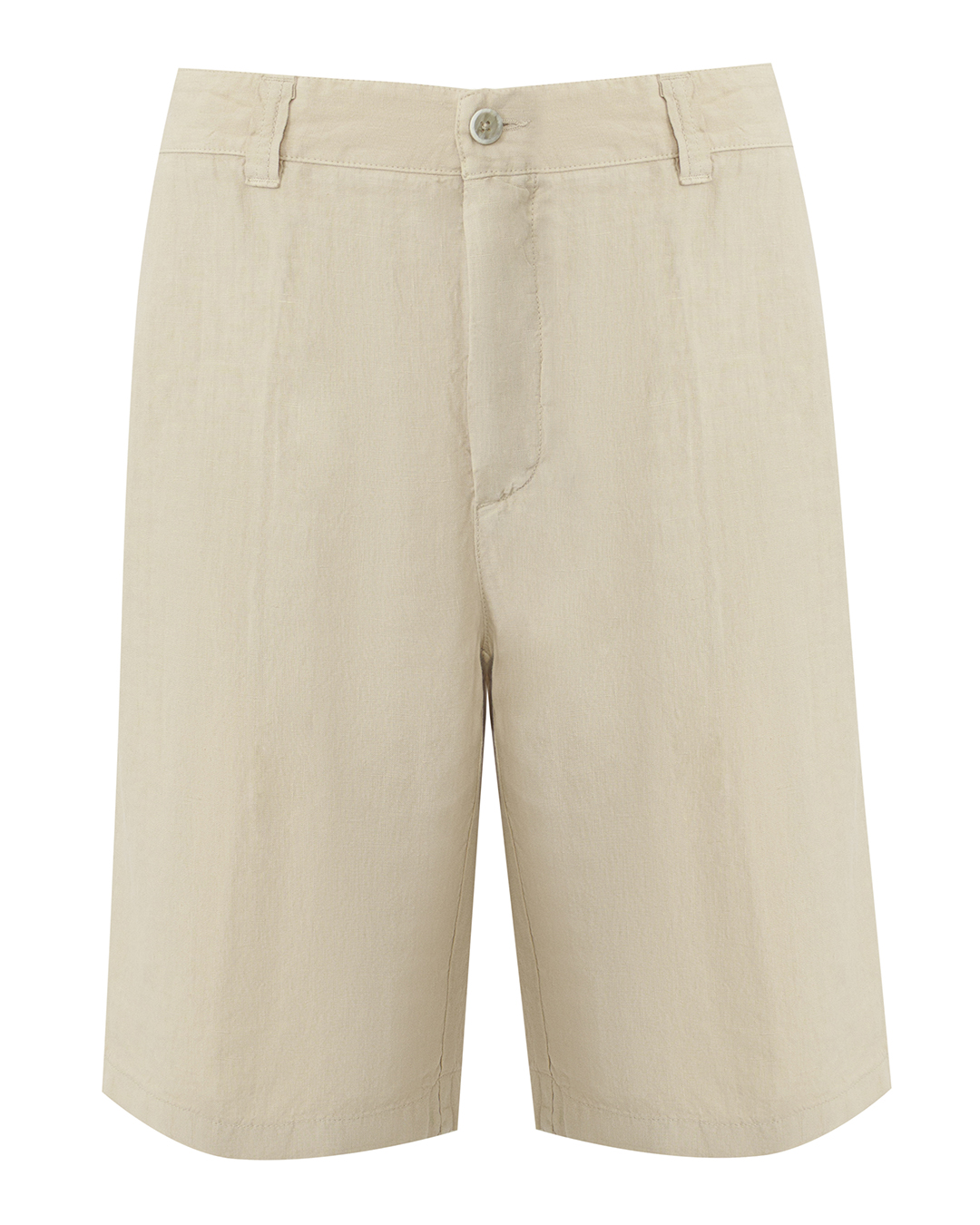 Лаконичный крой бежевых шортов универсальной длины до колена позаимствовали у классических брюк. Для пошива свободной модели использовали легкий фактурный лен, который хорошо пропускает воздух. Переплетение волокон разных оттенков создает деликатный меланжевый эффект.