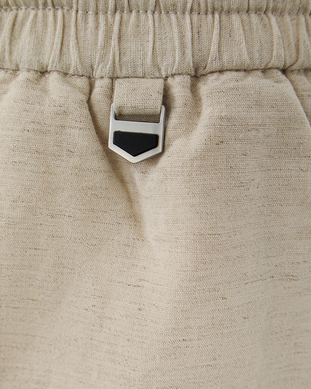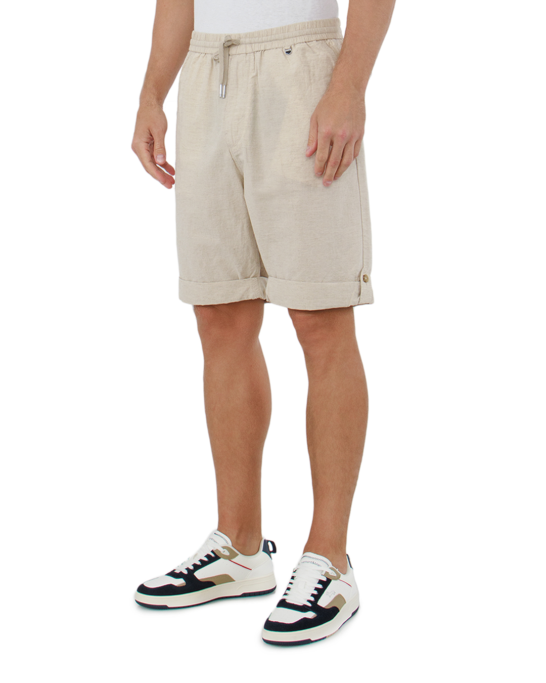 Эти шорты — квинтэссенция комфортного шика и утонченного кэжуал стиля. Светлый бежевый оттенок материализует свежесть и легкость, идеально подходя для летних гардеробов. Эластичный пояс с утягивающим шнурком адаптируется по фигуре, обеспечивая удобную и надежную посадку. Металлические оконцеватели на шнурках добавляют современный акцент и подчеркивают тонкие детали дизайна. Края штанин украшены стильными подворотами с пуговицами, выступая в роли изысканного элемента и добавляя гармоничности образу. Прямые линии кройа обеспечивают свободу движений и создают расслабленный силуэт. Ткань легкая и дышащая, что особенно важно в теплые дни. Эти шорты легко комбинируются с яркими топами или нейтральными рубашками, создавая множество возможностей для комфортабельных и стильных образов.