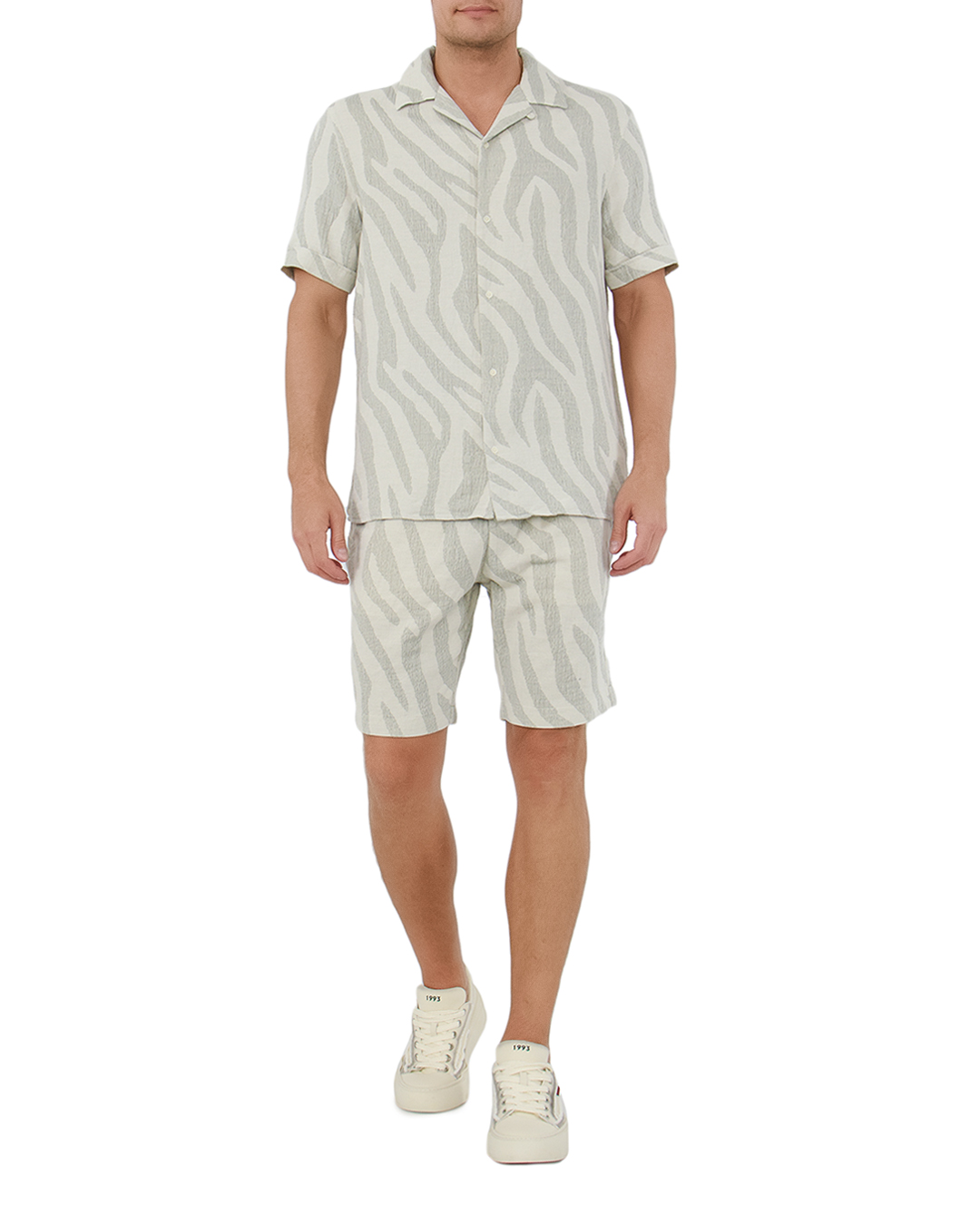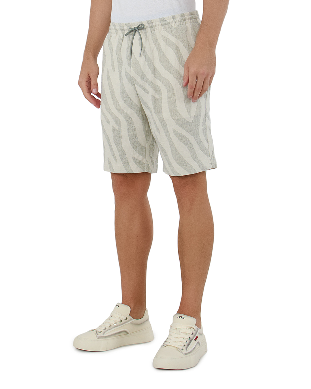 Эти шорты — воплощение смелого стиля и элегантного комфорта. Абстрактный узор, напоминающий дикие мотивы, в нейтральных оттенках создаёт динамичный и современный образ, идеально подходящий для модных экспериментов. Эластичный пояс с утягивающим шнурком обеспечивает индивидуальную посадку, подчеркивая внимание к функциональности. Металлические оконцеватели на шнурках добавляют изысканный акцент и современный лоск. Тактильная ткань с объемной текстурой обеспечивает уникальное ощущение комфорта и дышащие свойства, что делает эти шорты идеальными для теплого сезона. Прямые линии кроя предлагают свободу движений и создают расслабленный силуэт. Эти шорты эффектно комбинируются с однотонными футболками или легкими рубашками, позволяя создать стильный и выразительный летний образ, наполненный индивидуальностью и смелостью.