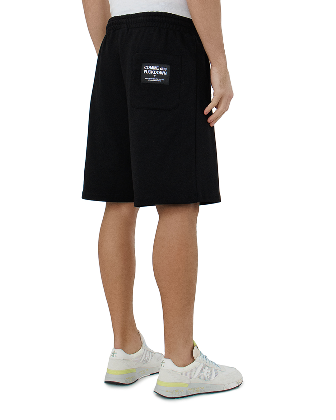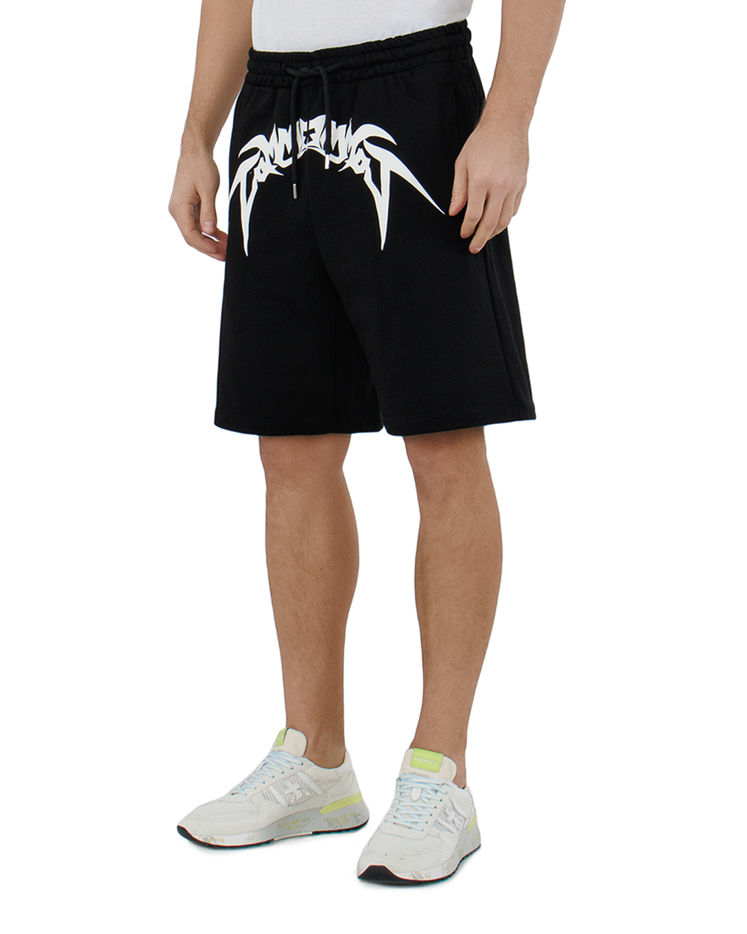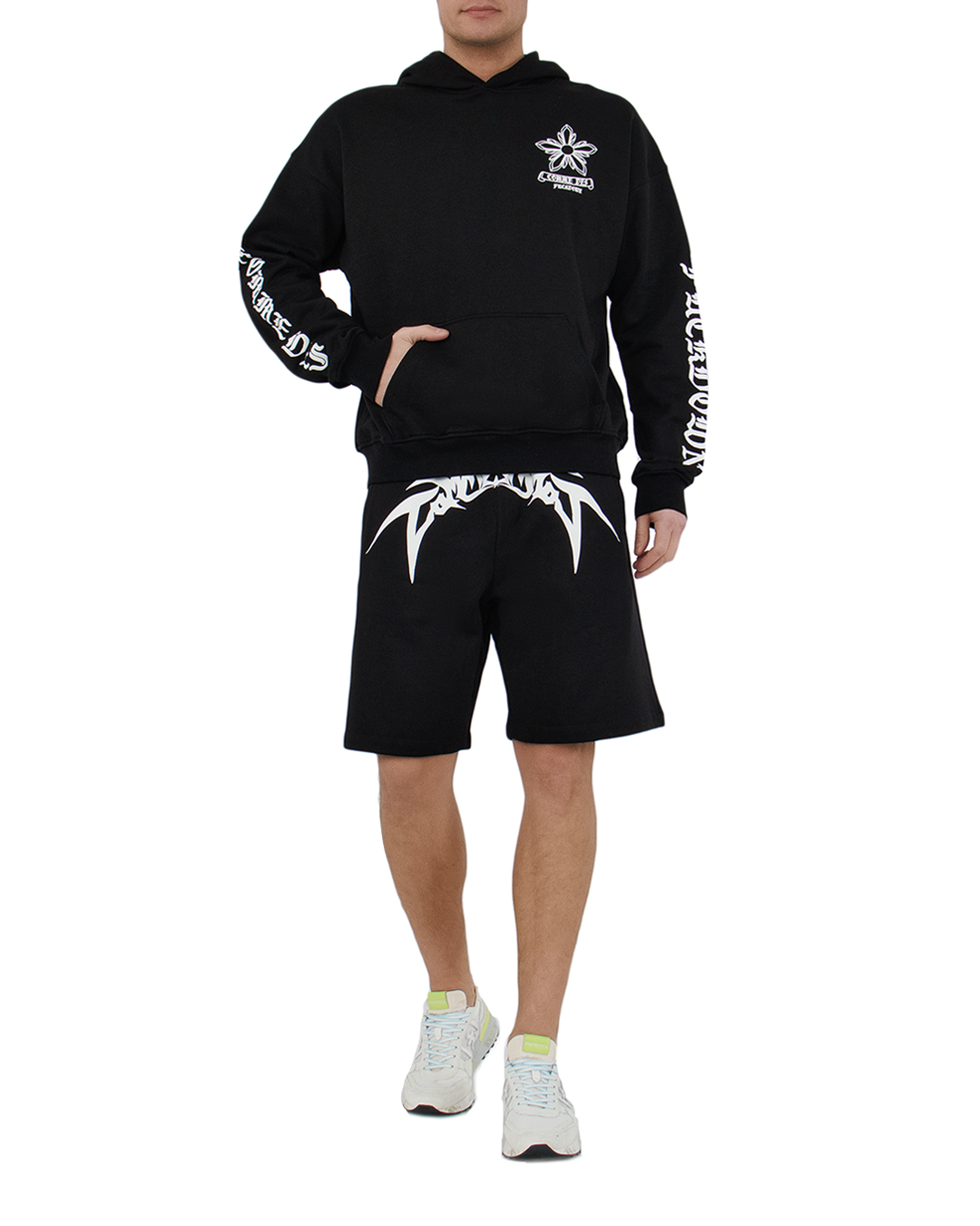 Для пошива черных шорт выбрали мягкий хлопковый трикотаж, хорошо пропускающий воздух. Модель с прорезными карманами украсили контрастным принтом в виде логотипа. Отрегулировать посадку изделия, не сковывающего движения, на талии позволяет шнур, продетый в эластичный пояс-кулиску.