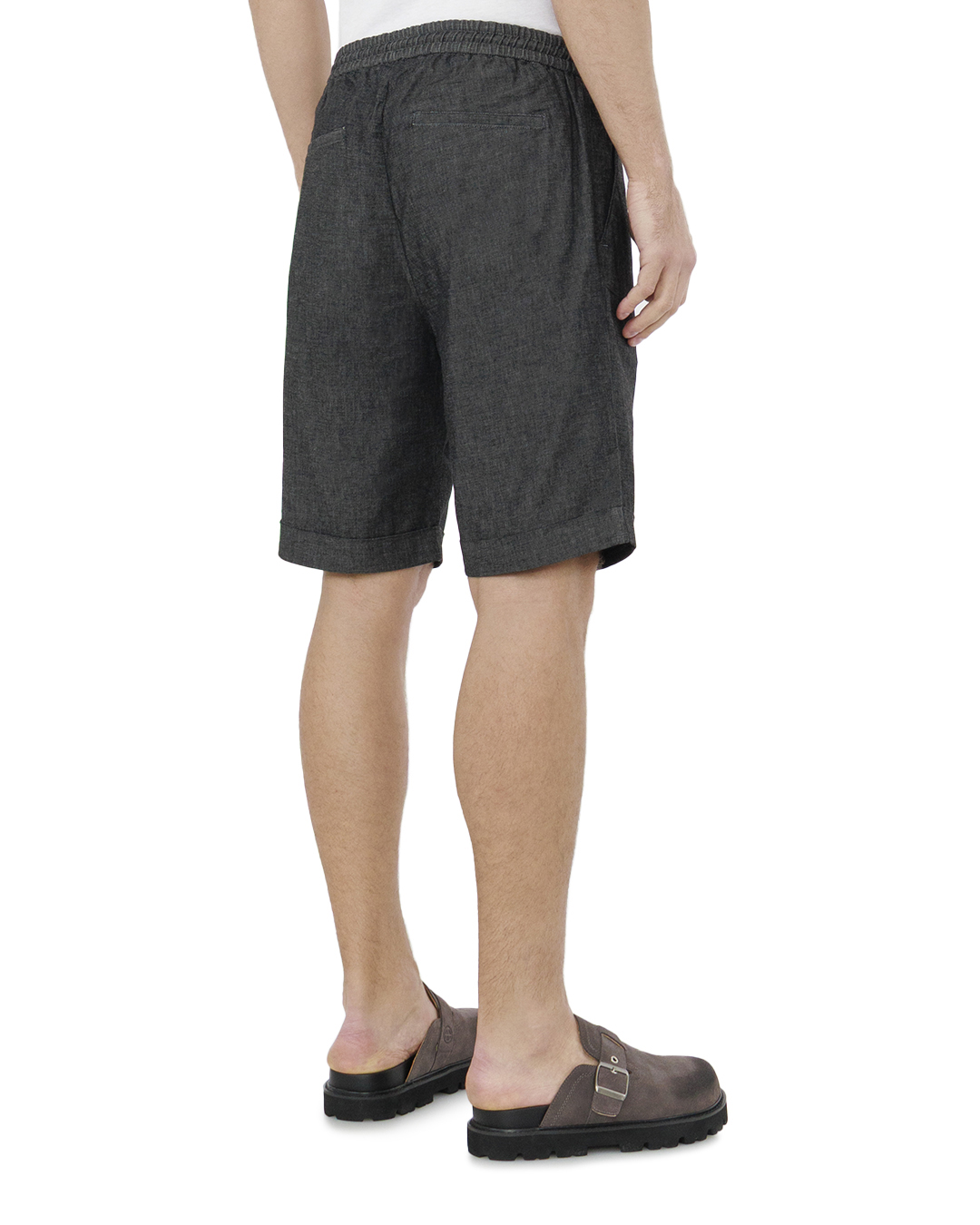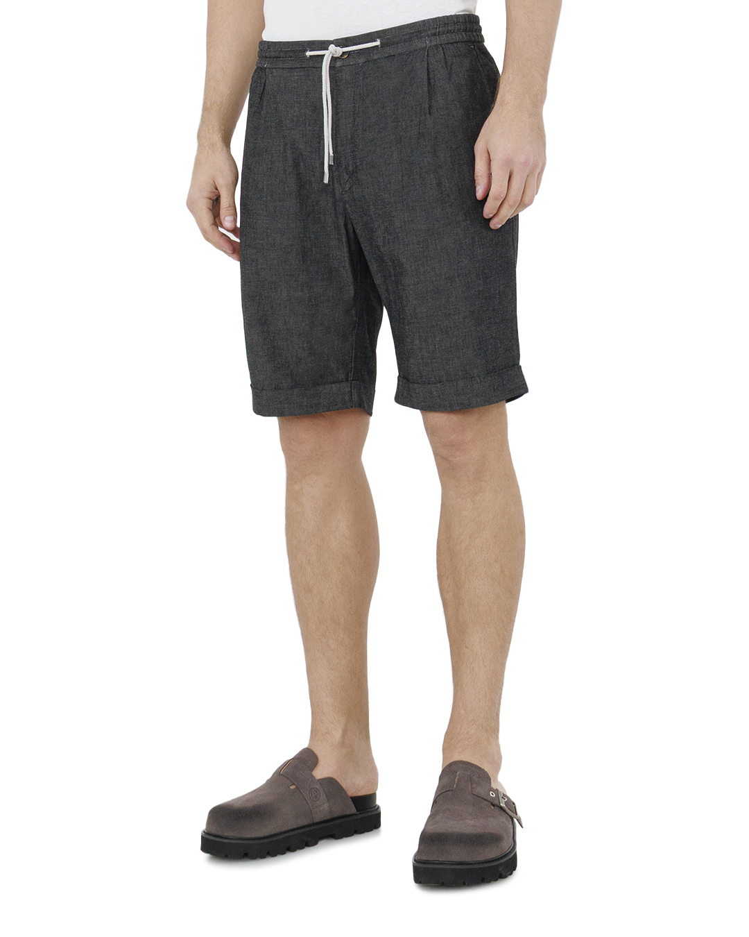 Эти шорты представляют собой современное воплощение непринужденной элегантности. Изготовленные из прочной и мягкой ткани тёмно-серого цвета, они создают эффект стильной универсальности, подходящей для разнообразных образов. Текстурированная поверхность материала добавляет глубину и визуальный интерес. Эластичный пояс снабжен контрастным шнурком, который служит не только функциональным элементом для регулировки посадки, но и стильным акцентом. Металлические наконечники на шнурке подчеркивают внимание к деталям и добавляют современный штрих. Продуманный крой с утонченными вытачками акцентирует внимание на чистом, структурированном силуэте, а подкрученные манжеты на подоле добавляют завершенности и чёткости линий. Эти шорты идеально сочетаются как с casual-футболками, так и с более формальными рубашками, позволяя вам экспериментировать с различными стилями. Это идеальный выбор для тех, кто ценит комфорт и стиль в повседневной одежде.