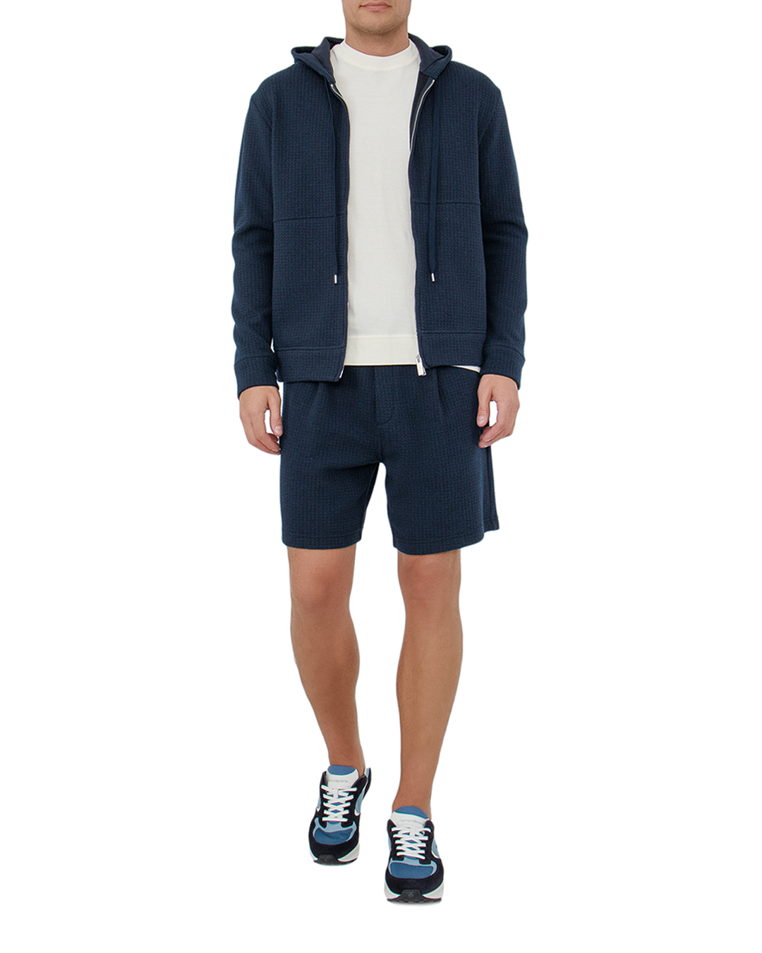 Эти шорты в синем оттенке олицетворяют атмосферу непринужденности и летнего стиля. Выполненные из легкого и дышащего материала, они обеспечивают комфорт даже в жаркие дни. Эластичный пояс дополнен шнурком, что позволяет регулировать посадку для идеального прилегания. Шлевки для ремня добавляют функциональности, позволяя дополнить образ стильными аксессуарами. Манжеты с подгибом создают аккуратный и завершённый вид, придавая шортам современный силуэт. Металлическое кольцо на поясе добавляет интересный акцент, внося элемент утилитарного стиля. Эти шорты станут отличным выбором для повседневных и пляжных образов, легко сочетаясь с футболками и легкими рубашками, создавая стильный и расслабленный летний аутфит.