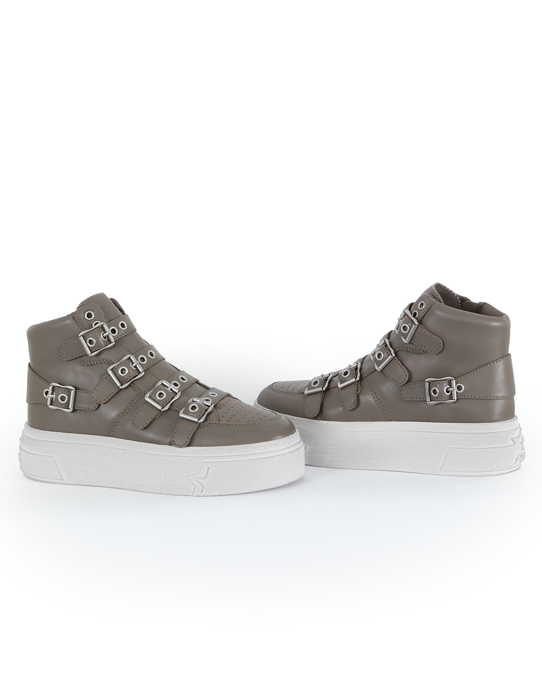 Кеды STARMOON BUCKLE — переосмысление классического дизайна кед Starmoon. Модель дополнена декоративными ремешками-застежками, которые придают ей бунтарства. Для удобства надевания на внутренней стороне кед расположена молния. Белая подошва с декоративными потертостями отсылает к streetwear эстетике.