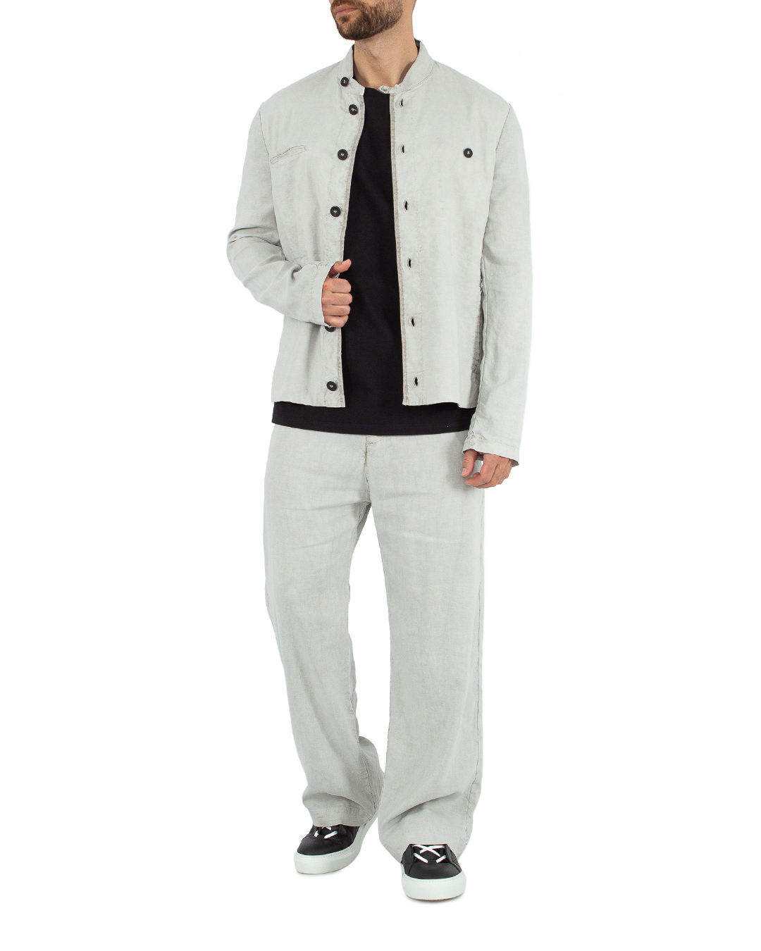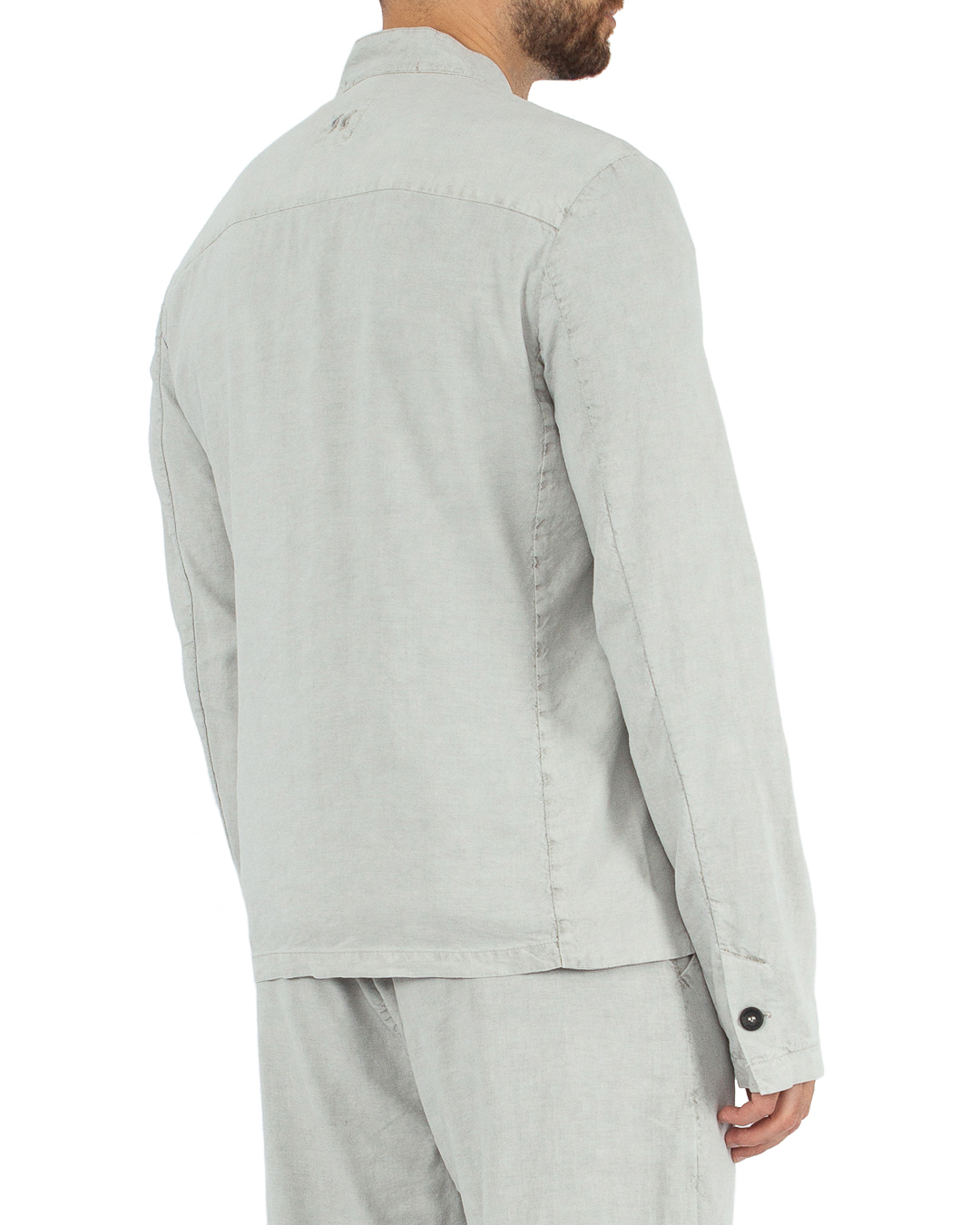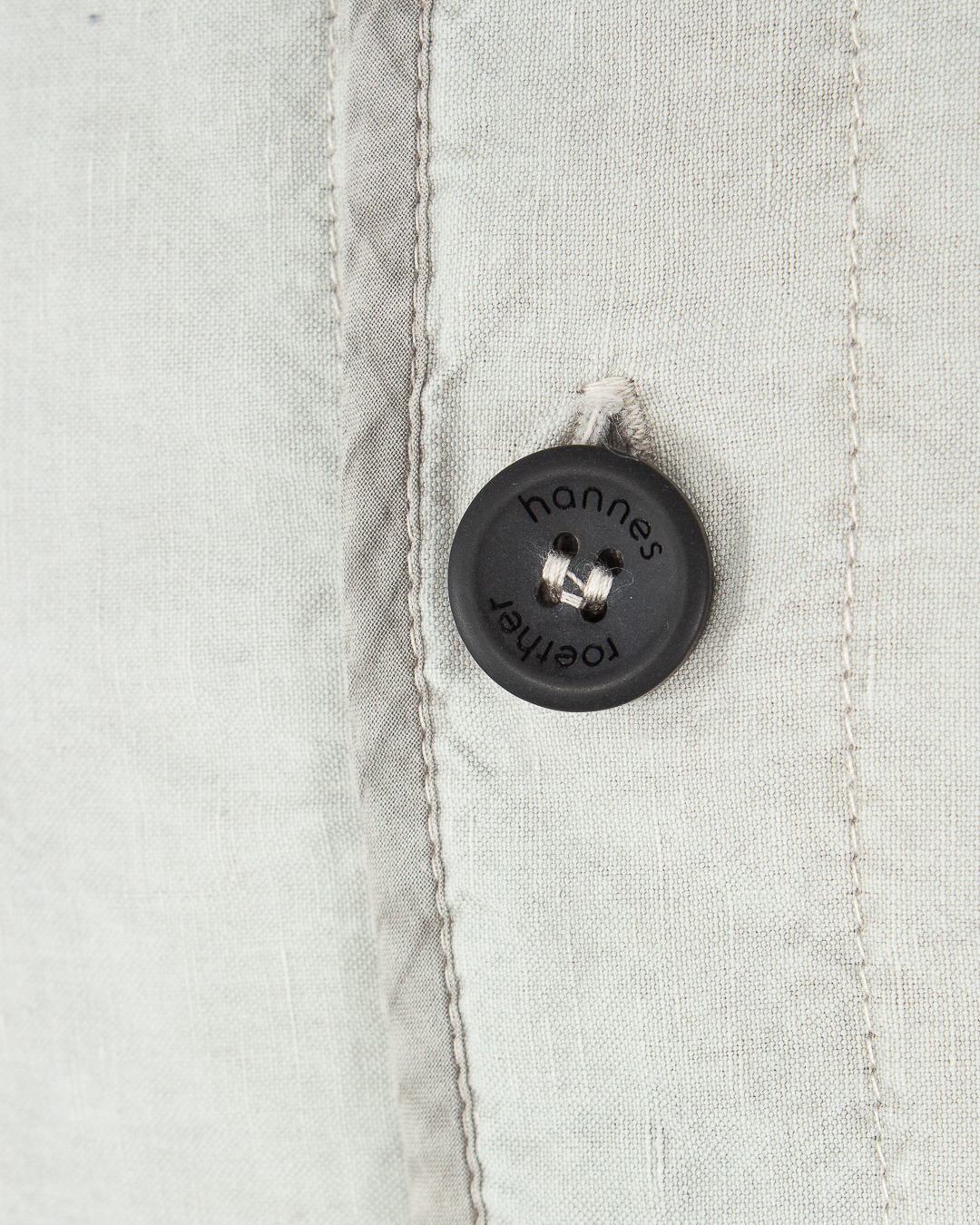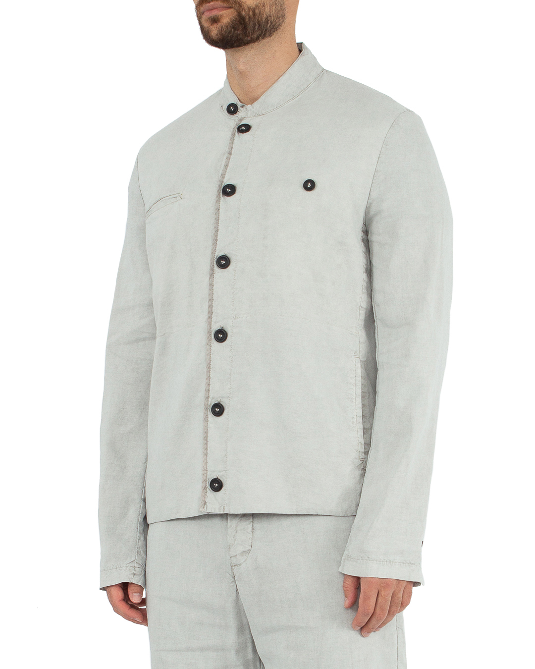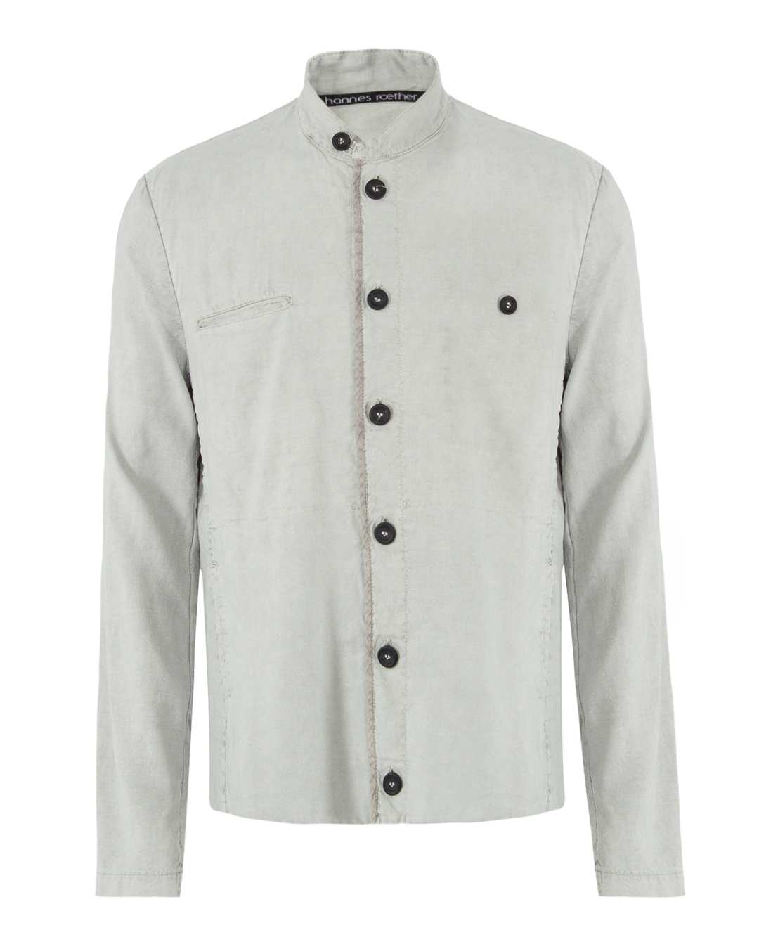 Рубашка Hannes Roether сшита из натурального льна с добавлением шелка светло-серого оттенка. Модель прямого силуэта с застежкой на пуговицы дополнена воротником-стойкой.