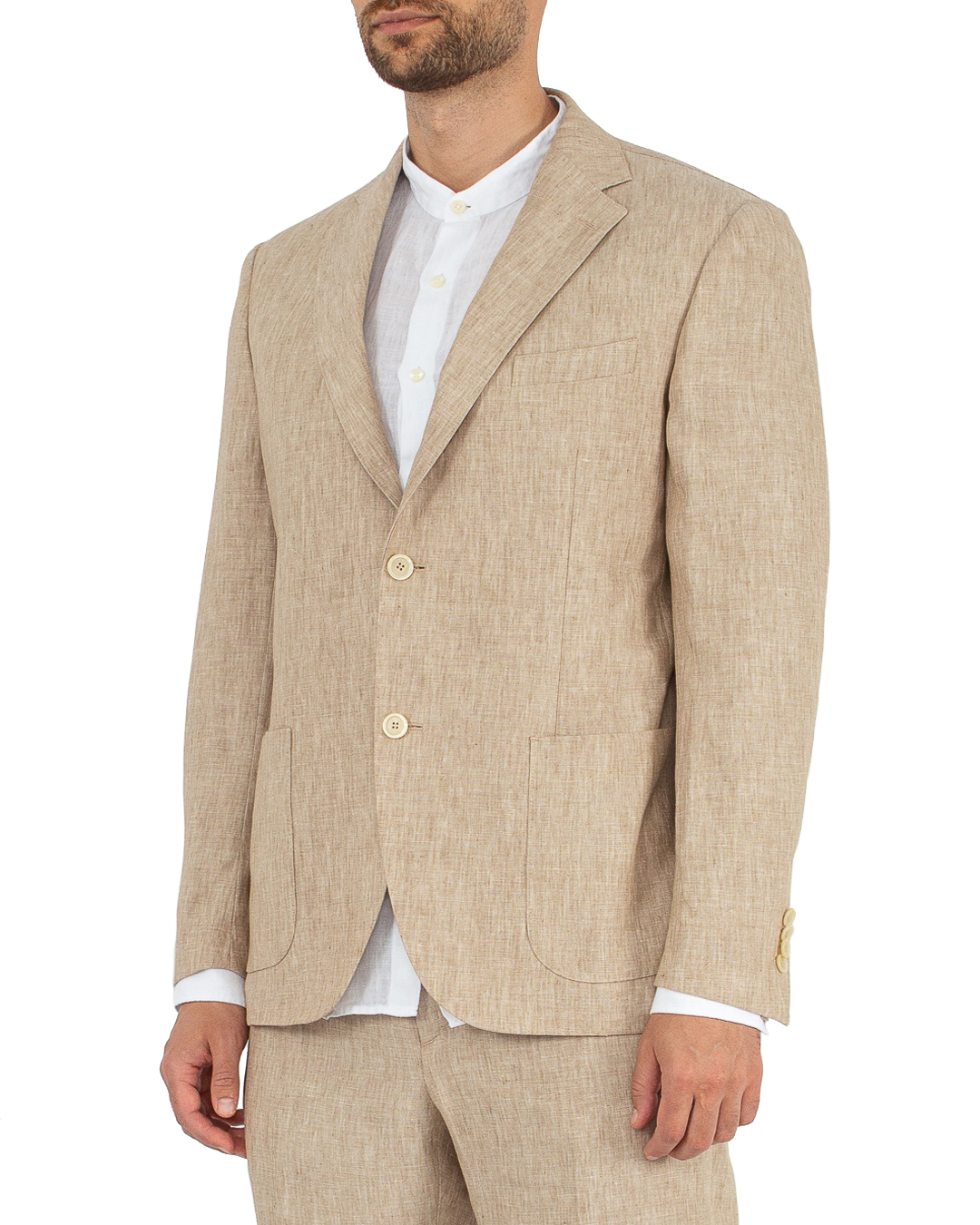 Однобортный пиджак с длинными рукавами, накладной листочкой, крупными накладными карманами, лацканами и отложным воротником, застежкой на пуговицы, шлицами сзади.