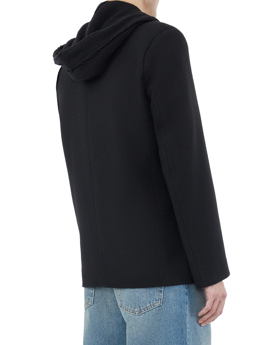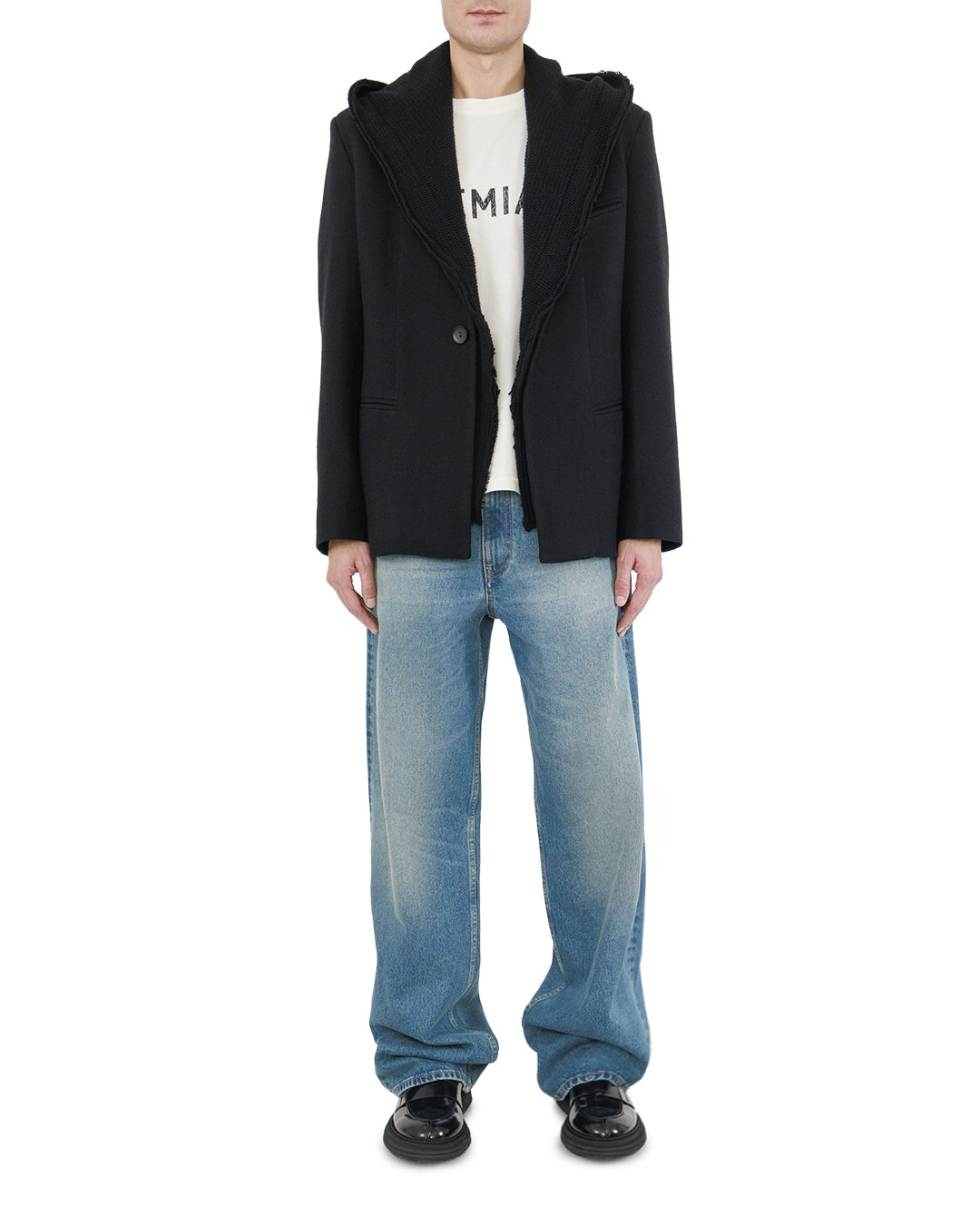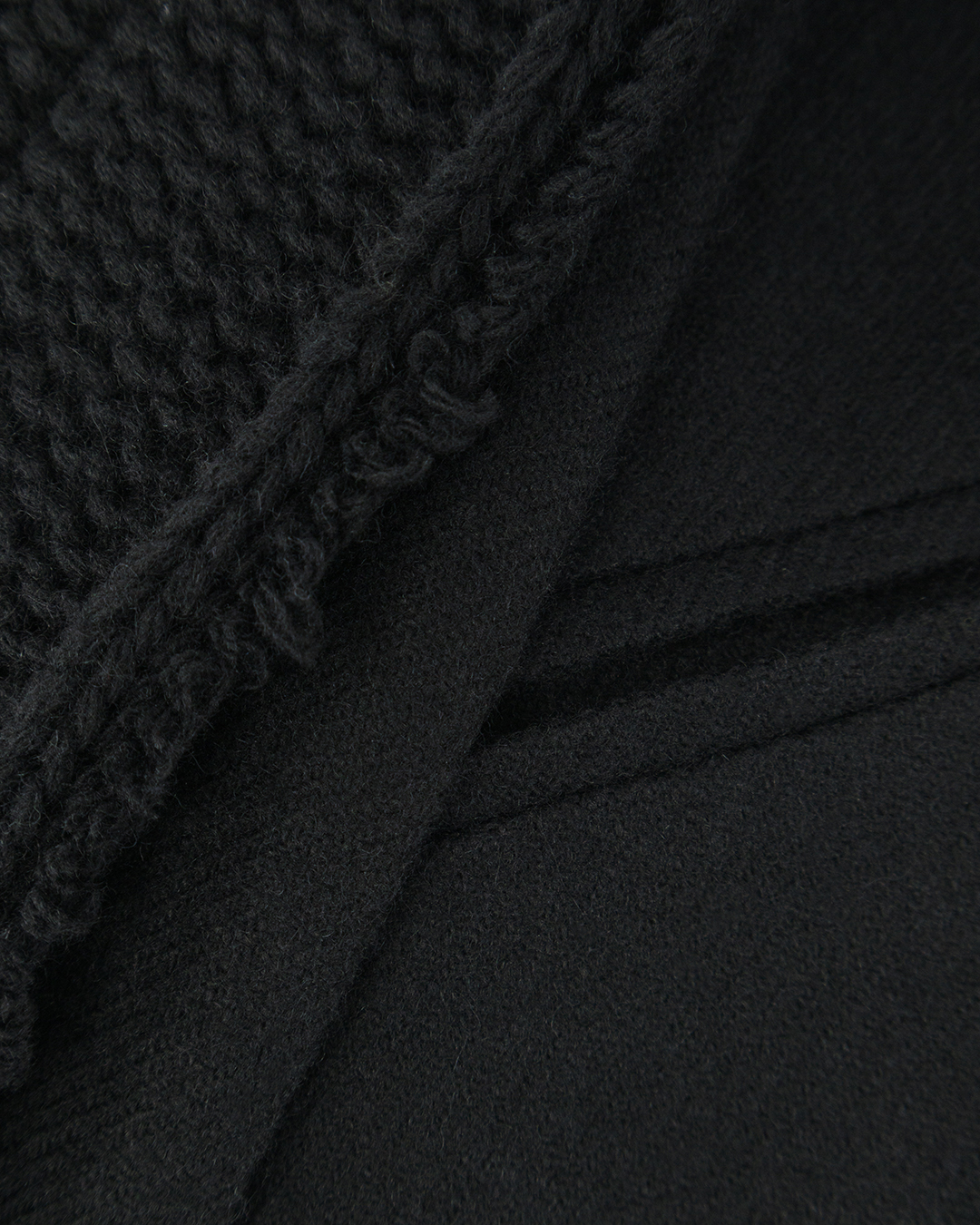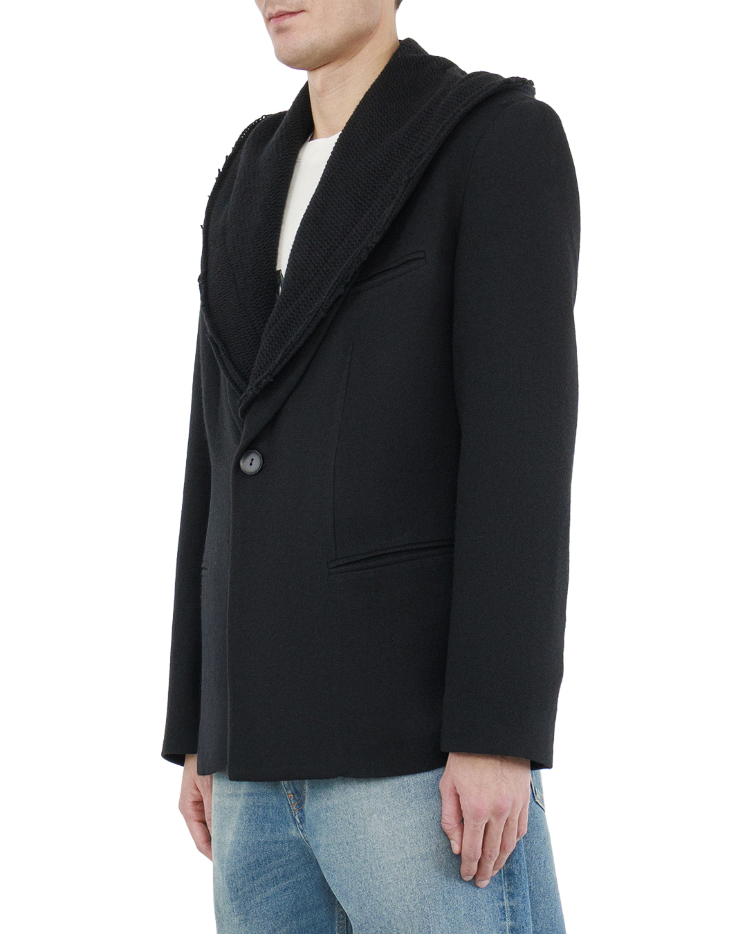 Этот жакет — воплощение безупречного стиля и изысканности с элементами современного дизайна. Созданный из высококачественной ткани глубокого черного цвета, он представляет собой идеальный баланс между классикой и инновациями. Главная деталь — выразительный лацкан, оформленный из текстурированной ткани, который придает изделию неожиданный и эффектный акцент. Такой дизайн создает объем и добавляет нотку авангарда, подчёркивая индивидуальность обладателя. Однобортная застежка с аккуратной пуговицей создает элегантную линию и подчеркивает строгость образа. Обманные карманы с клапанами и нагрудный карман врезаны аккуратно, добавляя функциональности и визуальной симметрии. Жакет полностью на подкладке, что обеспечивает комфортную посадку и добавляет внутреннее изящество. Это изделие станет центральным элементом гардероба, гармонично сочетая в себе функциональность и роскошь. Подходит для создания как деловых, так и более свободных образов, привнося в них шик и стиль.