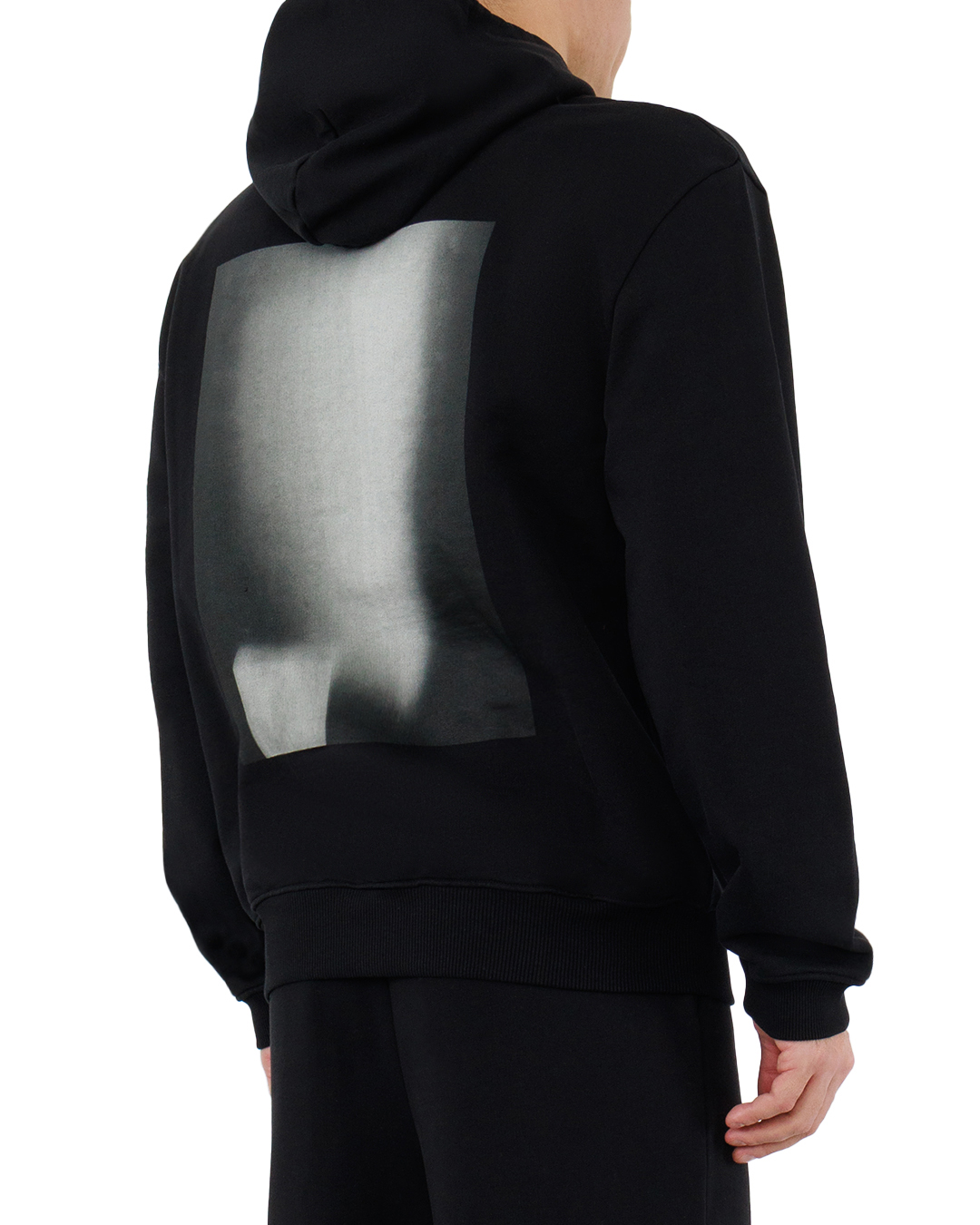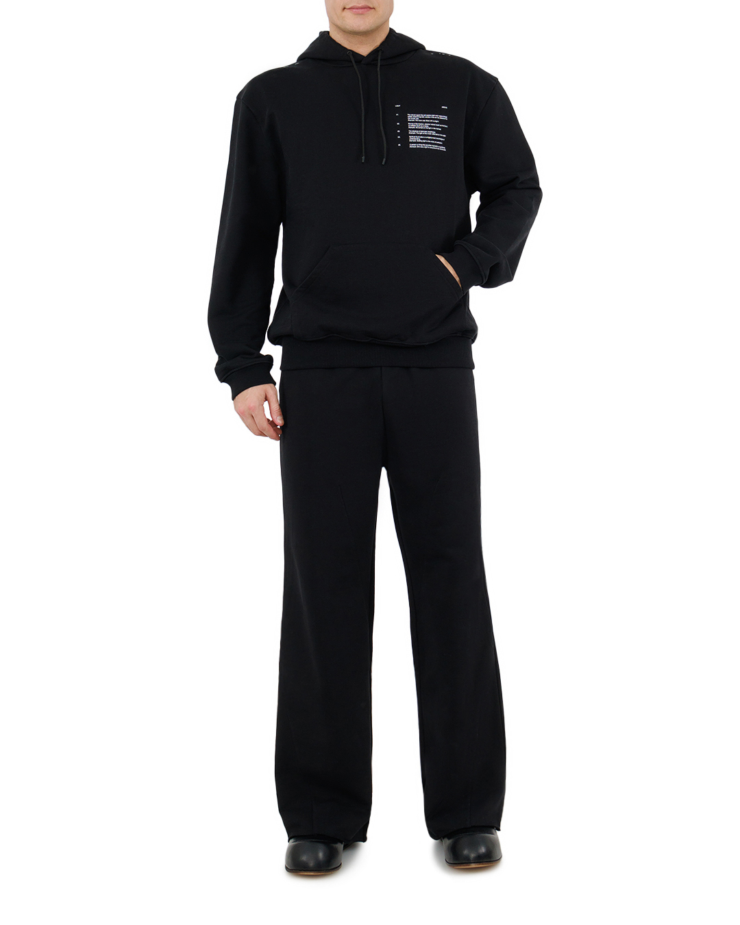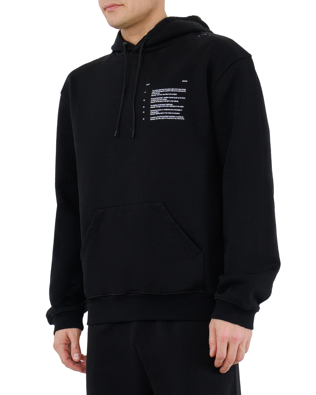 Это худи — идеальное сочетание комфорта и современного стиля, выполненное в насыщенном черном цвете. Изготовленное из мягкого и уютного трикотажа, оно обеспечивает тепло и комфорт, оставаясь при этом стильным элементом гардероба. Свободный крой и спущенные плечи создают расслабленный силуэт, идеально подходящий для создания модных повседневных образов. Капюшон с регулировочными шнурками добавляет практичности и защищает от непогоды, придавая изделию спортивный оттенок. Центральный карман «кенгуру» не только функционален, но и подчеркивает непринужденность дизайна. Неброский текстовый принт на груди добавляет индивидуальности и современности, создавая акцент на минималистичную эстетику. Манжеты и нижний край из эластичного рибана обеспечивают идеальную посадку и сохраняют форму, дополняя стильный и завершенный вид изделия. Это худи легко адаптируется к любому гардеробу, сочетаясь как с casual стилем, так и с современными трендами, предлагая множество вариантов для выражения вашего индивидуального стиля.