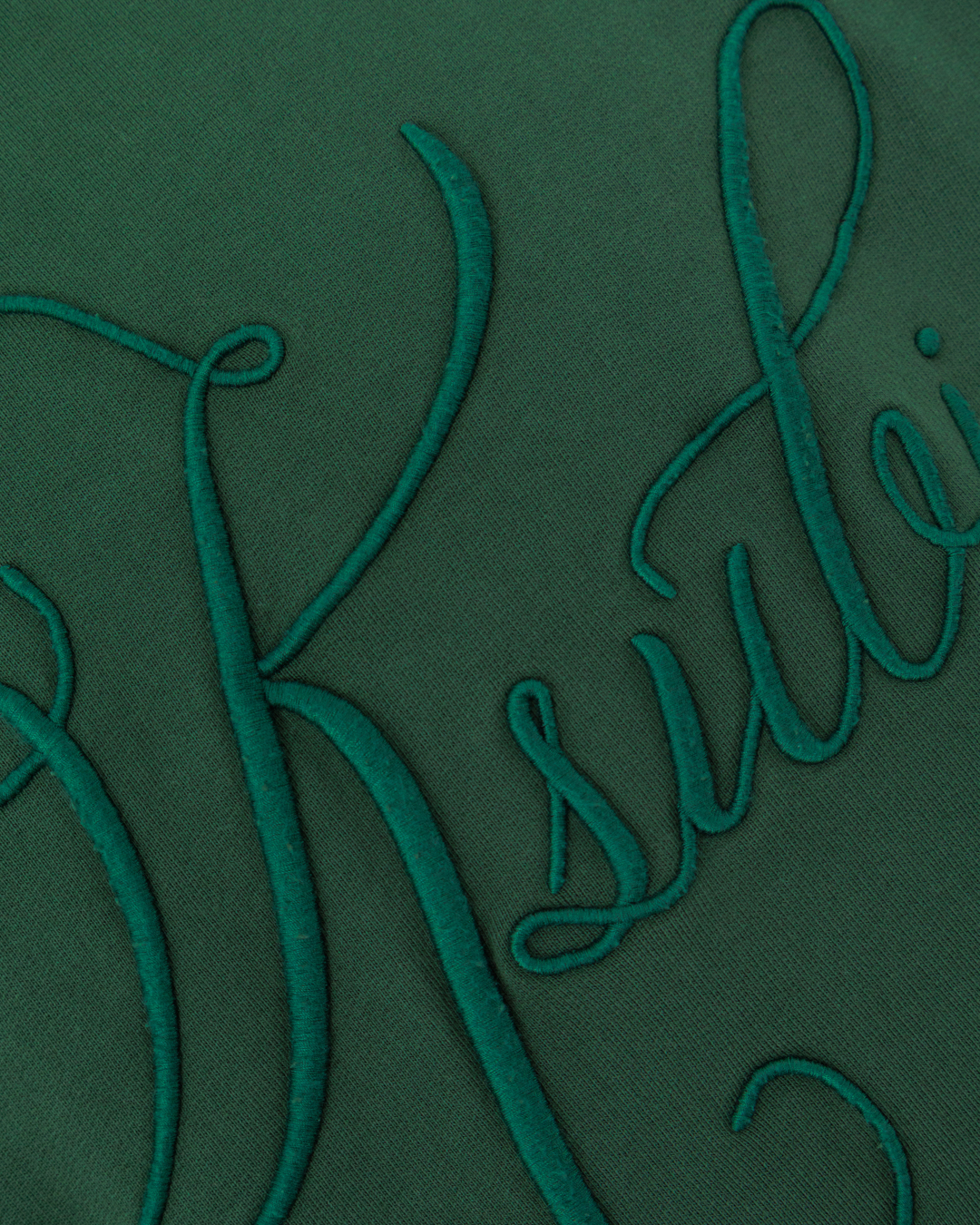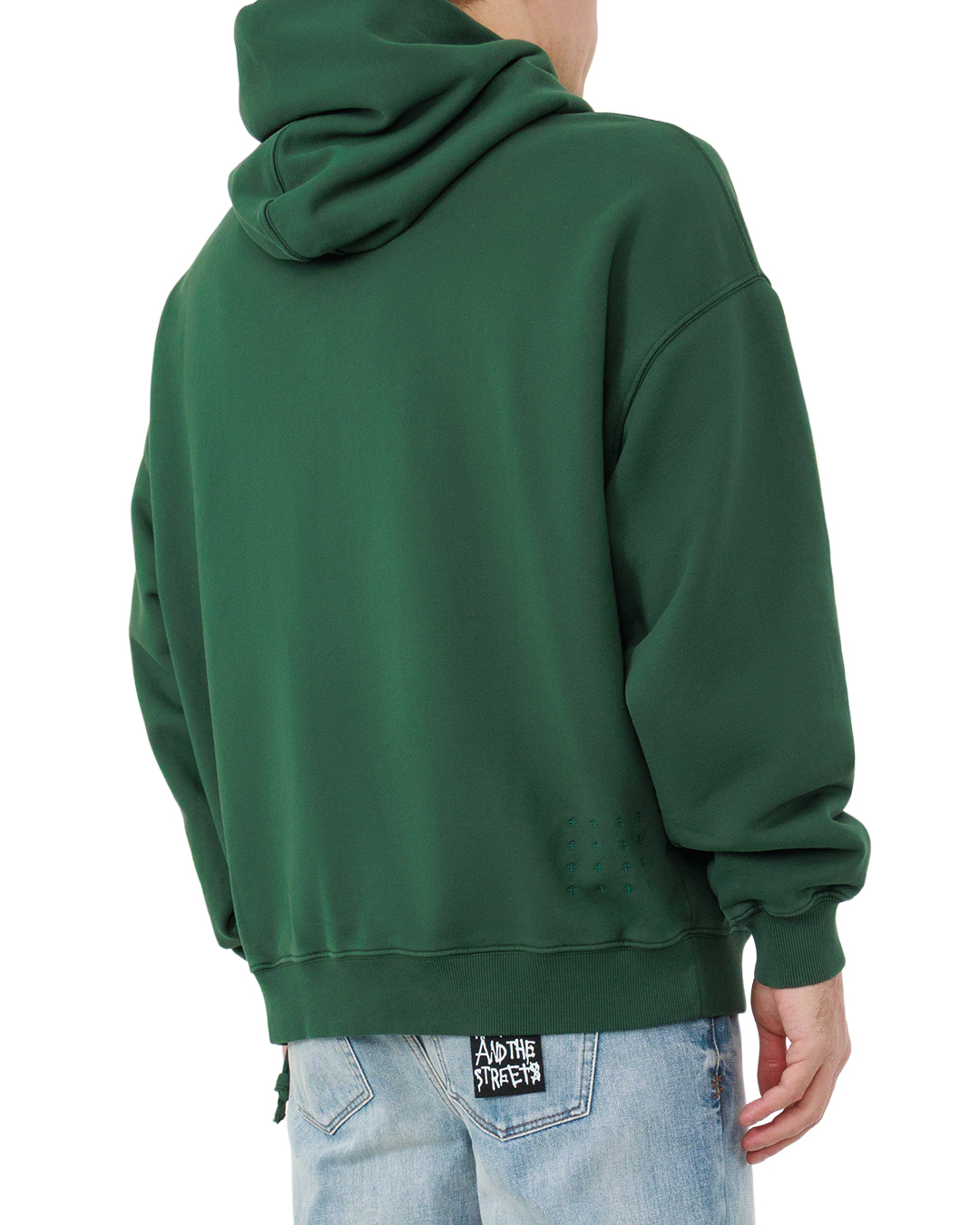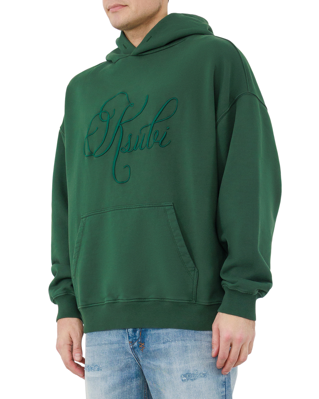 Это худи — воплощение утончённой лаконичности. Глубокий зелёный оттенок полотна создаёт насыщенный, но не кричащий фон, а изысканный каллиграфический акцент на груди придаёт вещи нотку аристократичности. Свободный, слегка оверсайз крой подчёркивает современность модели, формируя расслабленный, но чёткий силуэт. Объёмный капюшон с мягкими линиями добавляет уюта, а вместительный карман-кенгуру становится практичной деталью образа. Манжеты и пояс выполнены из эластичной резинки, обеспечивающей плотную посадку без скованности. Отделка швов безупречна: строчки ровные, подгибы аккуратные, без торчащих нитей. Такая вещь легко становится центром стильного ансамбля, сочетая в себе комфорт и элегантность.