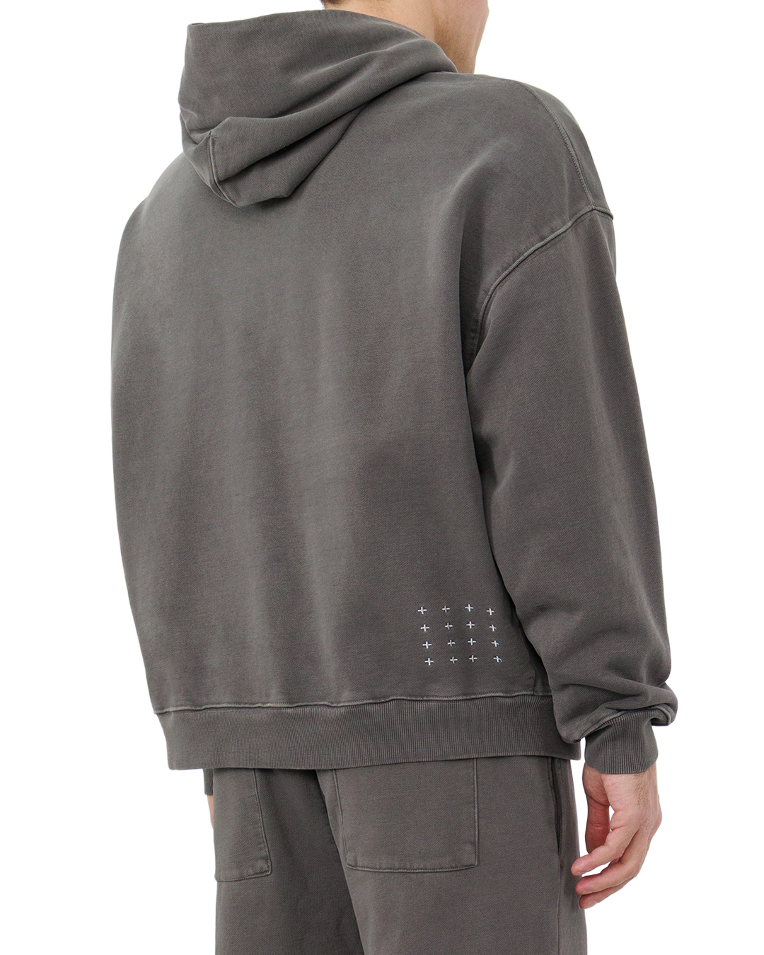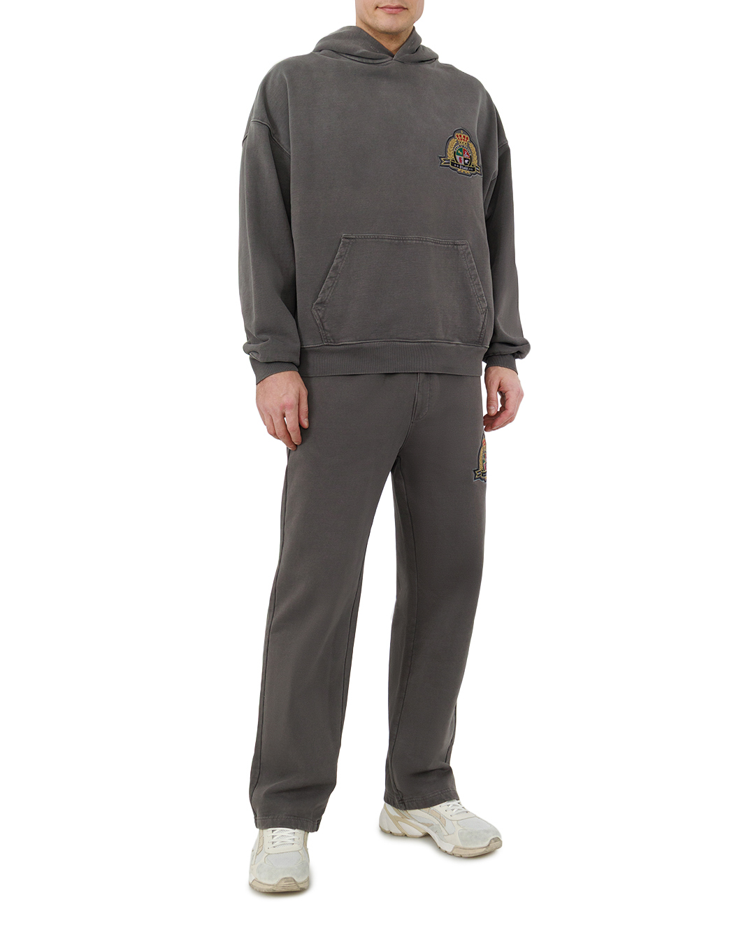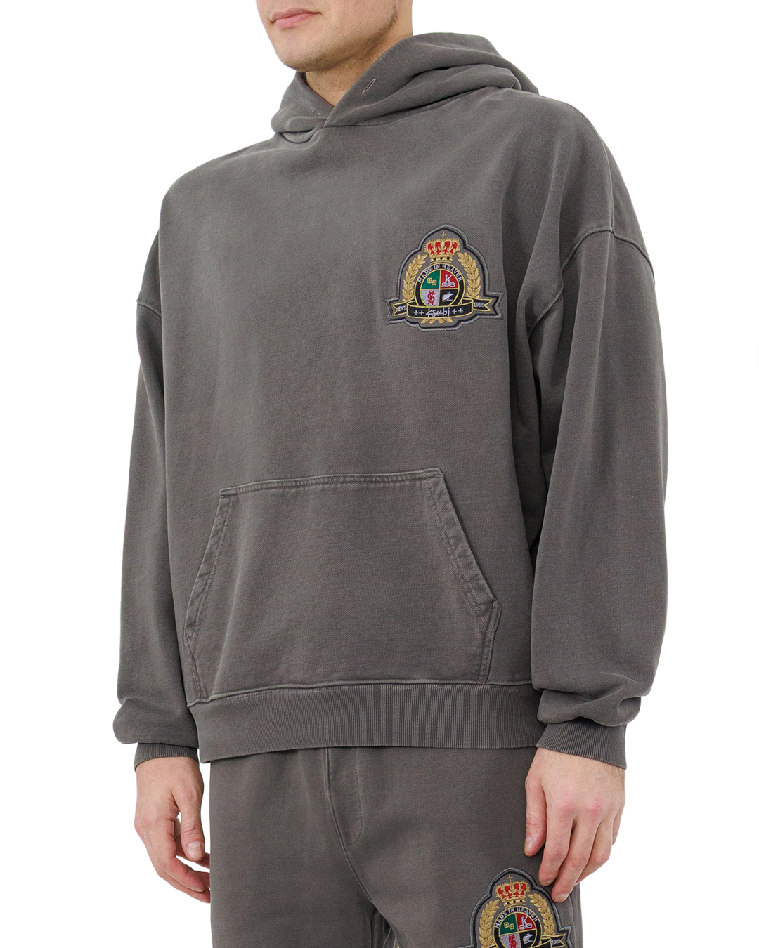 Это худи — воплощение сдержанной утончённости. Глубокий серо-угольный оттенок полотна создаёт благородный, неброский фон, а вышитый герб на груди добавляет вещи аристократичности и индивидуальности. Свободный крой с лёгкими опущенными плечами подчёркивает современность модели, формируя расслабленный, но структурированный силуэт. Объёмный капюшон с мягкими линиями придаёт уюта, а вместительный карман-кенгуру становится практичной деталью образа. Манжеты и пояс выполнены из плотной резинки в рубчик, обеспечивающей комфортную посадку без стеснения движений. Отделка швов безупречна: строчки ровные, подгибы аккуратные, вышивка чёткая, без изъянов. Такая вещь легко становится центром стильного ансамбля, сочетая в себе комфорт и элегантность.