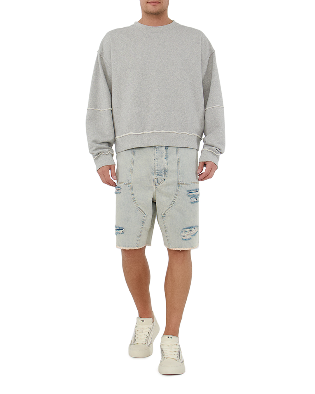 Этот свитшот — образец сдержанной элегантности и комфорта. Нежный серый оттенок создает ощущение лёгкости и универсальности, легко вписываясь в любой гардероб. Мягкая текстура ткани обеспечивает комфортное прилегание к телу, а свободный крой дарит непринужденность и расслабленность. Круглый ворот с трикотажной отделкой дополняет образ утонченной простоты. Декоративные швы, подчёркивающие линию плеч и рукавов, добавляют тонкую текстурную деталь, создавая визуальную динамику. Эластичные манжеты и подол аккуратно фиксируют форму, придавая модели завершенность. Этот свитшот можно комбинировать как с классическими брюками для создания делового образа, так и с джинсами или спортивными штанами для более расслабленного стиля.