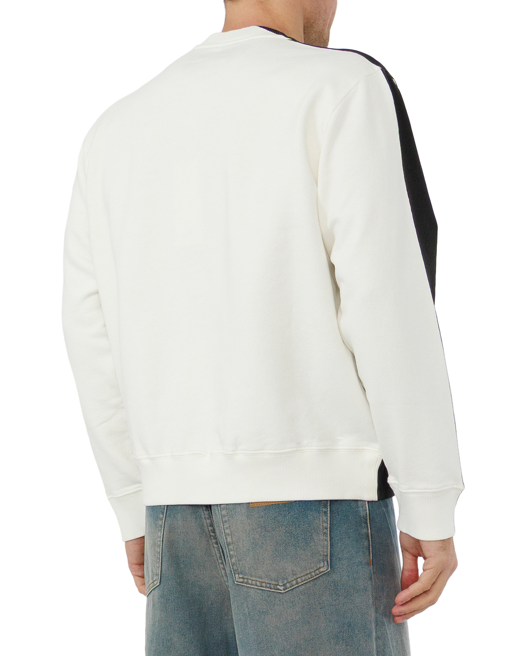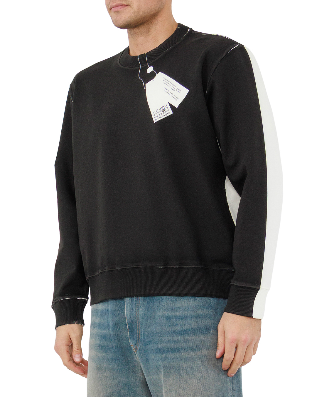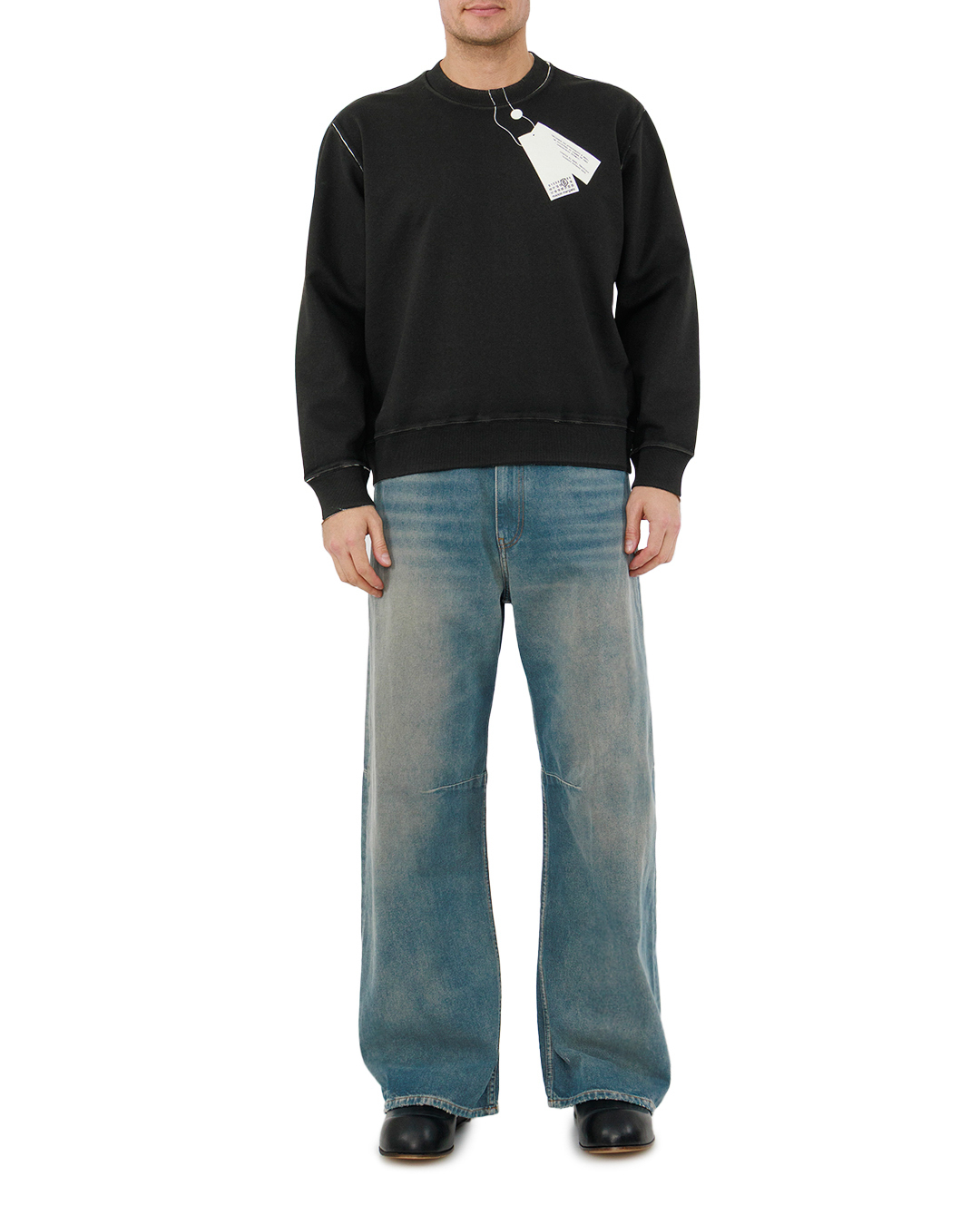 Этот свитшот — воплощение утончённого минимализма и современного стиля. Глубокий черный цвет подчеркивает универсальность и элегантность, делая его подходящим для любого гардероба. Материал свитшота — высококачественный хлопковый трикотаж, который обеспечивает комфорт и сохраняет форму. Прямой крой гарантирует свободу движений и прекрасно вписывается в повседневные образы. Особое внимание привлекают изящные детали отделки: контрастные швы добавляют визуальную структуру и акцентируют линии изделия. Это простое, но выразительное решение создает стильный акцент, не перетягивая внимание на себя. Ворот и манжеты выполнены в рубчик, обеспечивая отличную посадку и придавая завершенность общему виду. Аккуратная бирка на плече добавляет интересный дизайнерский элемент, подчеркивая концептуальность модели. Этот свитшот станет идеальной основой для стильного образа, идеально сочетаясь с джинсами или более формальными брюками для создания эффекта расслабленной элегантности.